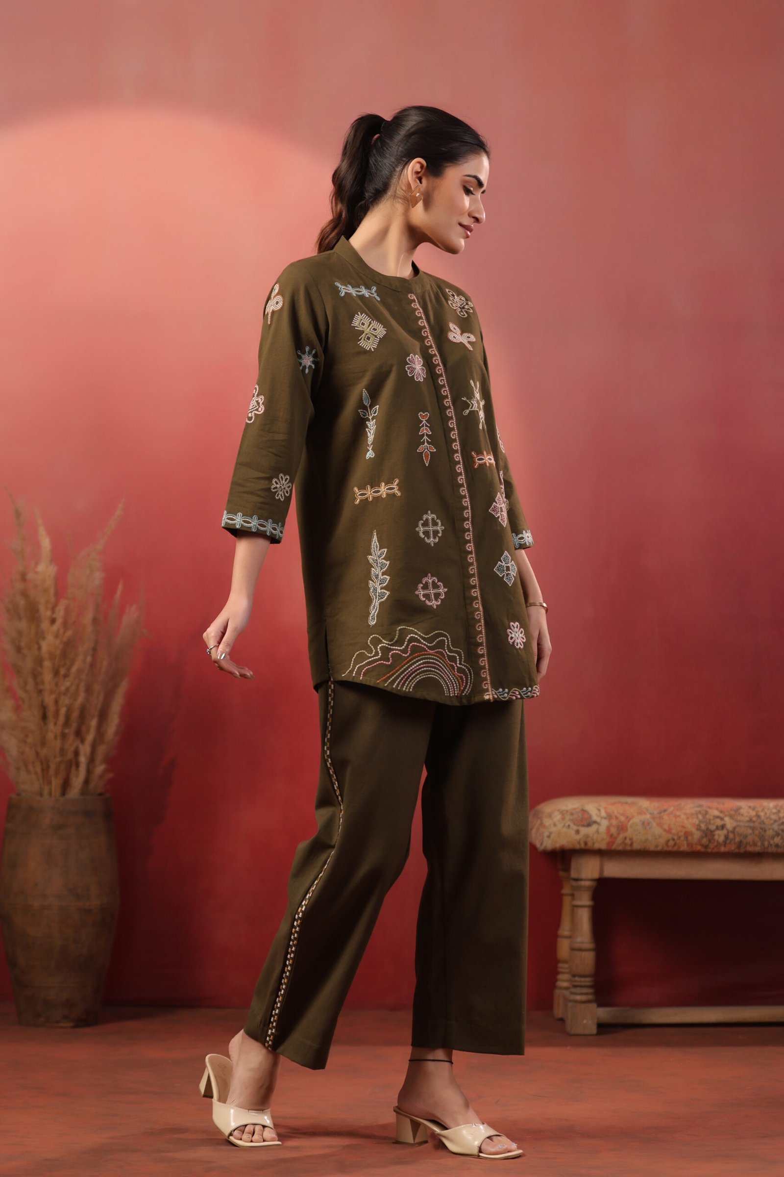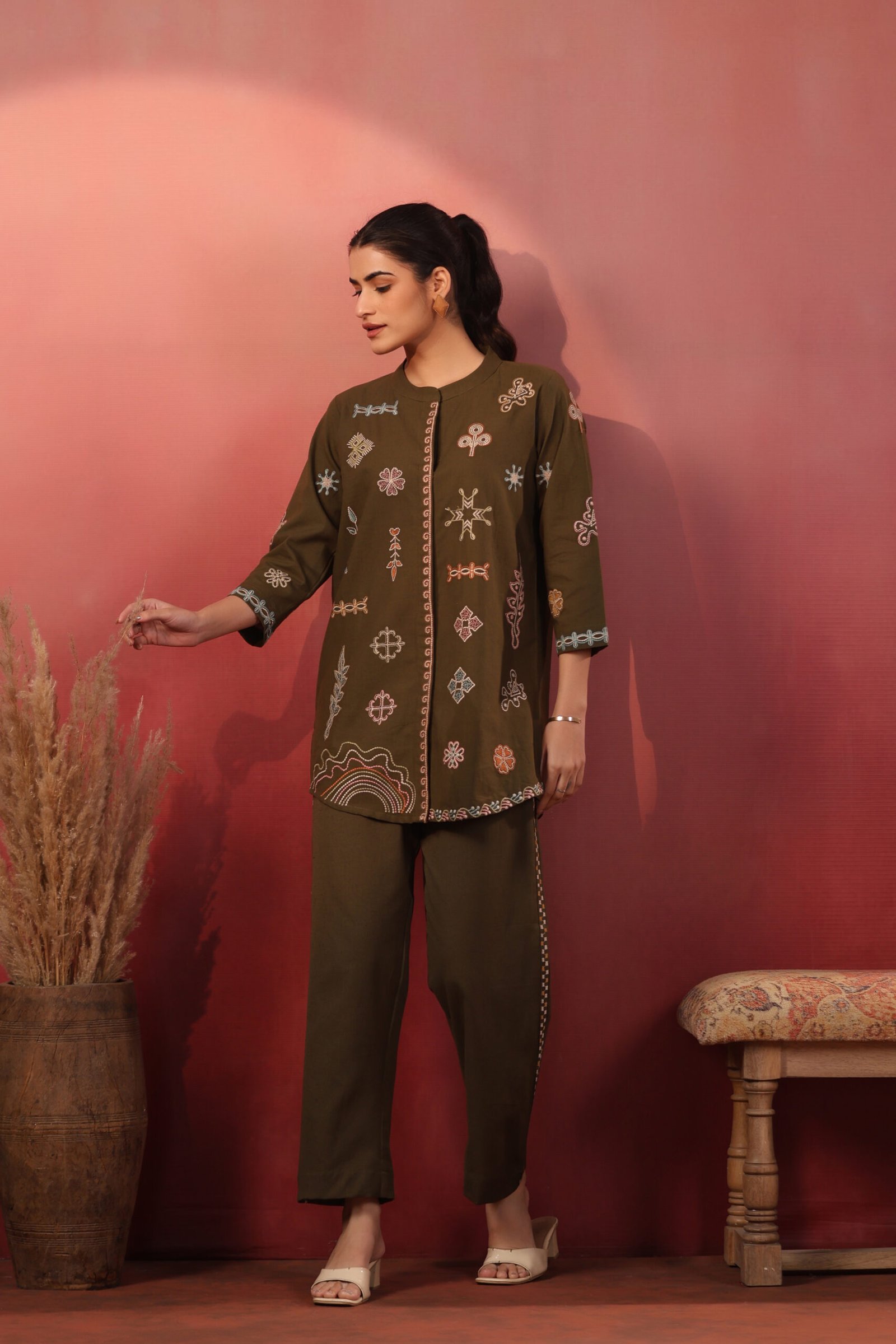 Both the top and bottom feature refined embroidery, creating a polished and cohesive look without extra styling effort. The lightweight fabric ensures ease of movement, making it perfect for day outings, casual gatherings, office wear, and relaxed festive moments.