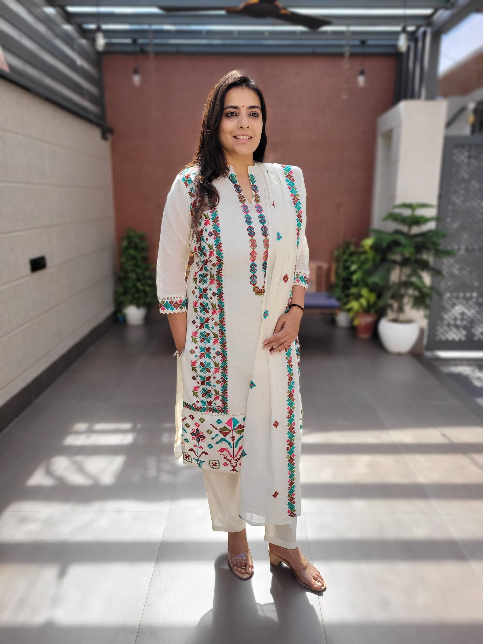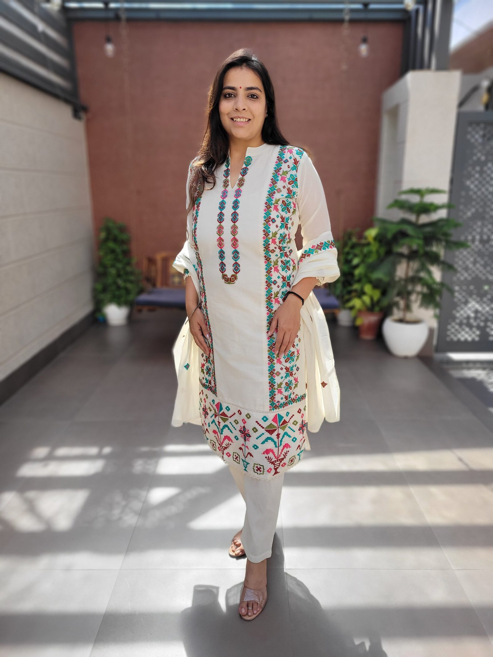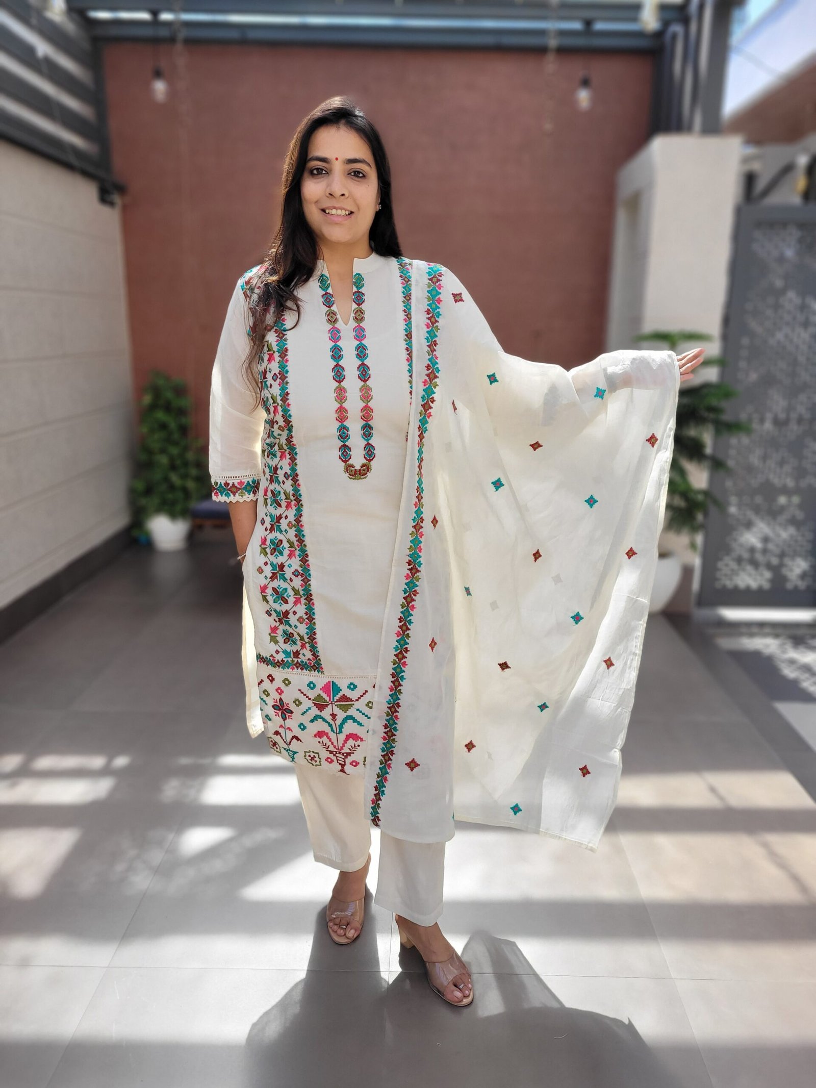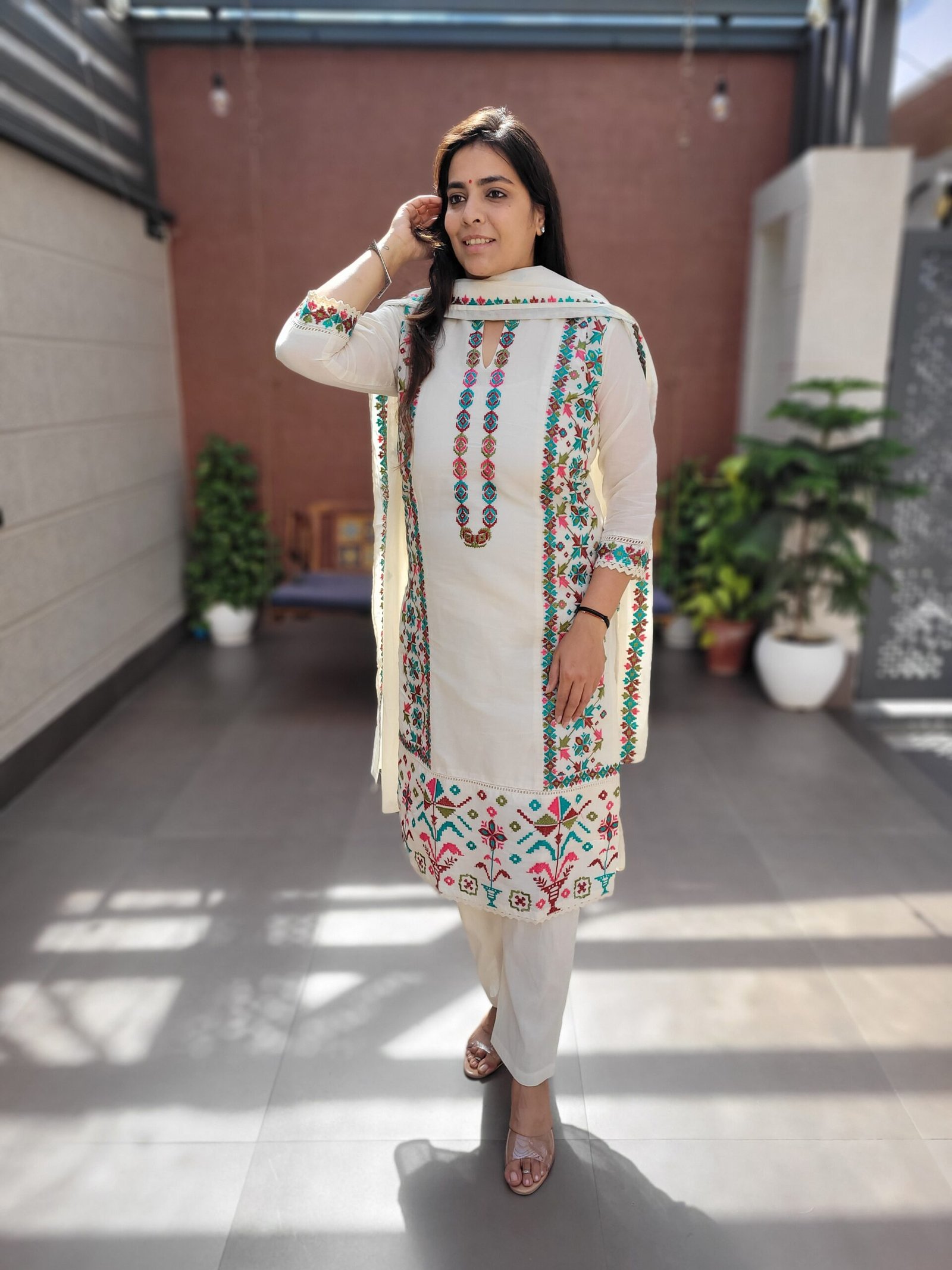 The kurta features elegant embroidery enhanced with crochet lace work, creating a refined ethnic look. A soft cotton lining ensures comfort, while the embroidered dupatta completes the coordinated ensemble. Perfect for festive gatherings, daytime functions, and elegant casual wear.