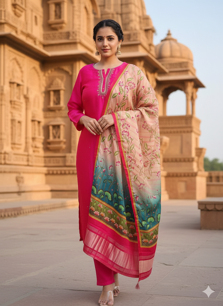 Whether you’re dressing up for a Diwali gathering, wedding function, or festive brunch, this 3PC set brings sophistication without compromising on comfort. Its flattering fit and radiant fabric make it a must-have in your ethnic wardrobe.