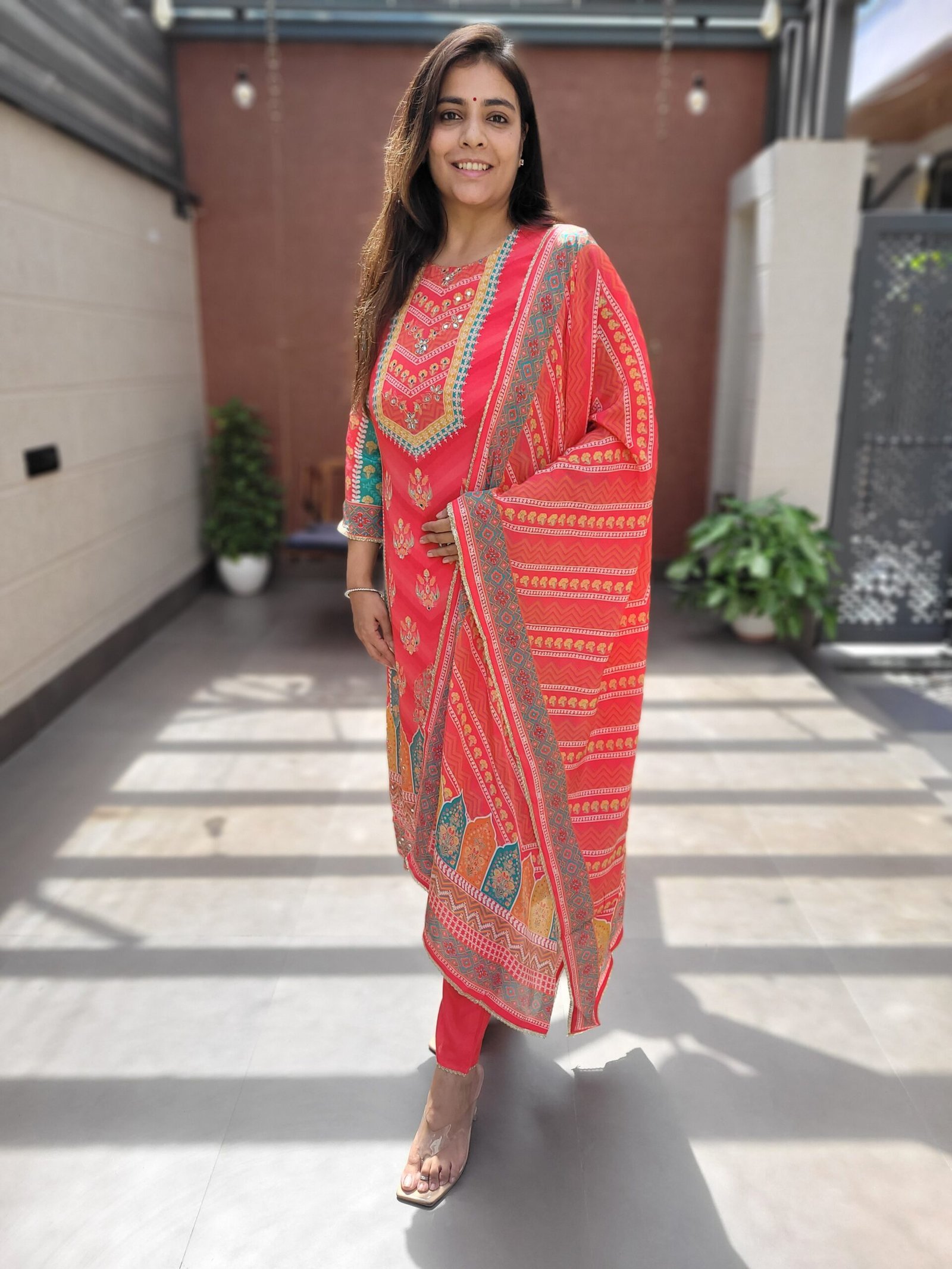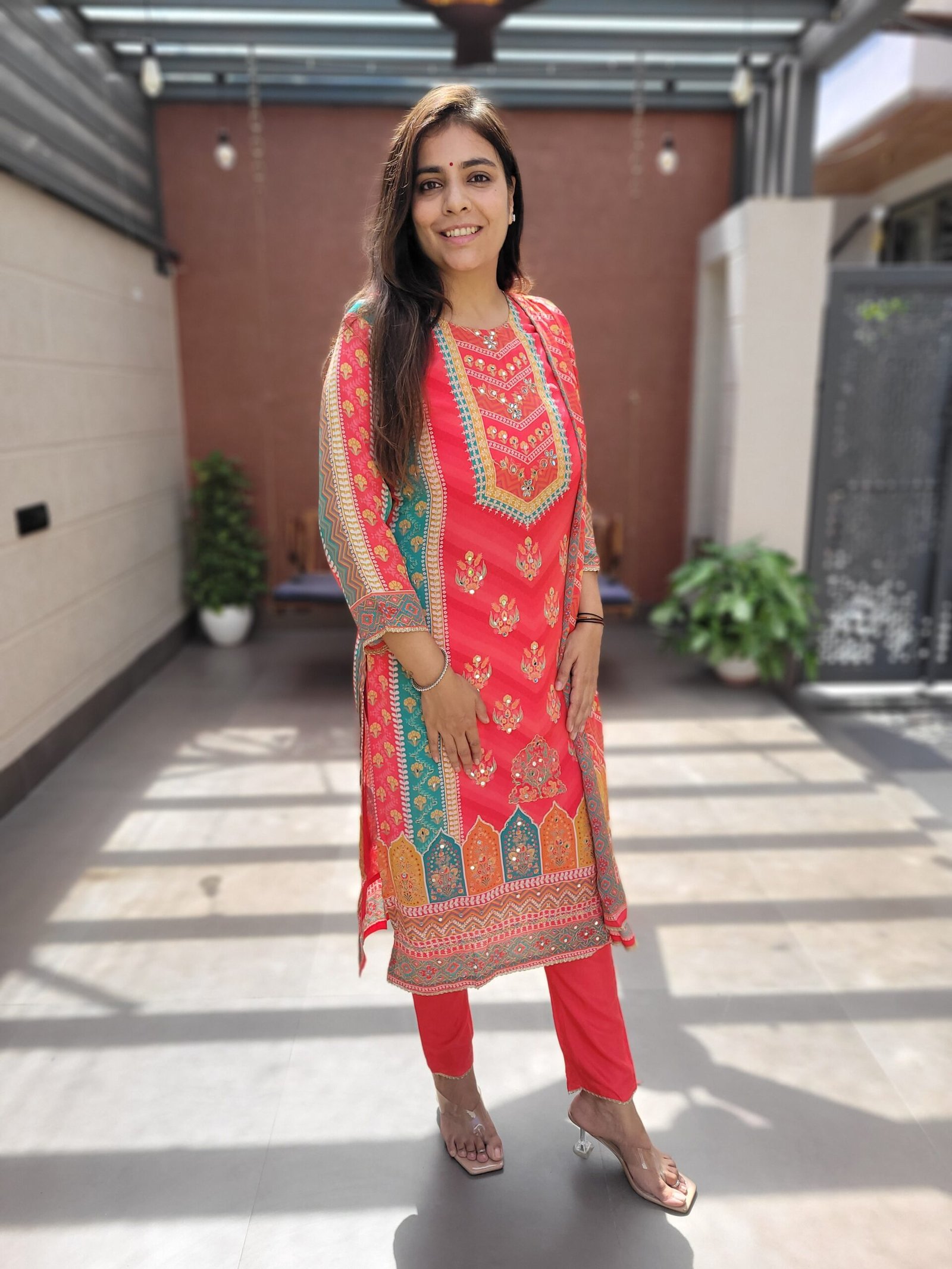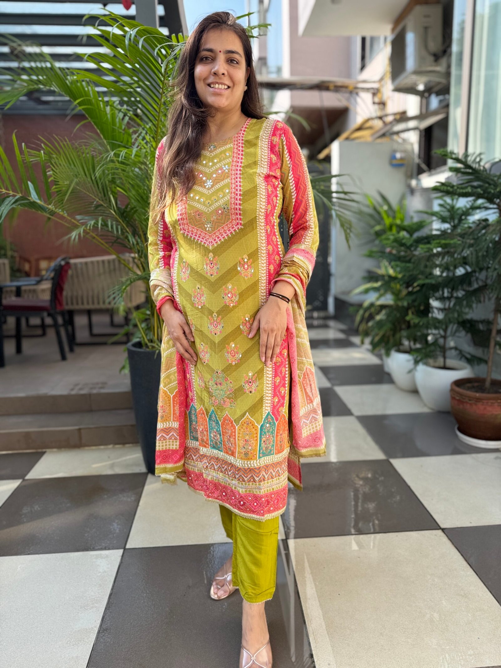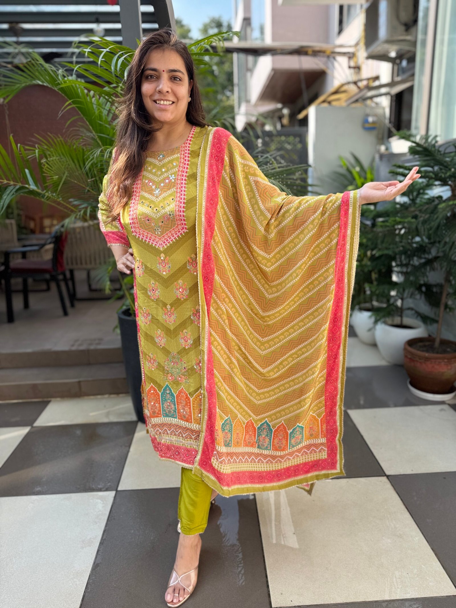 The DU-421 Festive Wear Suit Set is crafted from soft, breathable natural crepe, providing lightweight comfort with a luxurious drape. Featuring elegant placement prints and intricate handwork detailing, this set embodies traditional craftsmanship with a contemporary touch. The matching natural crepe dupatta completes the ensemble, adding charm and sophistication.