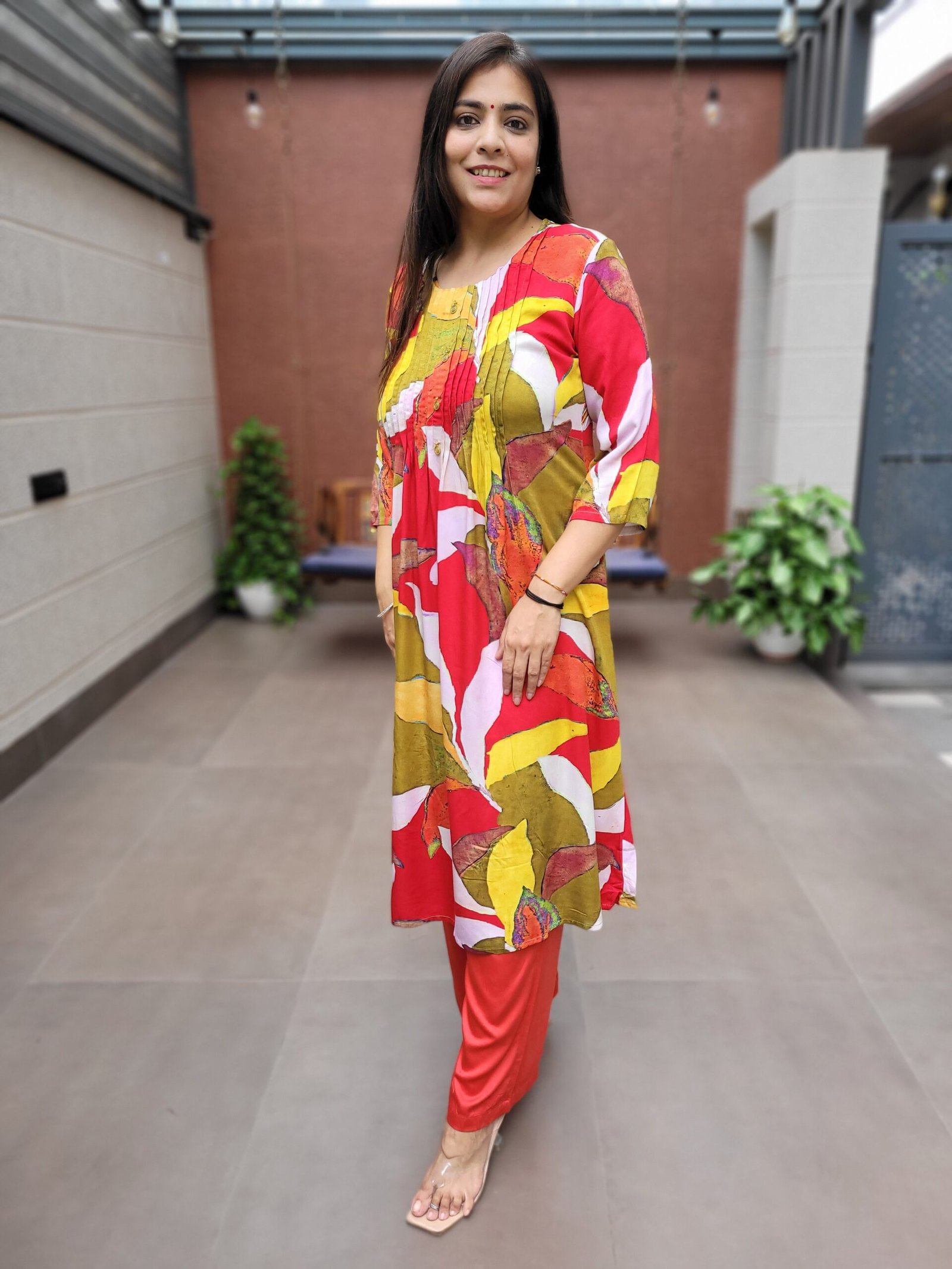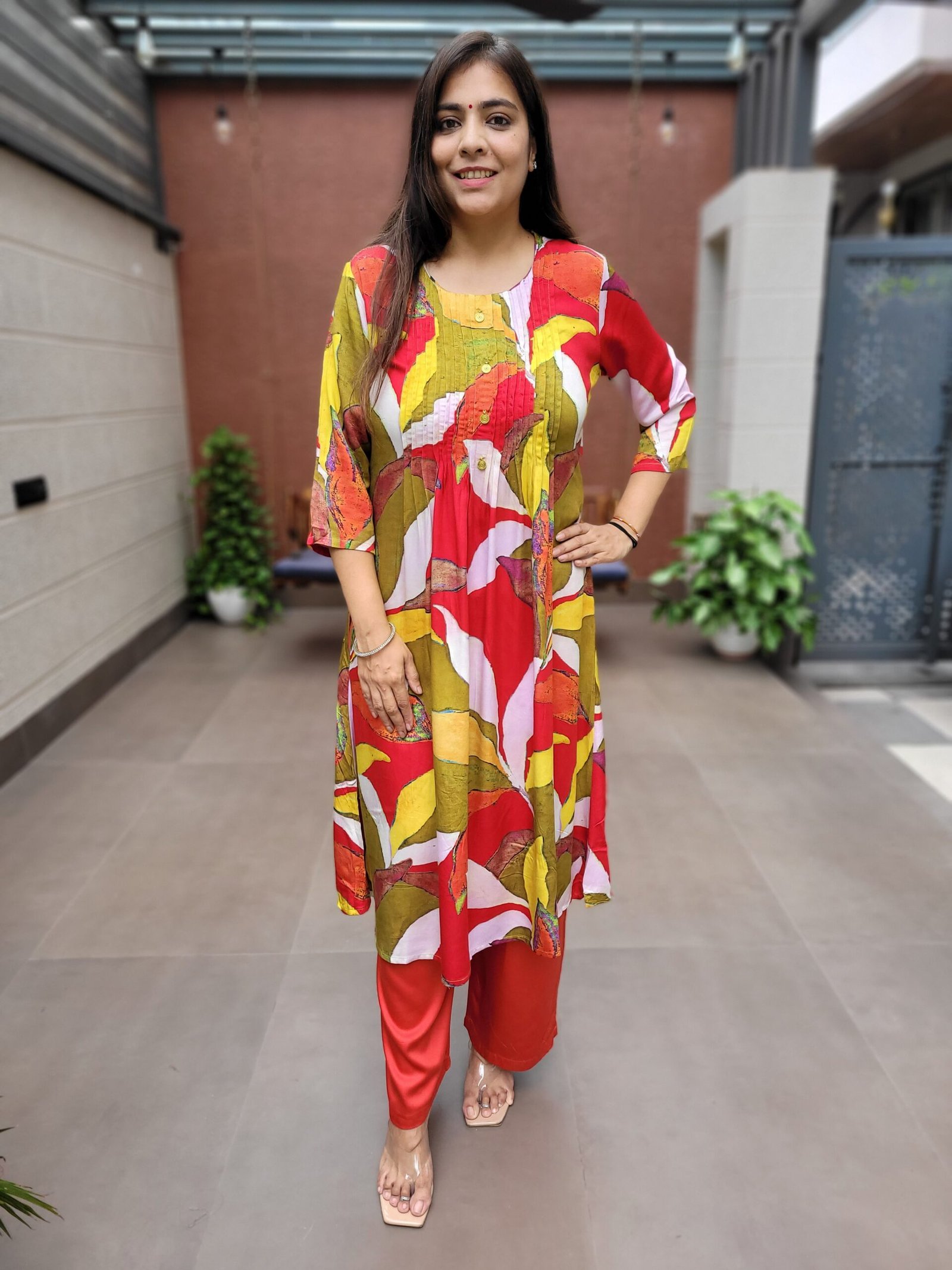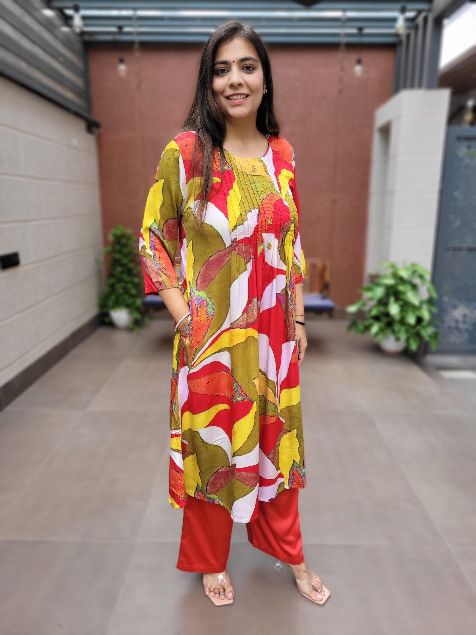 The rich rust and mehndi shades bring warmth and vibrancy, perfect for festive occasions, family gatherings, or semi-formal events. Pair with statement earrings, bangles, or heels to elevate your ensemble, while the lightweight fabric ensures comfort throughout the day.