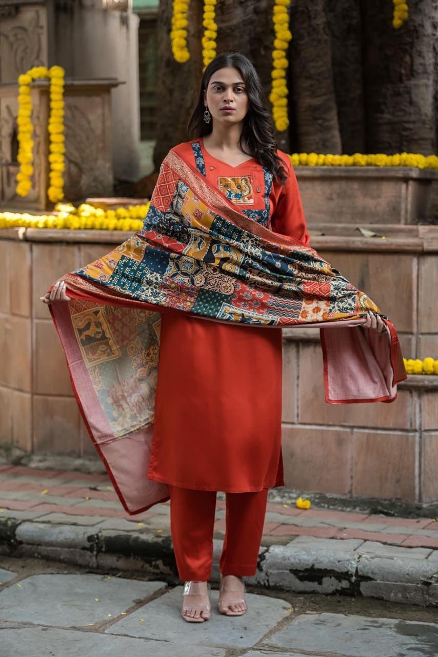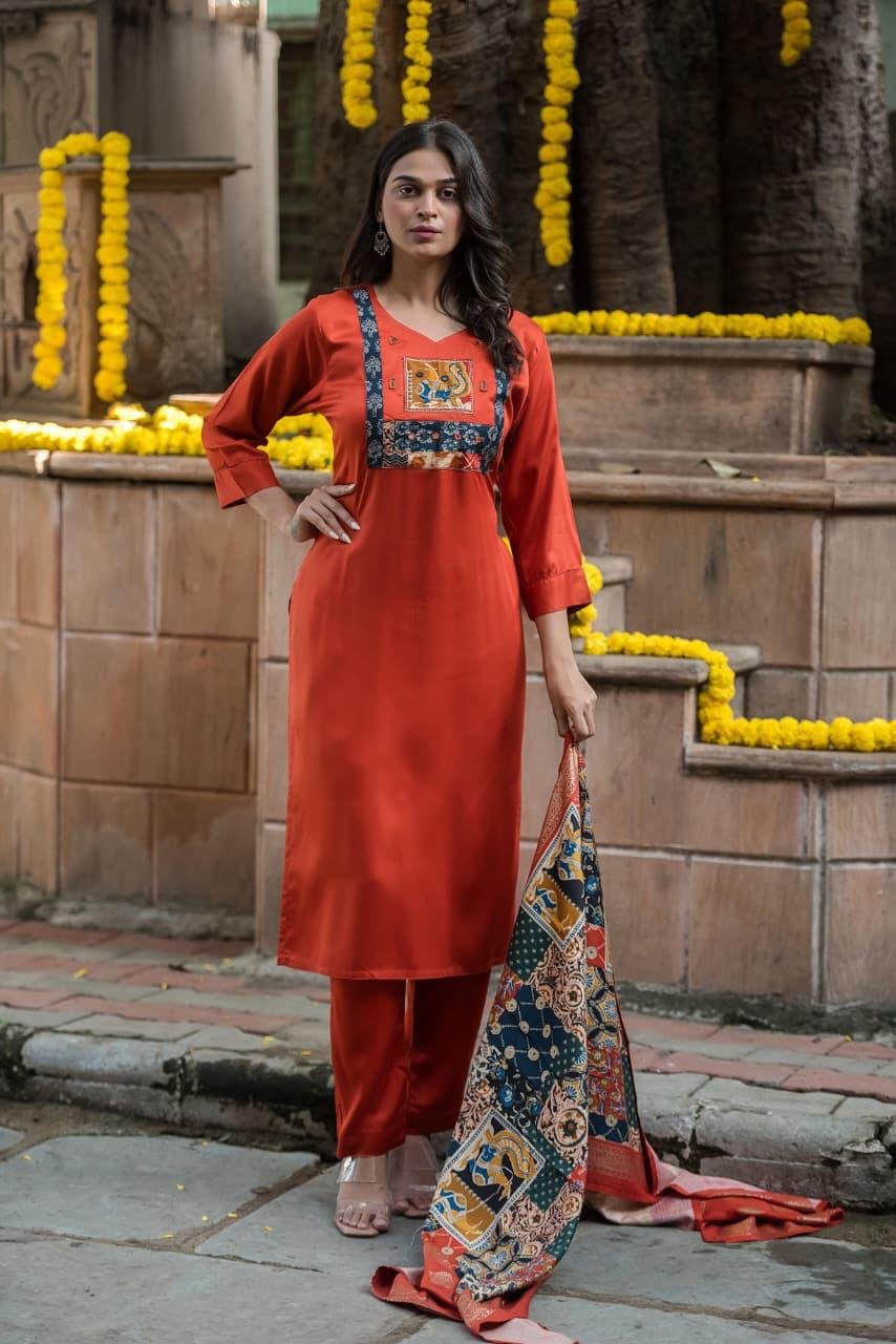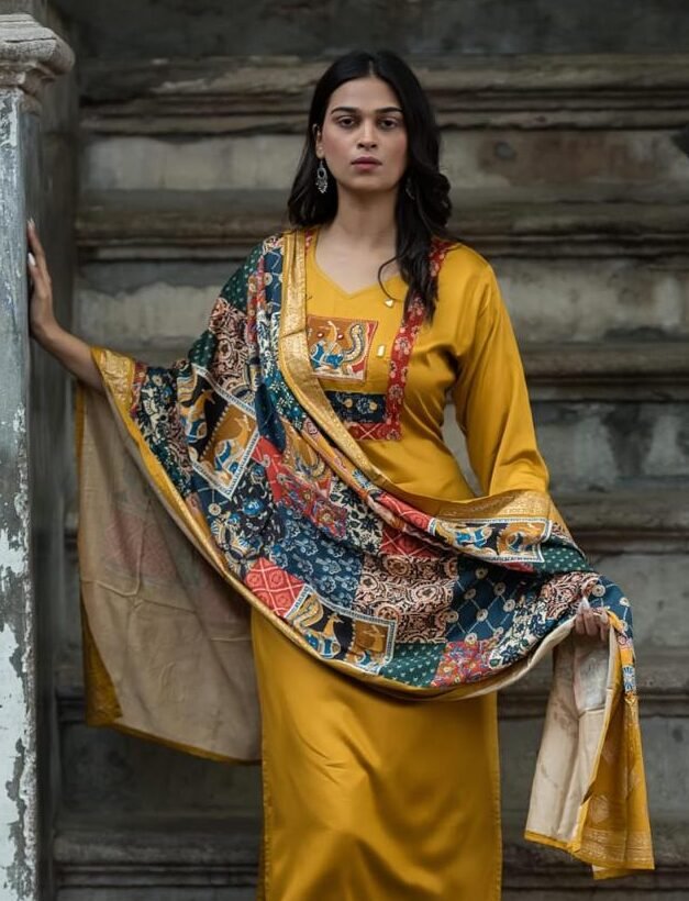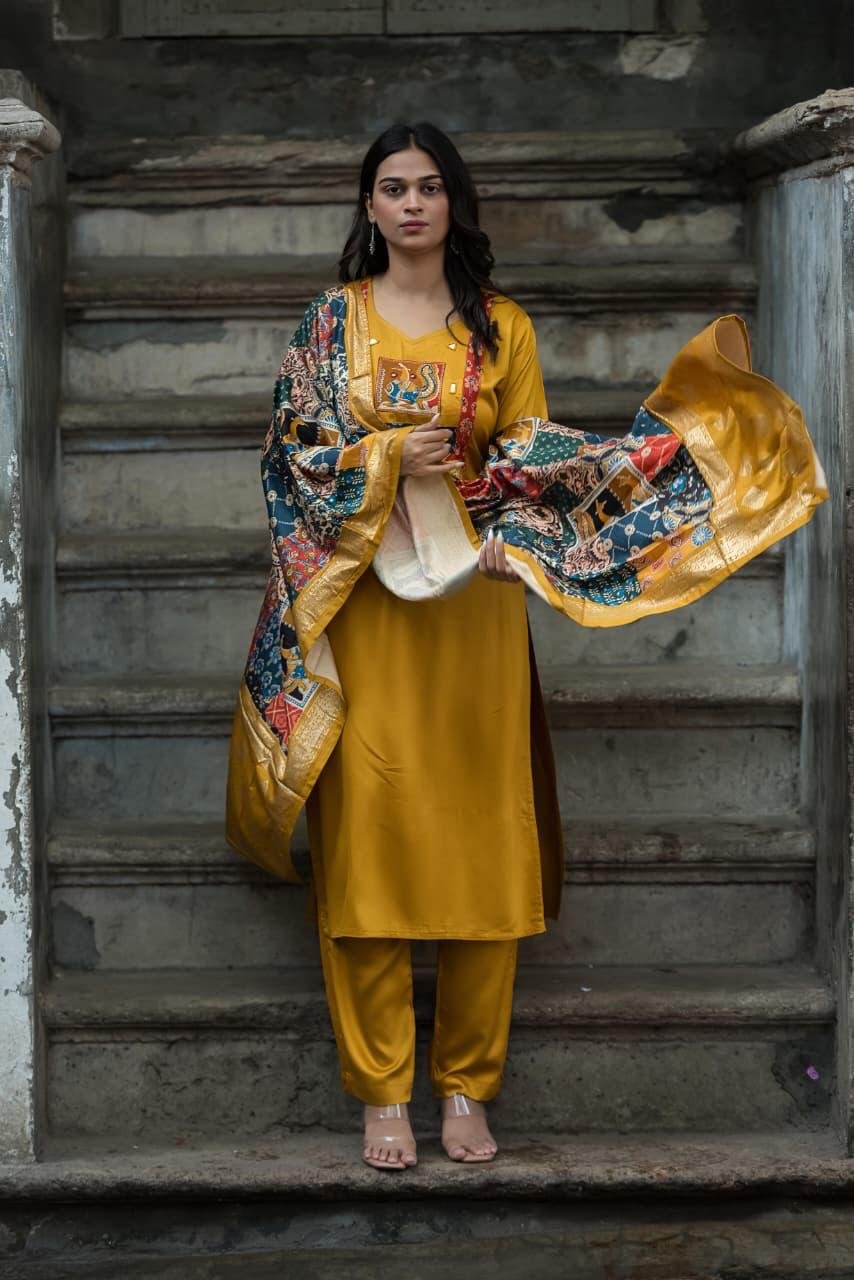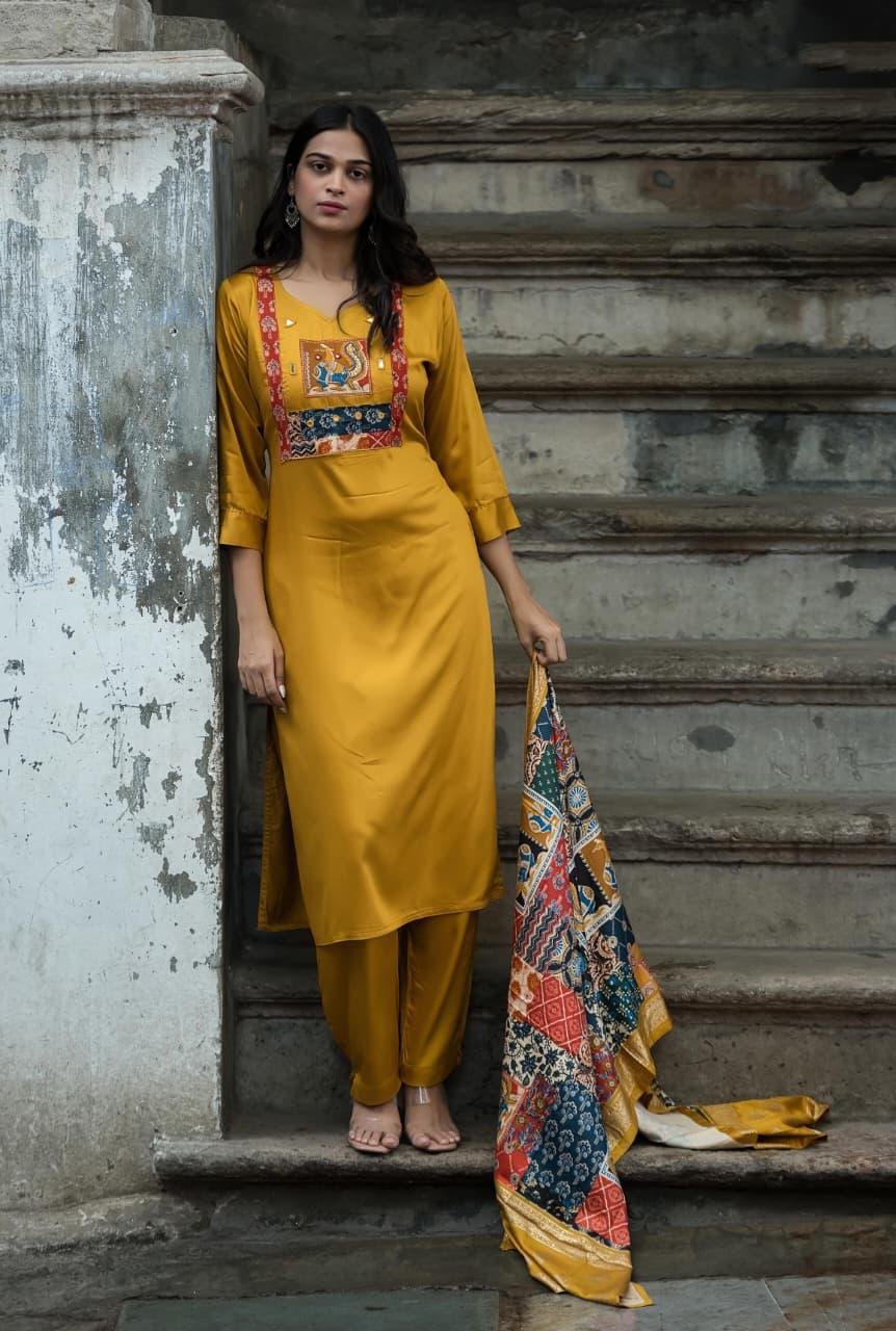 The DU-608 Gajji Silk Suit Set is crafted from luxurious, soft Gajji silk, offering a smooth texture and graceful drape. The kurta features intricate original mirror work, paired with a matching Gajji dupatta and coordinated bottom to create an elegant and festive ensemble.