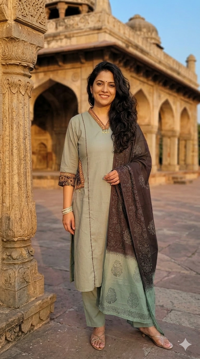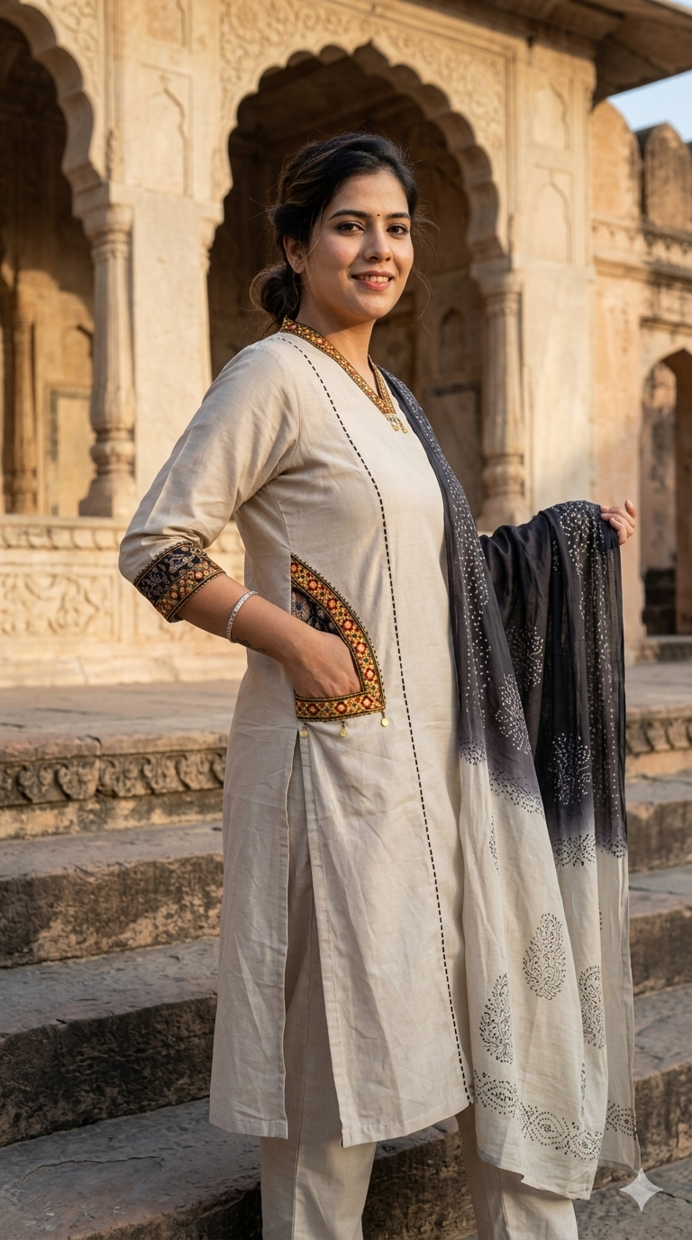 Take your ethnic wardrobe up a level with the Gamthi 3PC Set that combines traditional craftsmanship with modern style. This beautiful set is made from 100% cotton fabric that breathes well for all-day comfort. It features gorgeous Gamthi embroidery showcasing skillful handwork that is sure to elevate your everyday look. You will also find Kalamkari patch details that add a unique artistic element to the outfit.