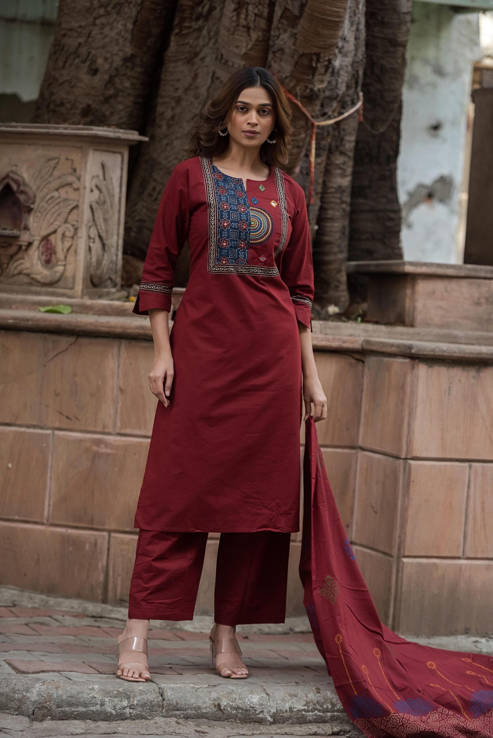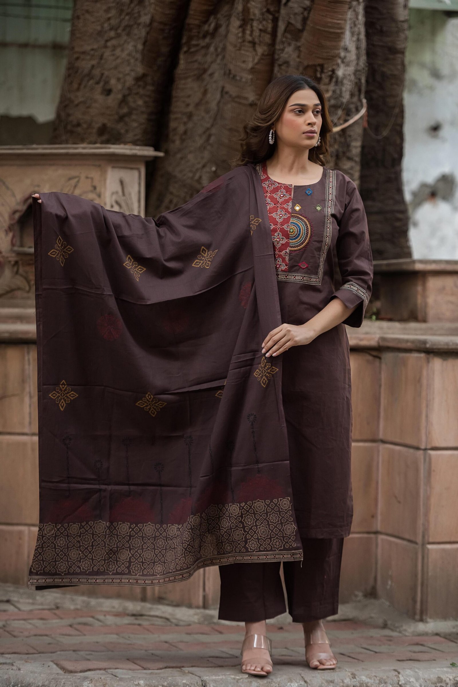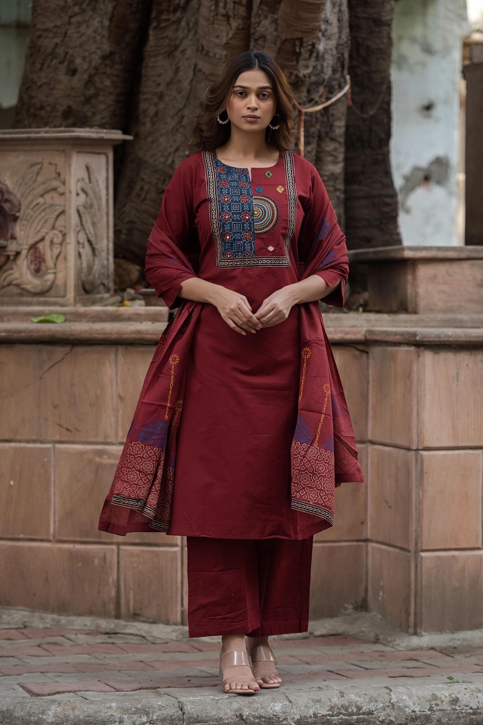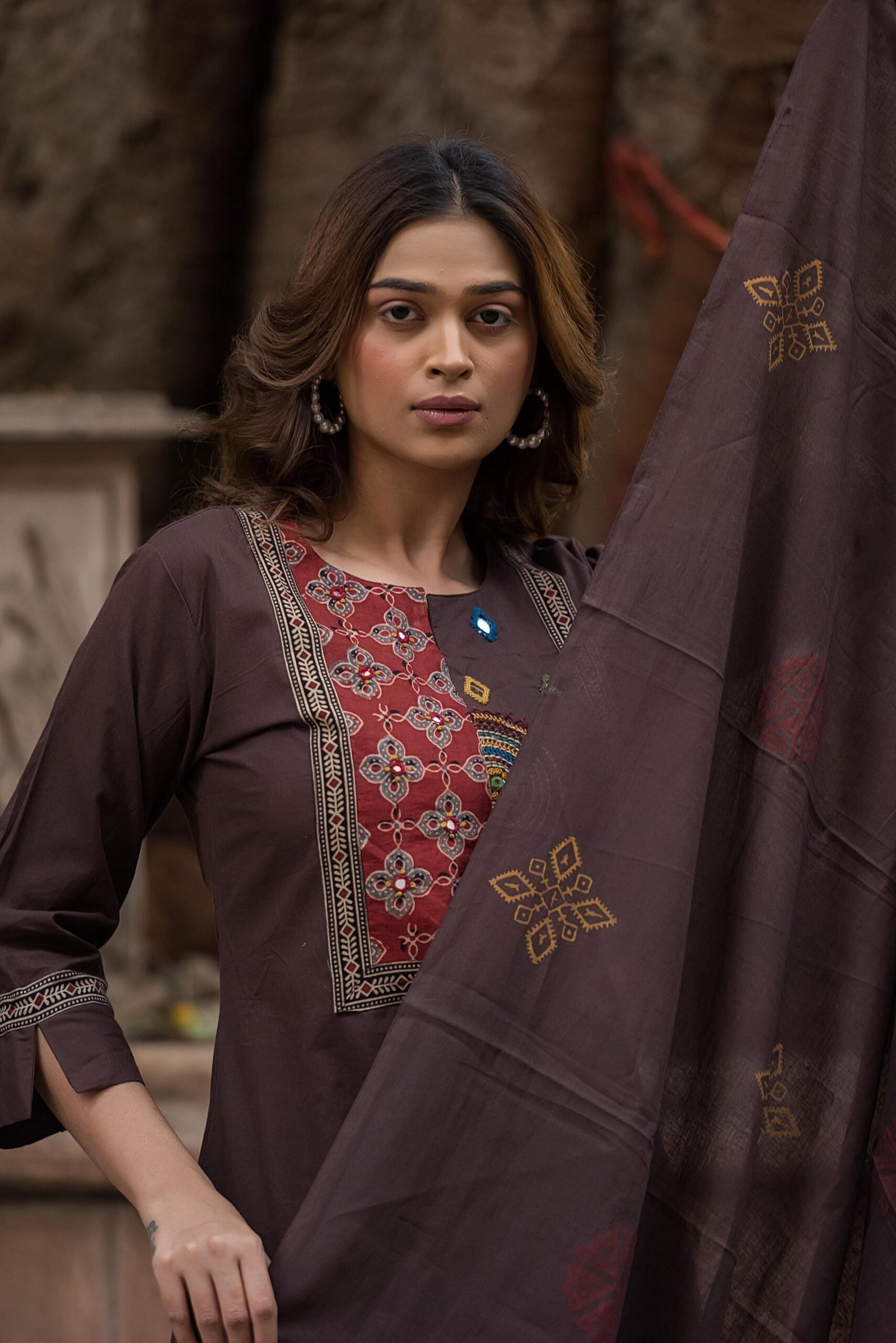 The kurta features authentic Ajrakh patching, beautifully complemented by mirror work and intricate embroidery, adding depth and character to the design. Paired with a handblock printed dupatta, the set reflects timeless ethnic charm and artisanal elegance.