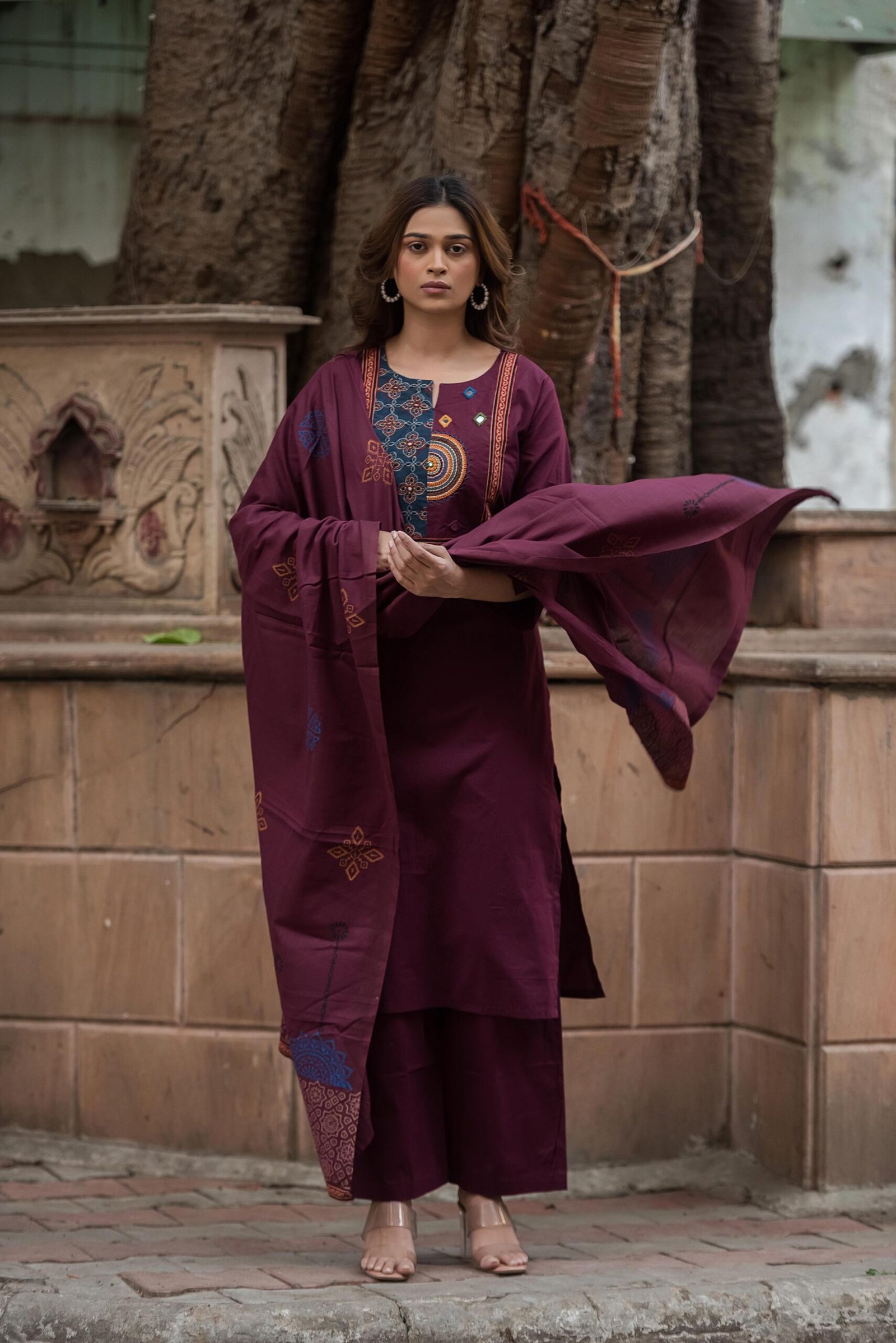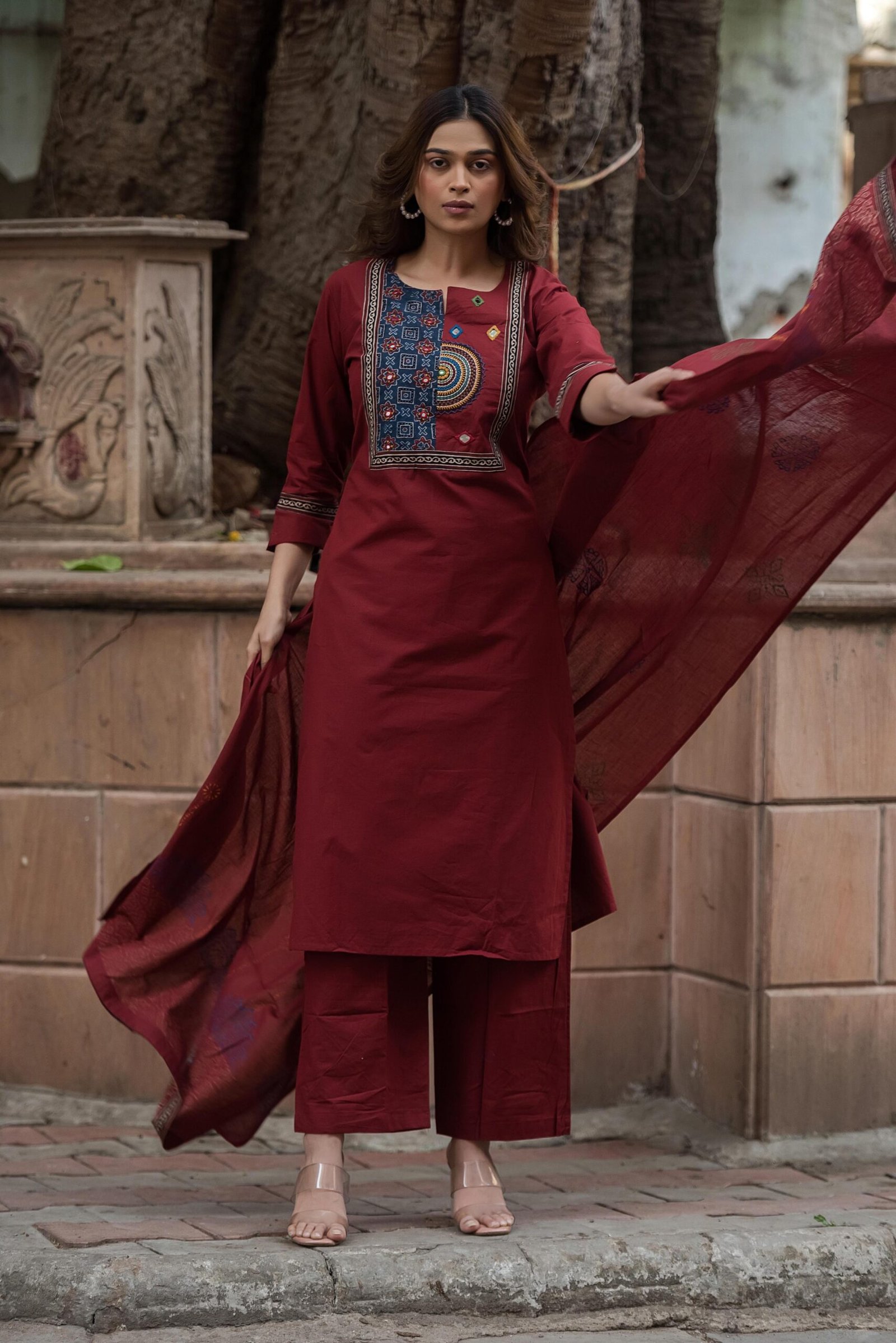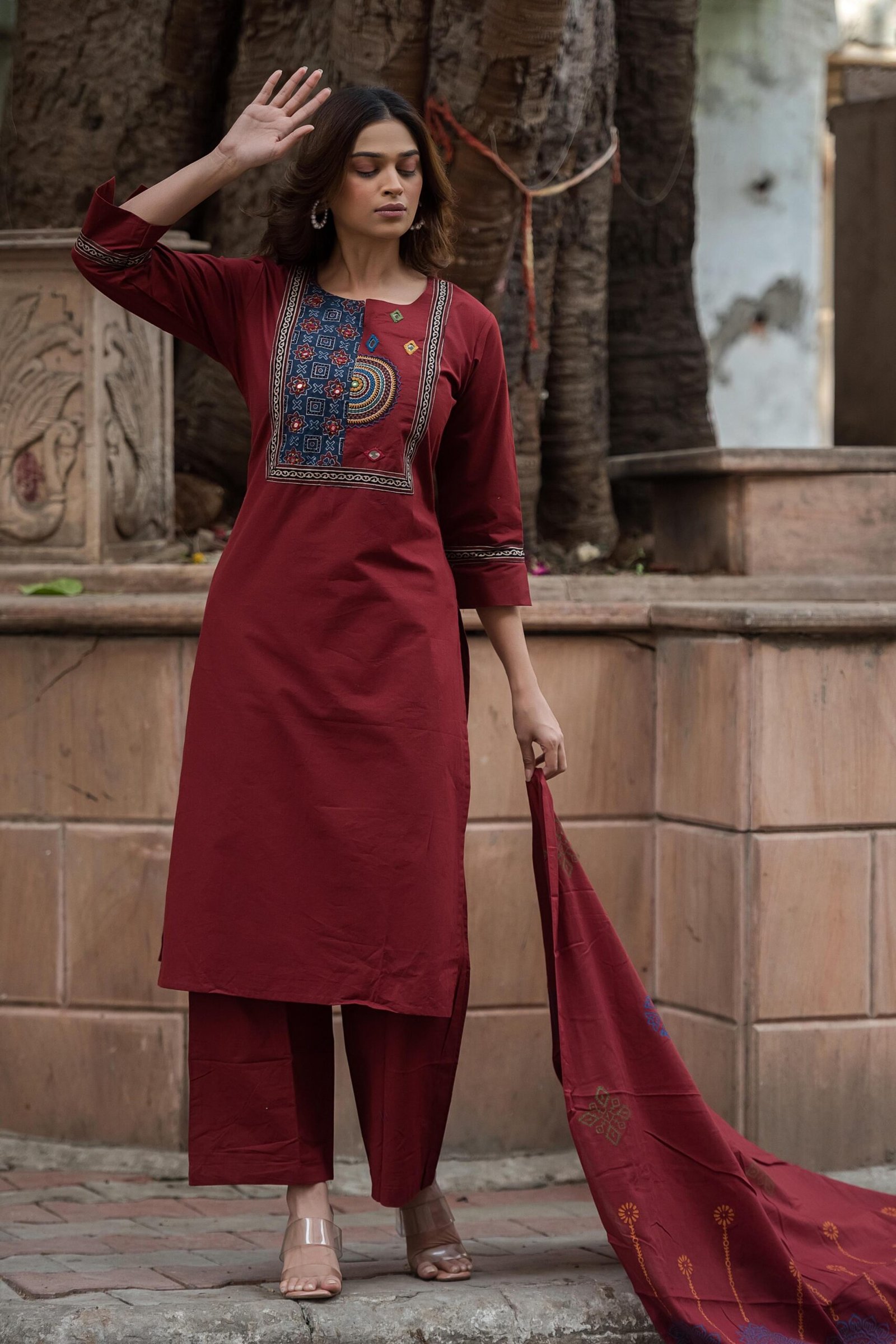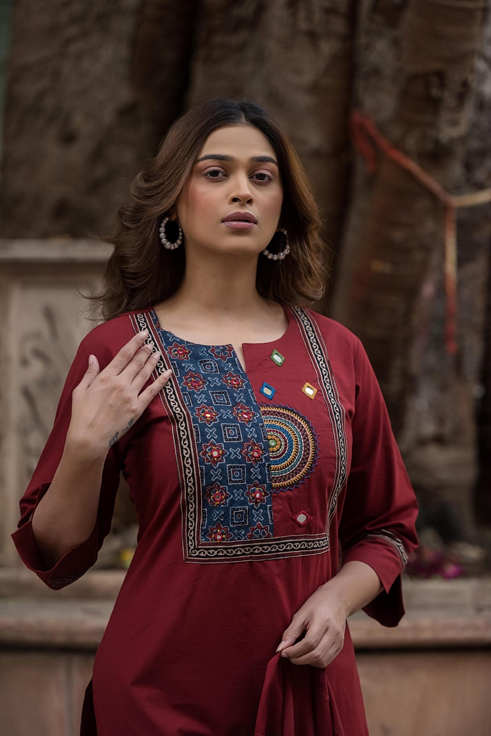 The kurta features authentic Ajrakh patching, beautifully complemented by mirror work and intricate embroidery, adding depth and character to the design. Paired with a handblock printed dupatta, the set reflects timeless ethnic charm and artisanal elegance.