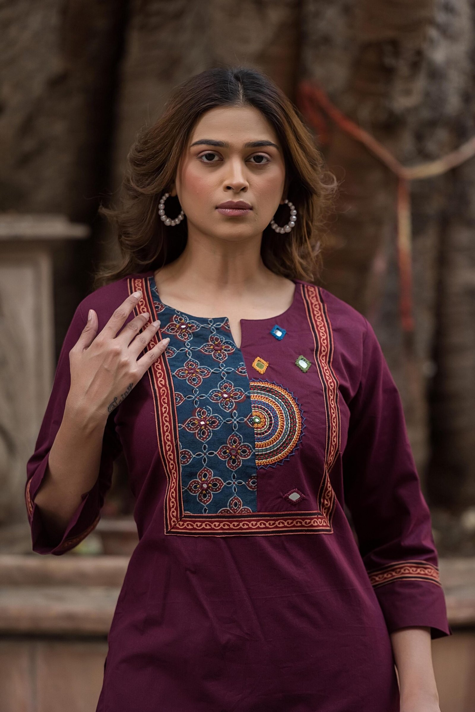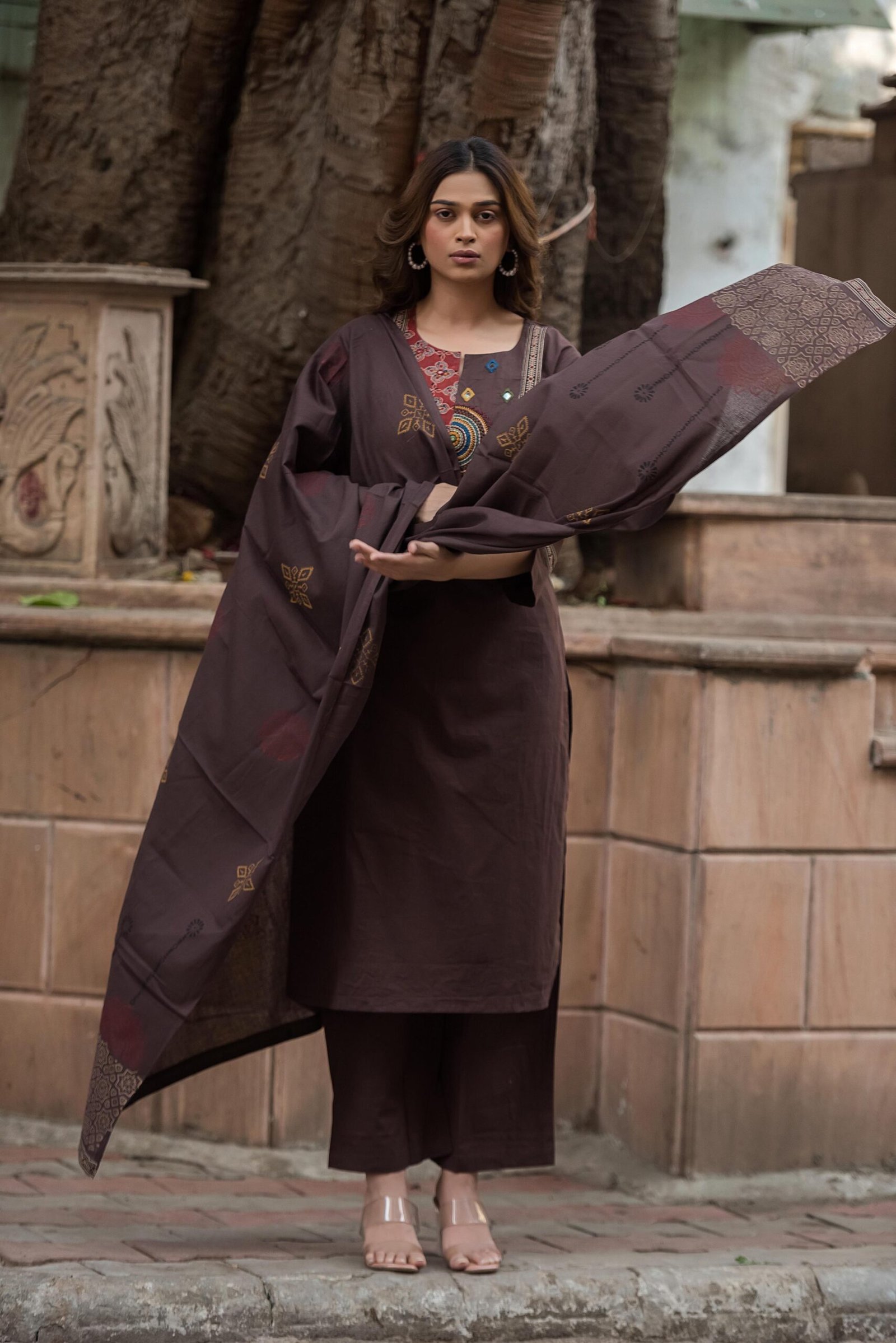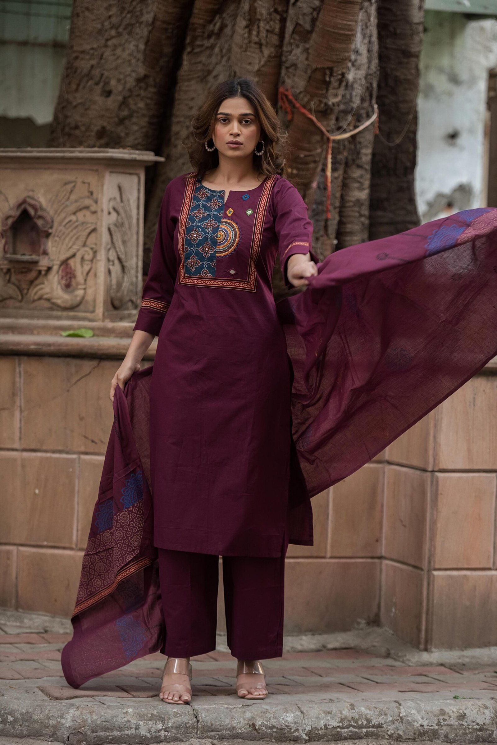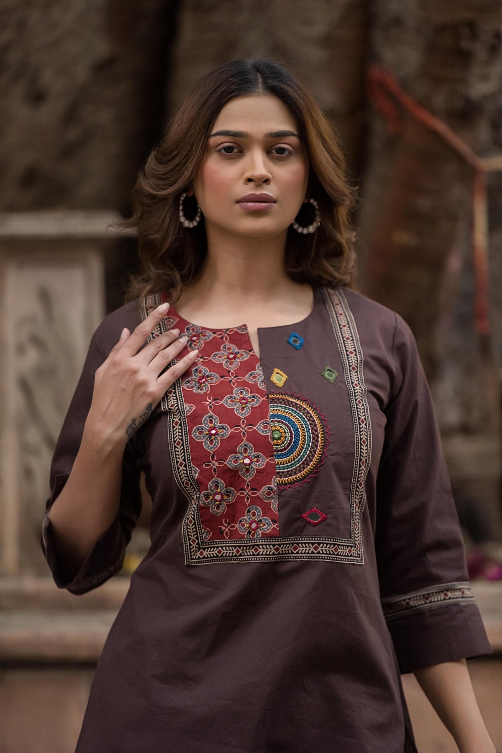 The kurta features authentic Ajrakh patching, beautifully complemented by mirror work and intricate embroidery, adding depth and character to the design. Paired with a handblock printed dupatta, the set reflects timeless ethnic charm and artisanal elegance.