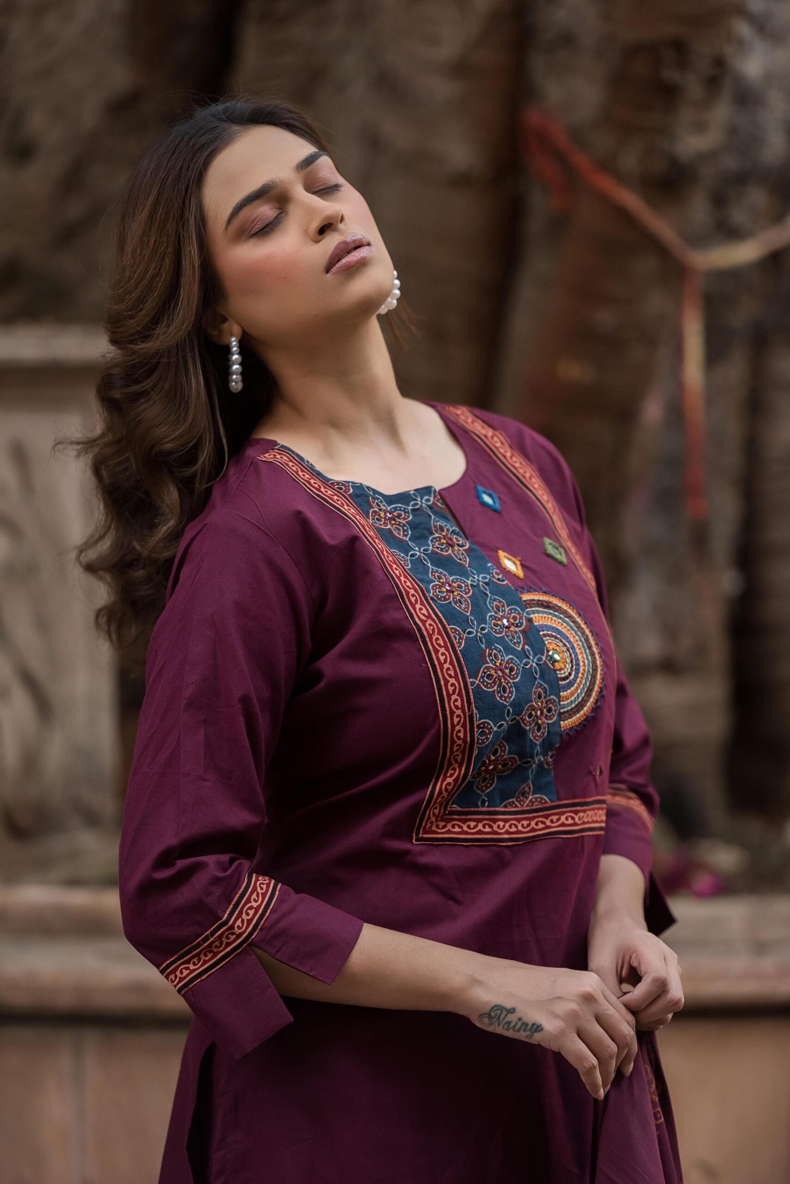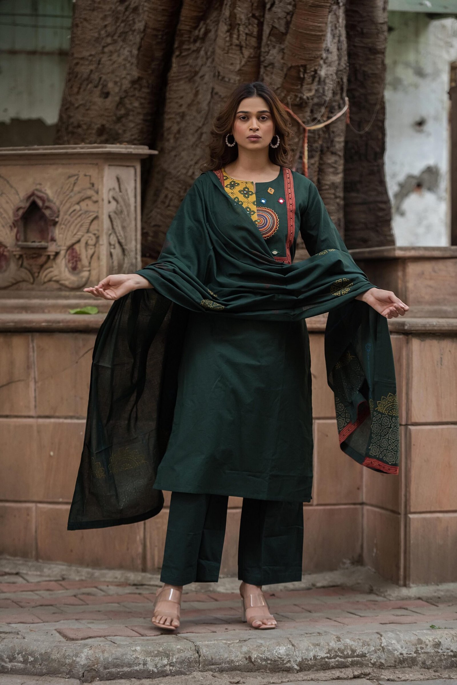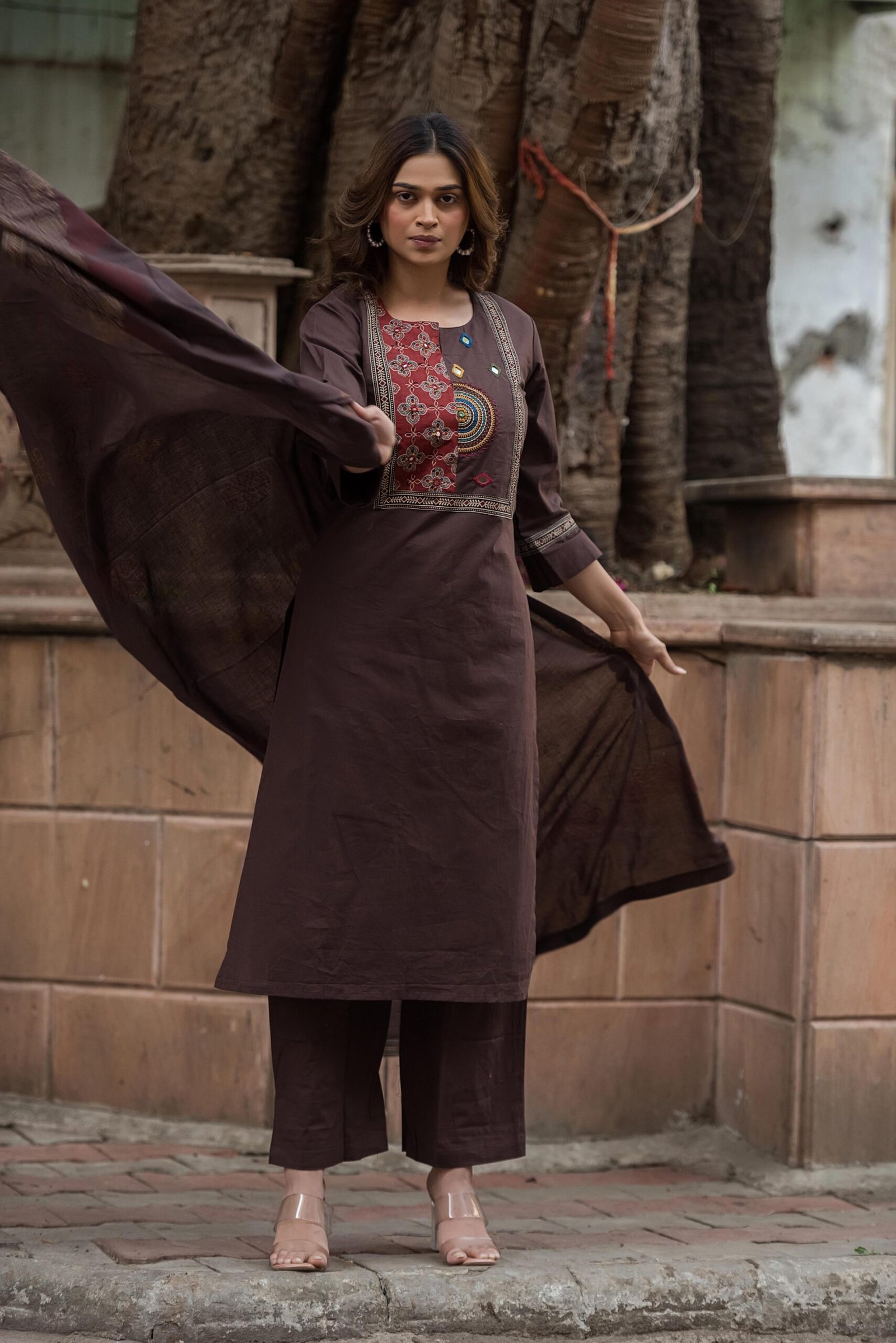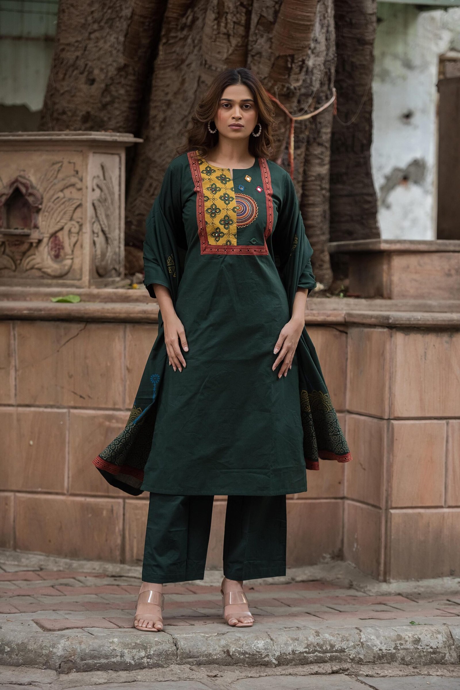 The kurta features authentic Ajrakh patching, beautifully complemented by mirror work and intricate embroidery, adding depth and character to the design. Paired with a handblock printed dupatta, the set reflects timeless ethnic charm and artisanal elegance.