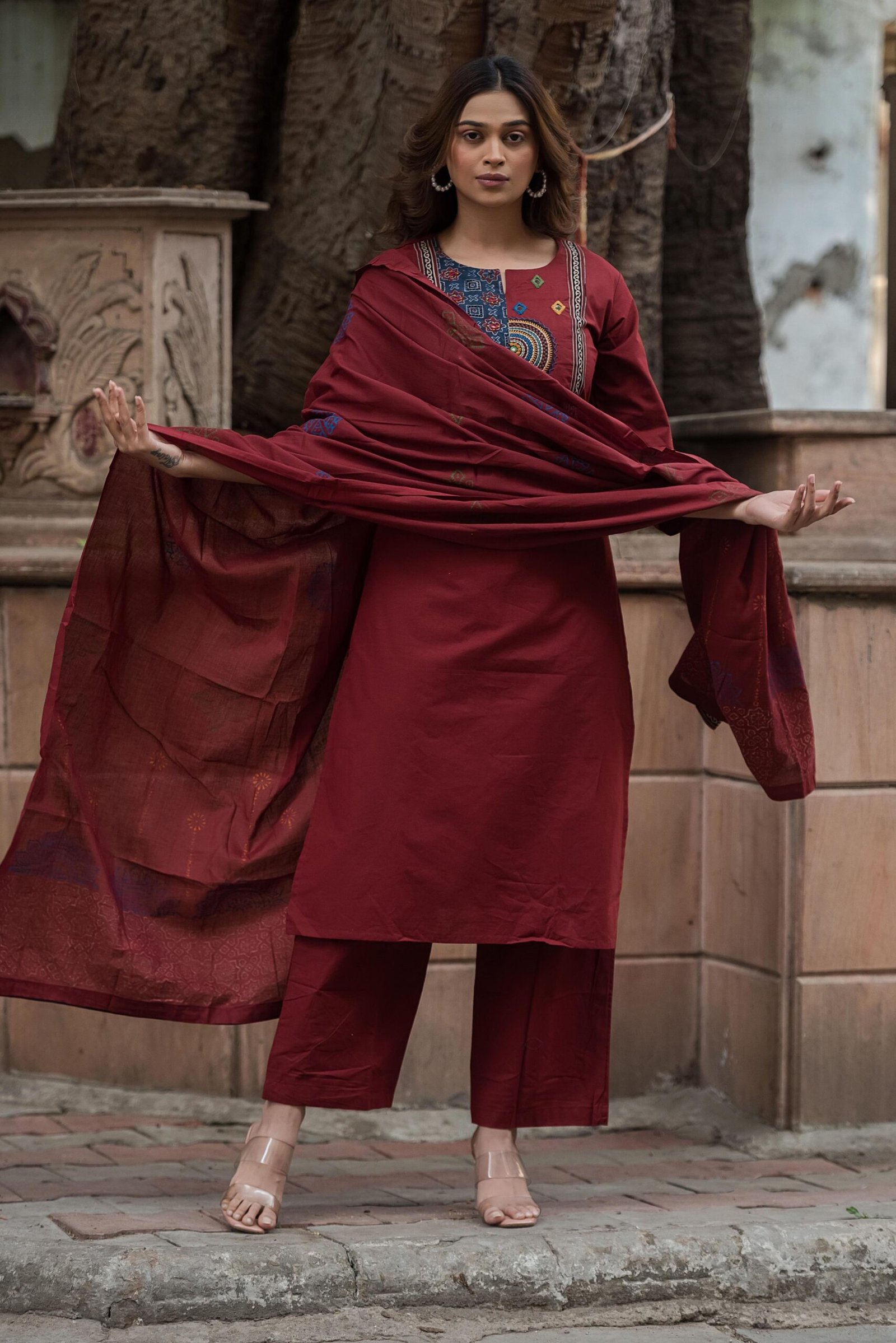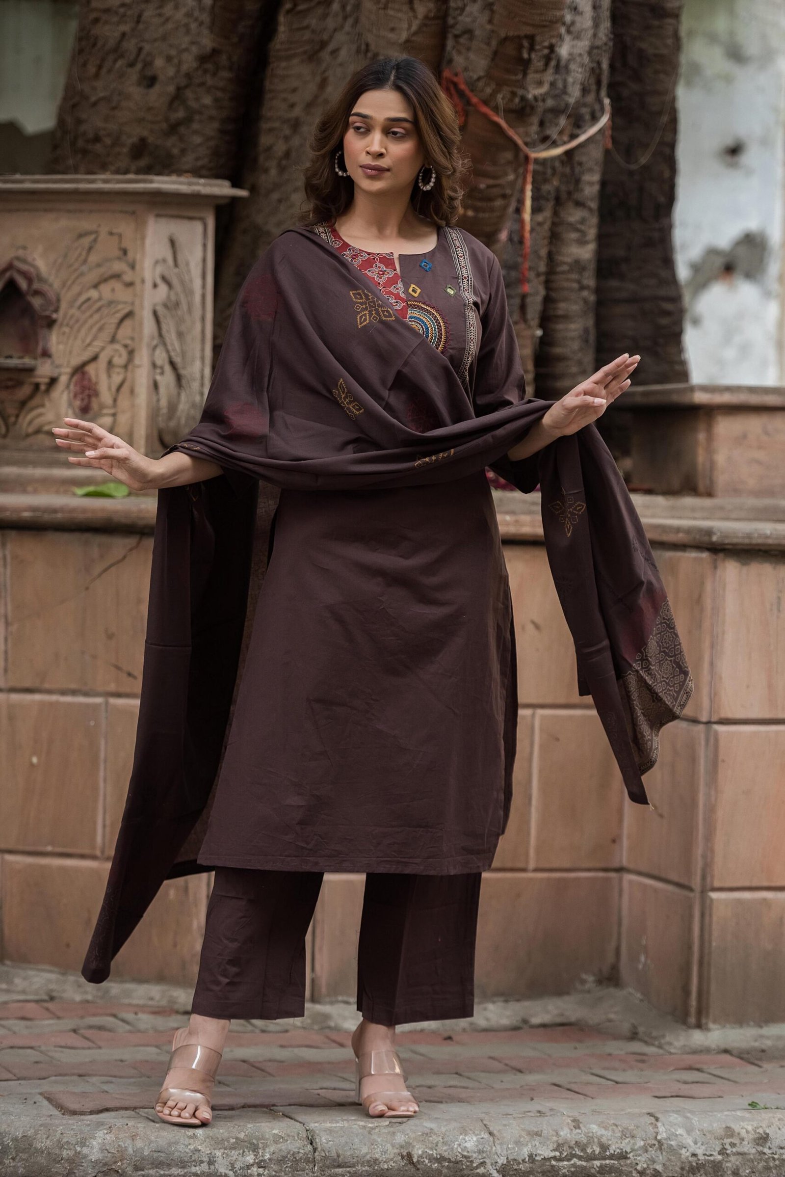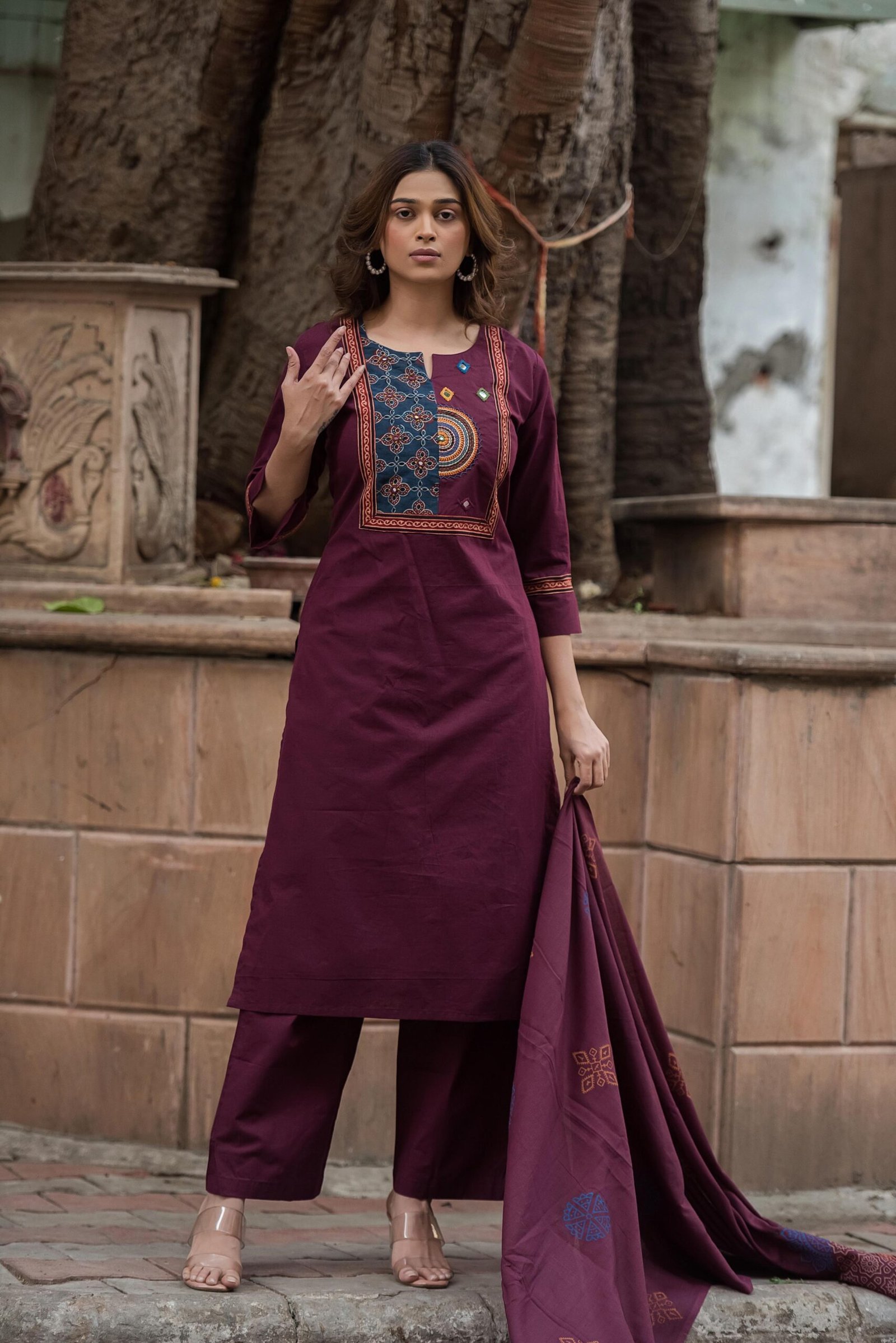 The DU-003 Gamthi 3PC Suit Set is a celebration of rich Indian heritage and handcrafted detailing. Crafted from breathable cotton fabric, this ensemble offers all-day comfort while showcasing traditional artistry.