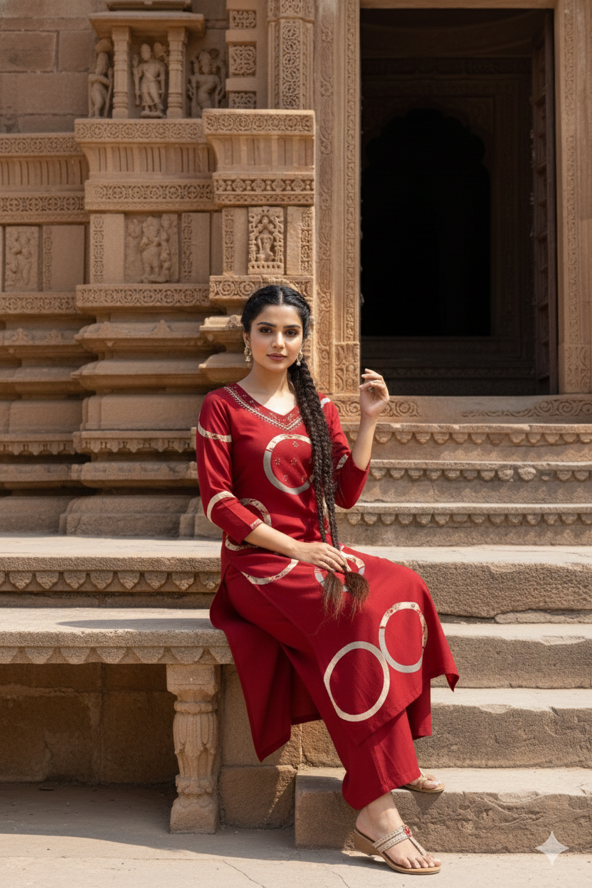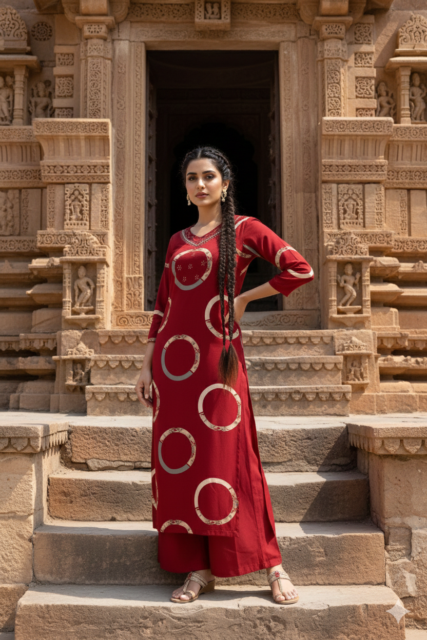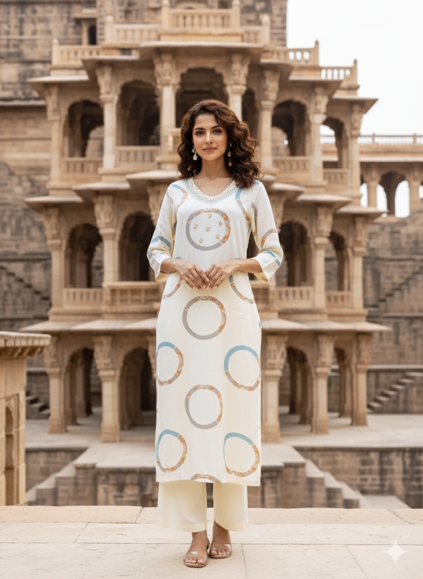 The kurta is enhanced with subtle handwork, adding an artisanal touch without overwhelming the design. Paired with a straight-fit palazzo featuring double pockets, the set ensures both style and practicality, making it perfect for workwear, casual outings, and relaxed ethnic styling.