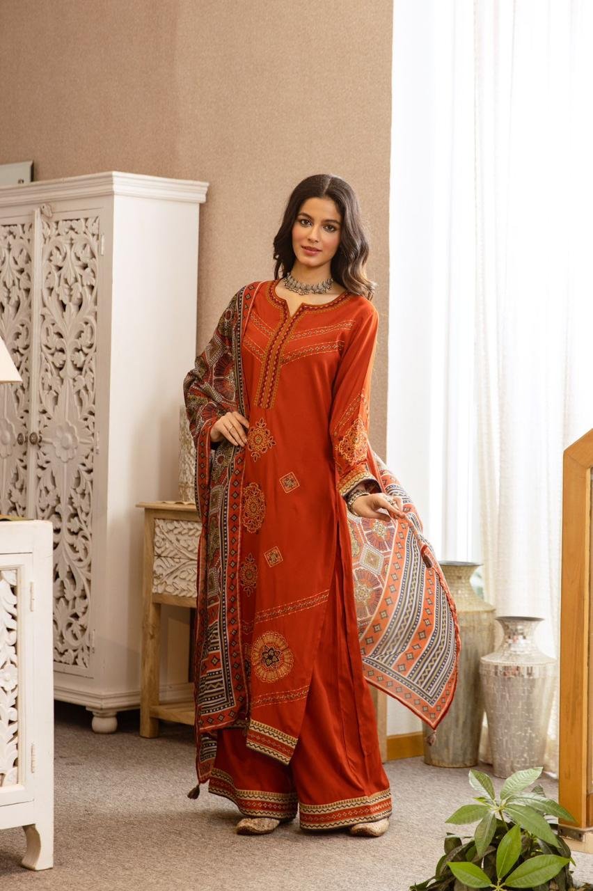 The DU-499 German Rayon 3PC Suit Set delivers a perfect blend of luxury and comfort. Made from soft and flowy German Rayon, the kurta features heavy embroidery that elevates its festive appeal. The wide palazzo bottom is beautifully embroidered, adding style and grace to the overall outfit.