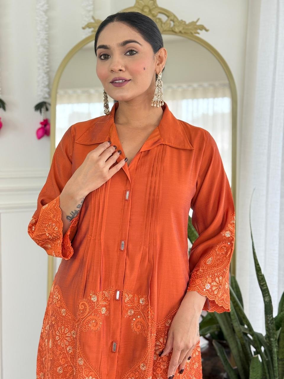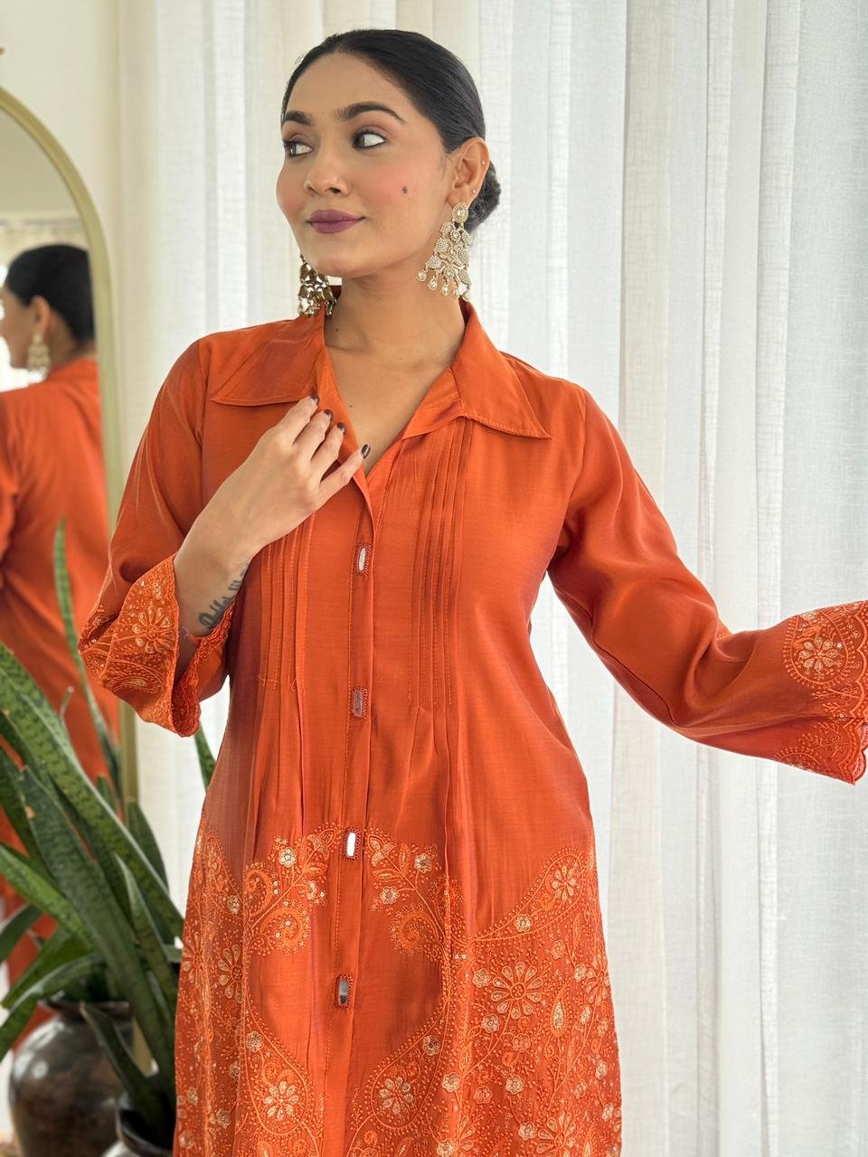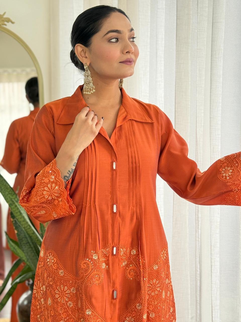 The kurta features exquisite embroidery with original mirror work, adding a touch of sparkle and craftsmanship. The matching plazzo with cover stitching detailing ensures a sleek and polished appearance, while the cotton lining provides superior comfort for all-day wear.