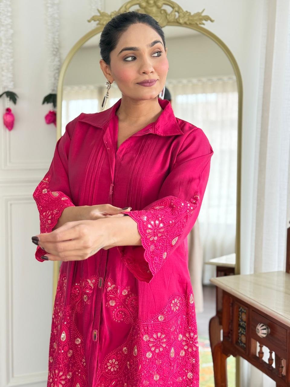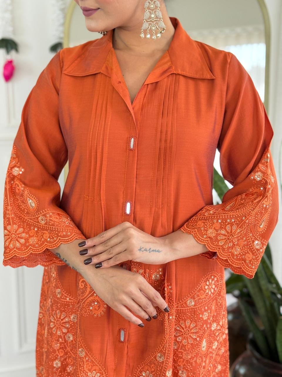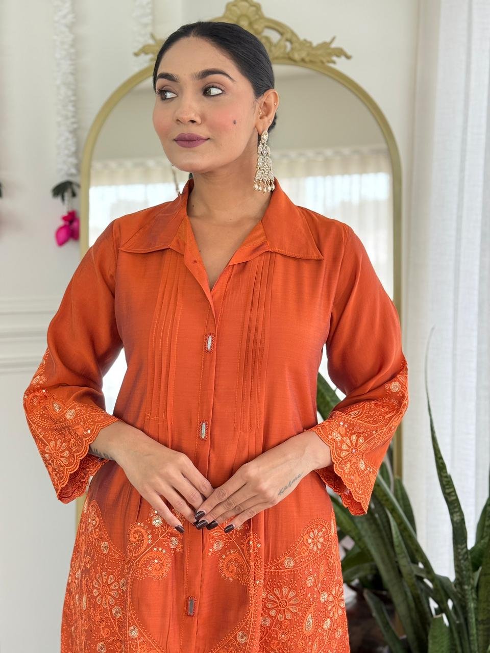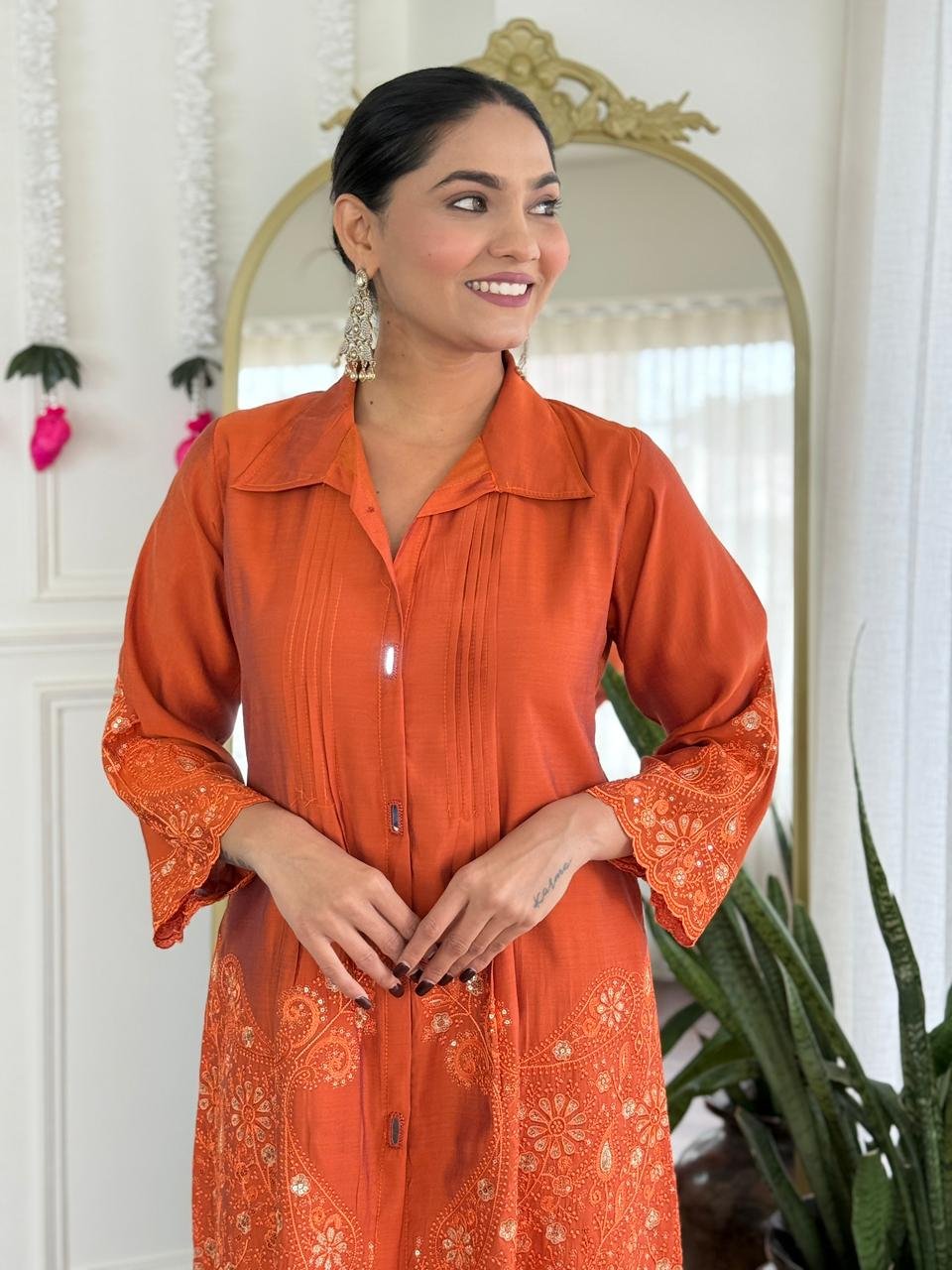 The kurta features exquisite embroidery with original mirror work, adding a touch of sparkle and craftsmanship. The matching plazzo with cover stitching detailing ensures a sleek and polished appearance, while the cotton lining provides superior comfort for all-day wear.