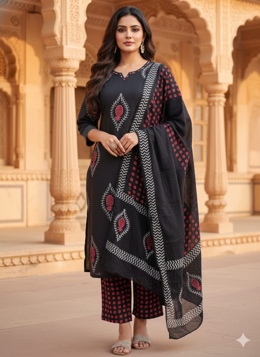 The kurta features delicate handwork on the yoke line and zari work on the sleeves, adding subtle festive charm. A functional pocket enhances practicality, while the full cotton dupatta completes the coordinated ensemble. Perfect for office wear, casual gatherings, and cultural occasions.