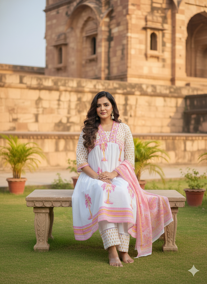 The kurta, bottom, and dupatta coordinate beautifully with earthy prints and artisan handwork, making this a great pick for work, family gatherings, or everyday grace. This is a wardrobe staple for the woman who wants timeless ethnic fashion that feels light and elegant.
