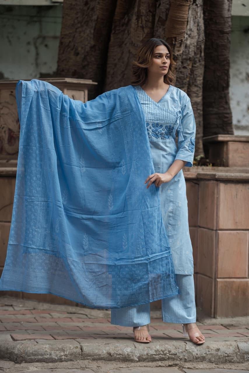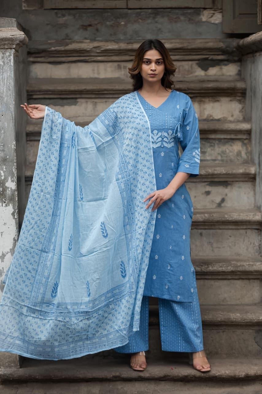 The kurta is enhanced with appliqué work and fine hand detailing, reflecting traditional craftsmanship with a contemporary appeal. Paired with a lightweight Doriya City dupatta, this set ensures effortless elegance and breathable comfort, making it suitable for everyday ethnic wear, office wear, and casual festive gatherings.