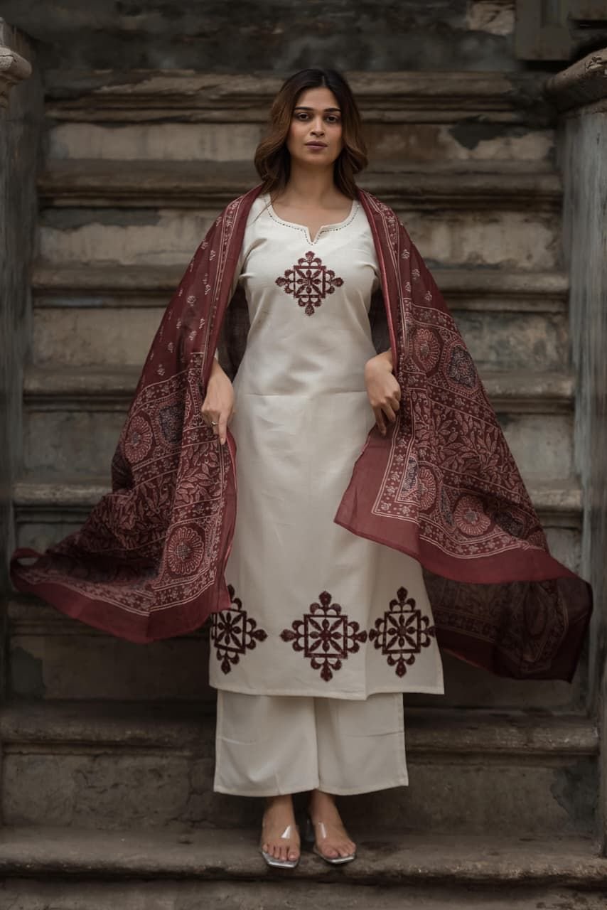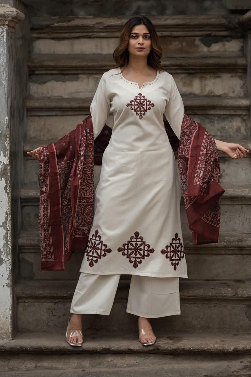The DU-637 Handloom Cotton 3PC Set blends traditional artistry with modern comfort. Crafted from breathable handloom cotton, the outfit offers a graceful A-line silhouette for effortless style.