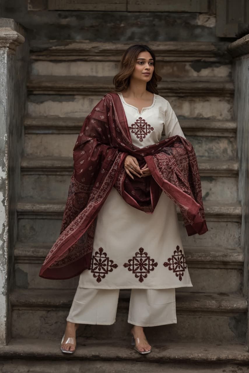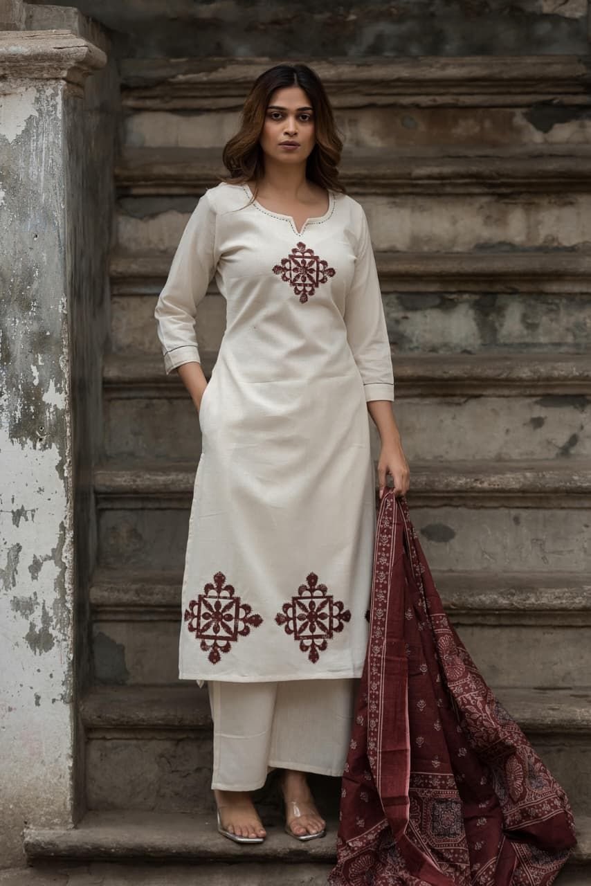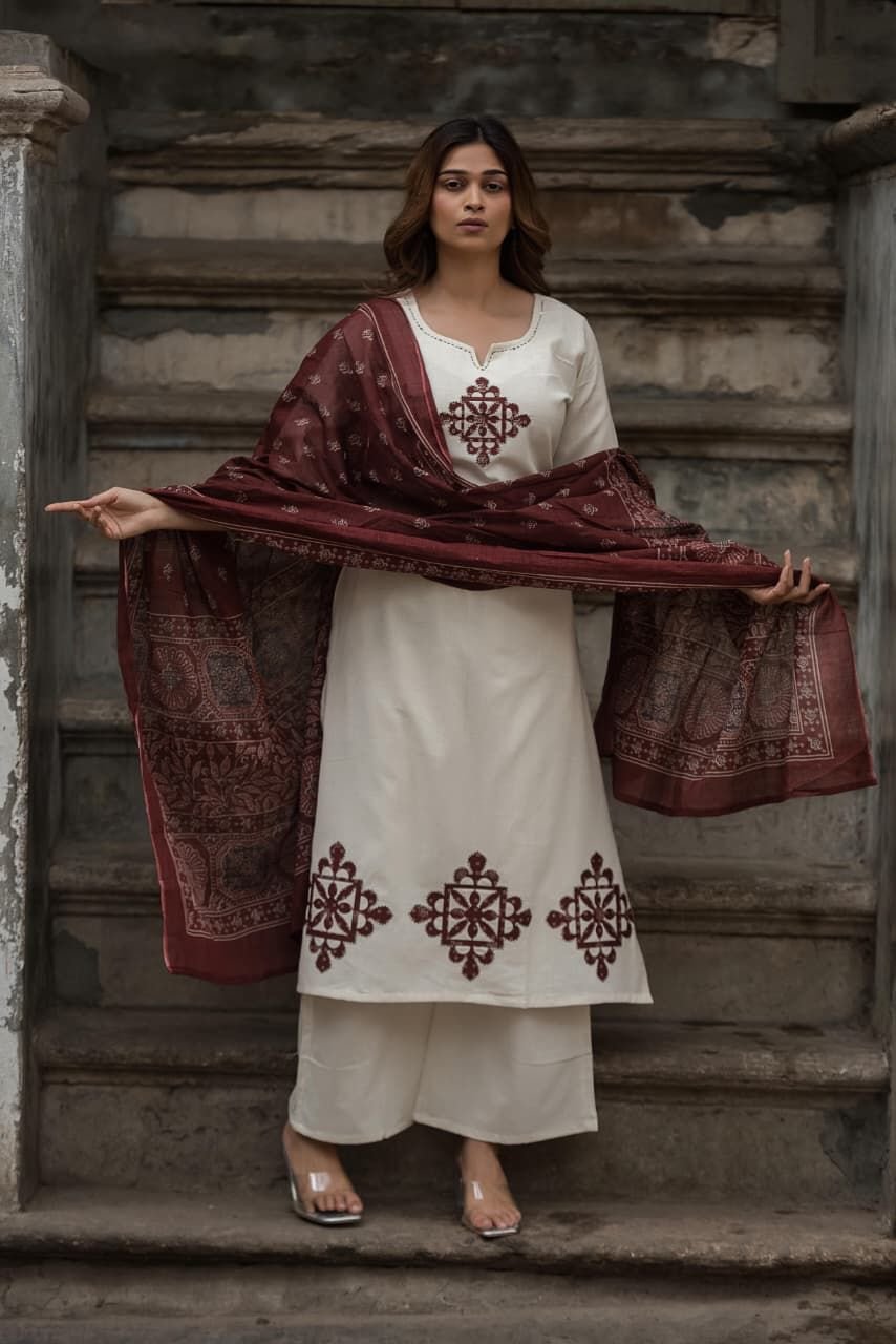The kurta features original Ajrakh patchwork that adds a rich heritage touch, while double side pockets provide everyday practicality. Paired with a lightweight Kota Doriya dupatta, this set is perfect for office wear, casual gatherings, and cultural occasions.