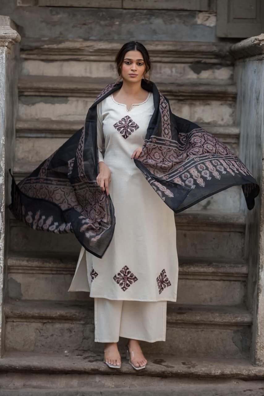 The A-line kurta design creates a flattering silhouette, while double side pockets with work detailing add both style and functionality. The highlight of the outfit is the original Ajrakh patchwork, showcasing traditional artisan craftsmanship.