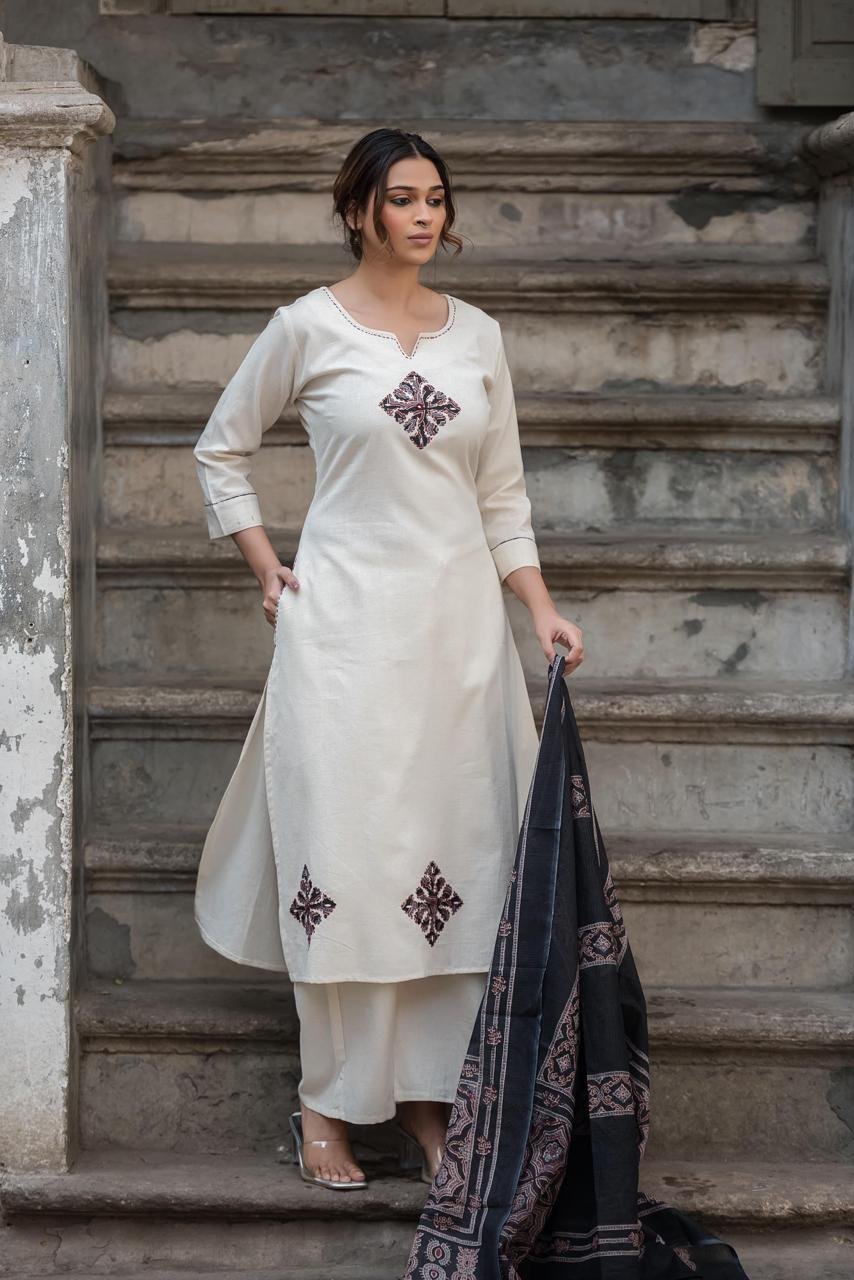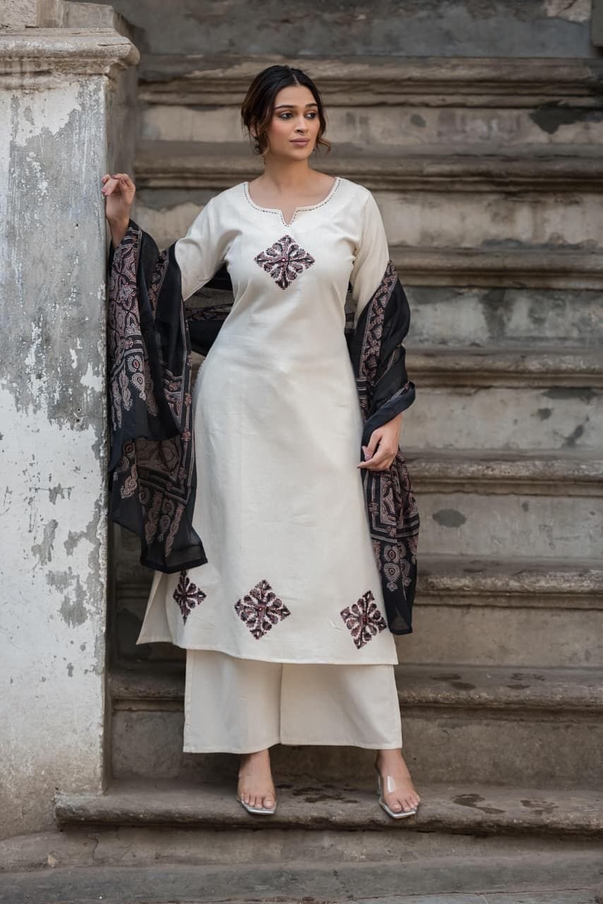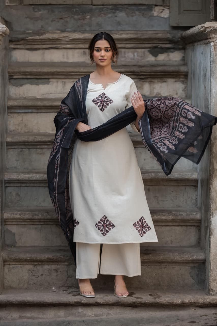 The DU-006 Handloom 3PC Set beautifully blends traditional textile art with modern comfort. Crafted from handloom cotton fabric, the outfit ensures breathability and a comfortable fit.