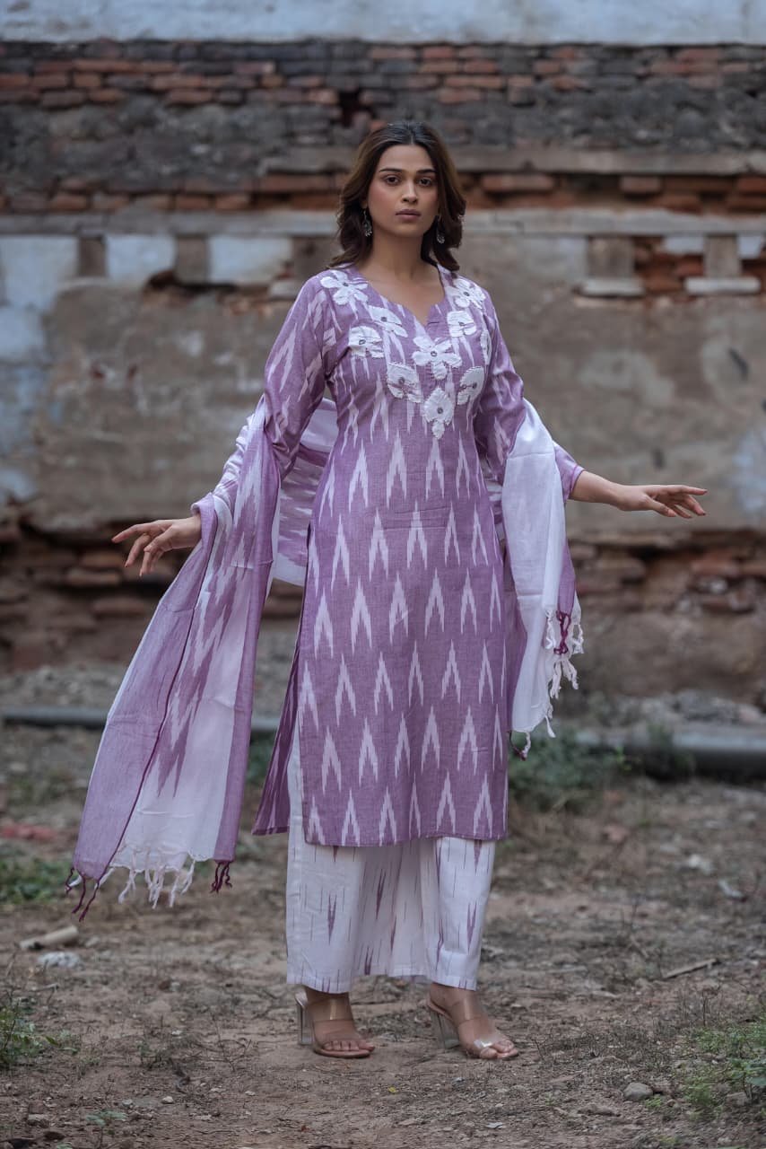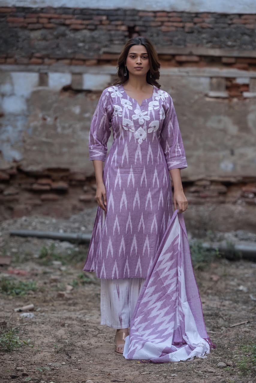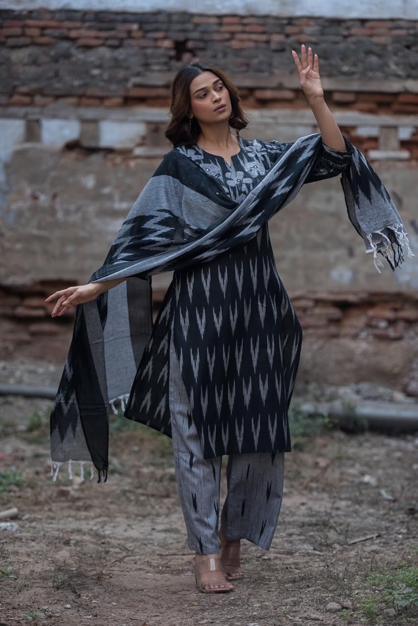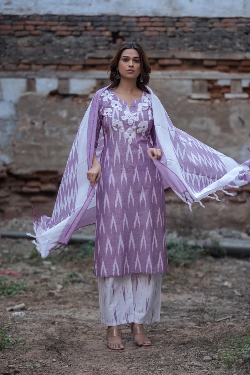 Handloom Ikkat Cotton 3PC Suit Set with Appliqué Work