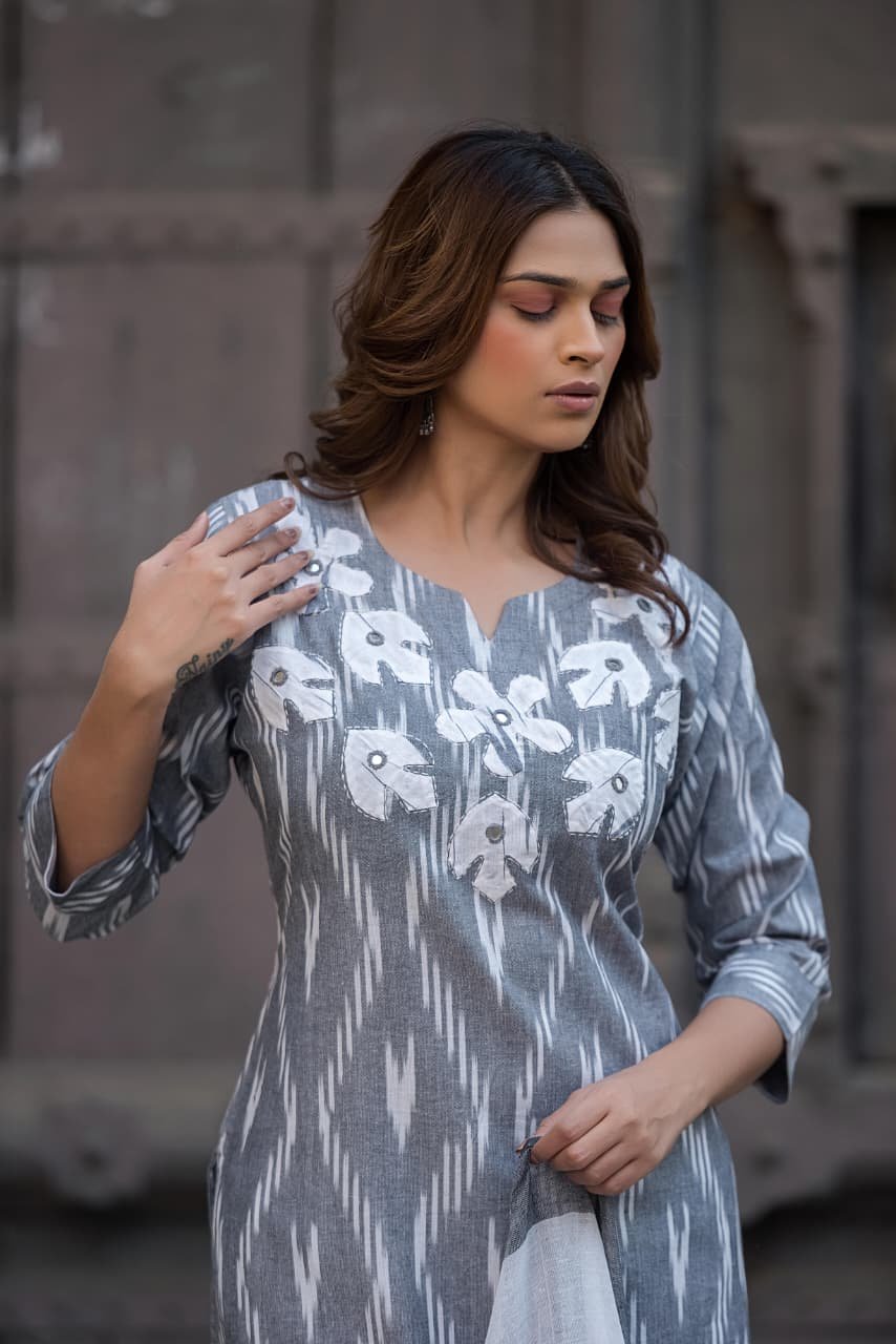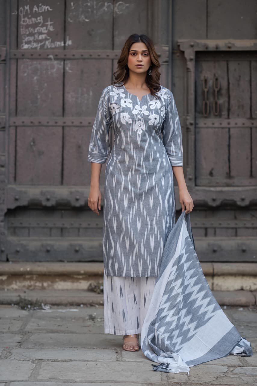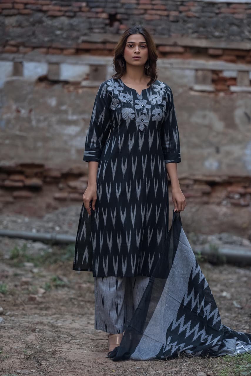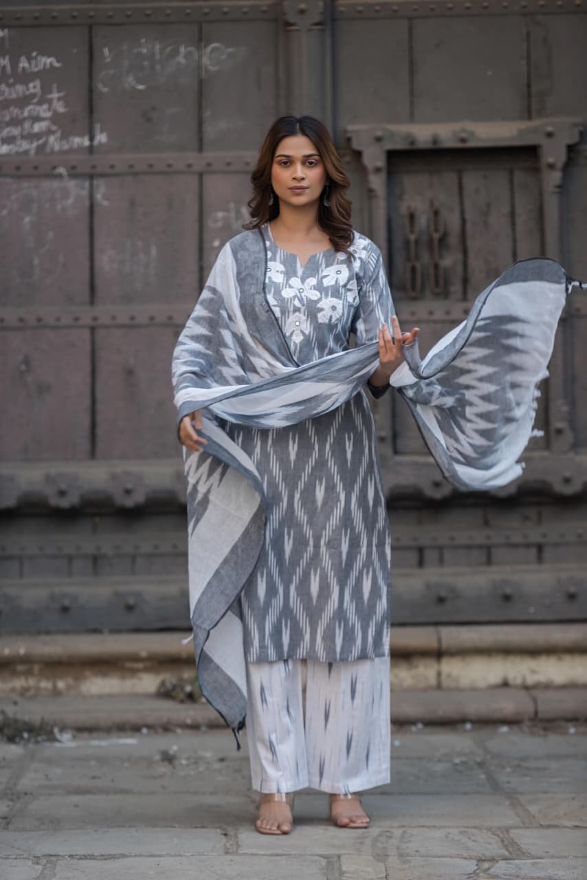 Handloom Ikkat Cotton 3PC Suit Set with Appliqué Work