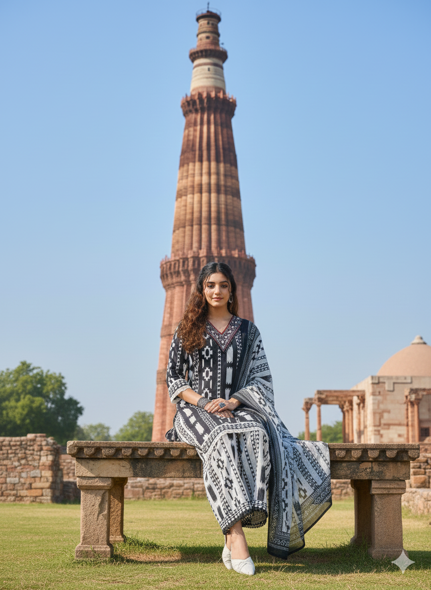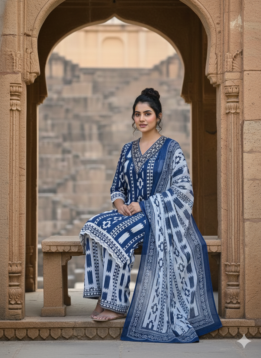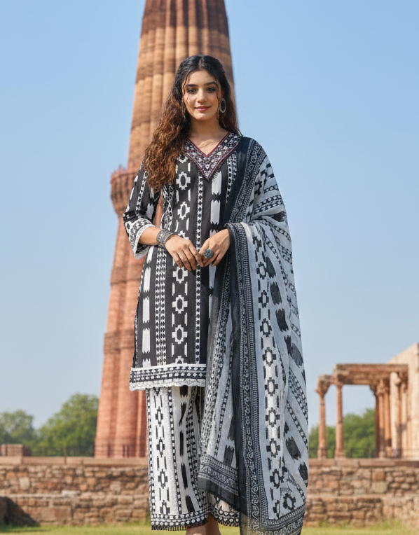It comes paired with a wide palazzo, adding flair and comfort to your look. With just the right amount of detail and timeless structure, this set brings together traditional work with modern silhouette.