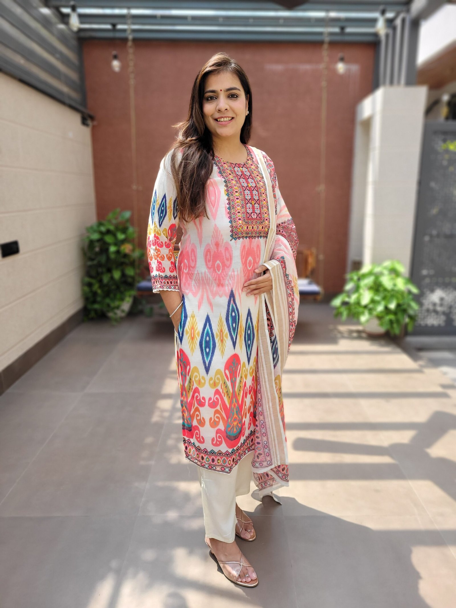 The DU-594 Ikkat Print 3PC Suit Set is crafted from soft, breathable linen, offering a natural feel and all-day comfort. Featuring intricate Kantha stitch and mirror work, this set brings a touch of artisanal charm while reflecting timeless Indian craftsmanship.