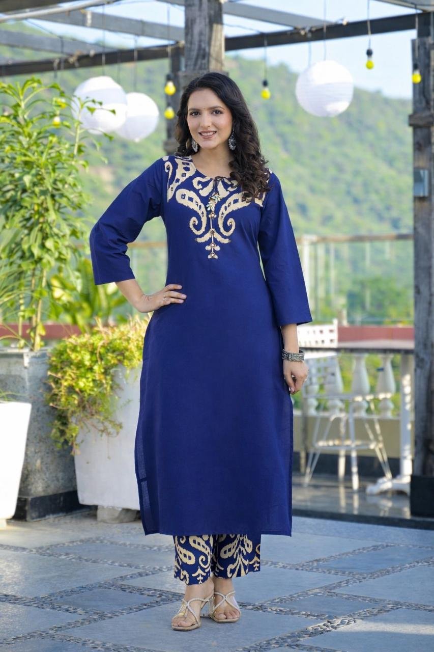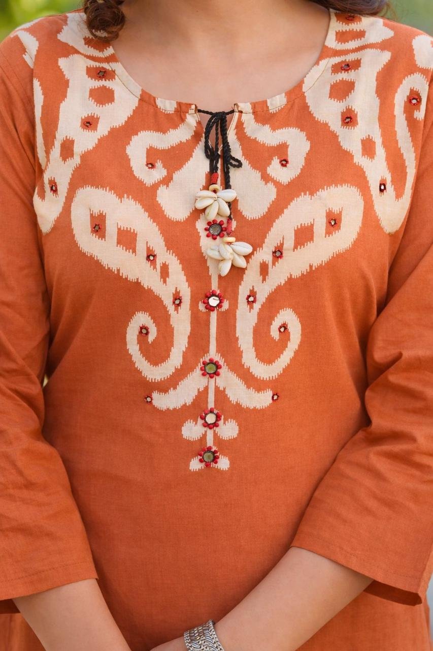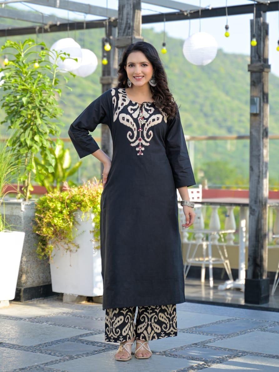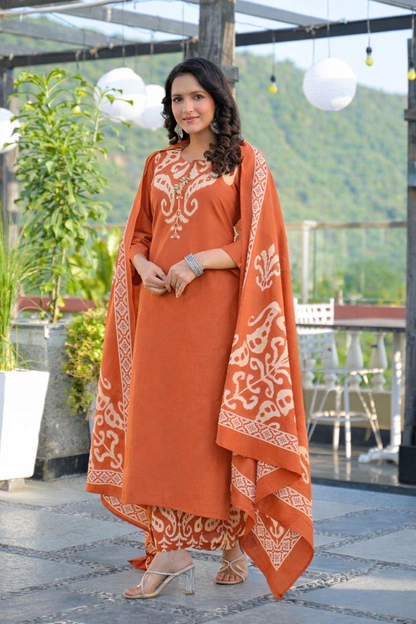 The DU-145 Ikkat Print 3PC Set showcases traditional patterns paired with mirror and handwork detailing on the yoke. Crafted from breathable cotton fabric, it’s ideal for daily ethnic wear with a cultural touch.
