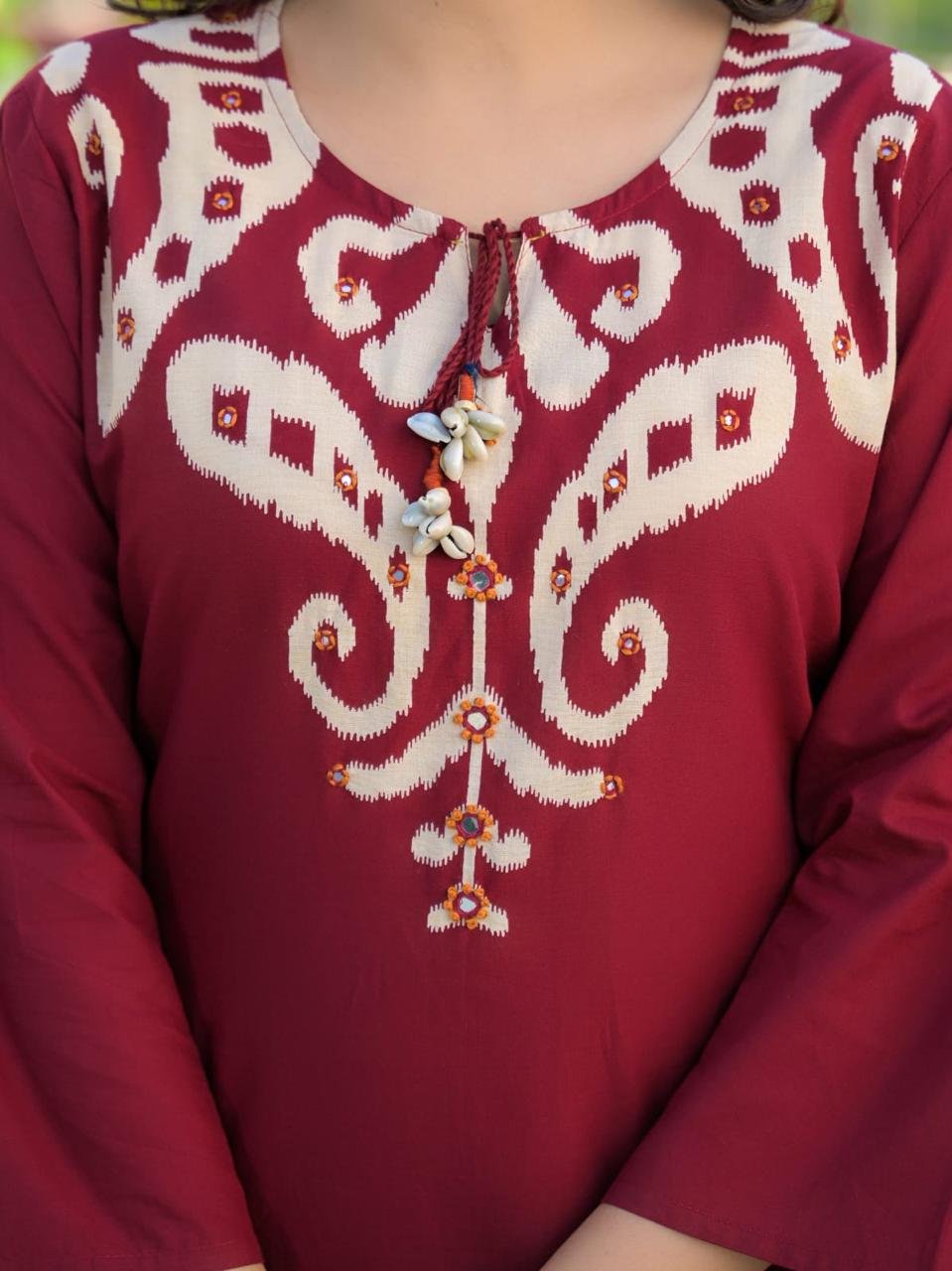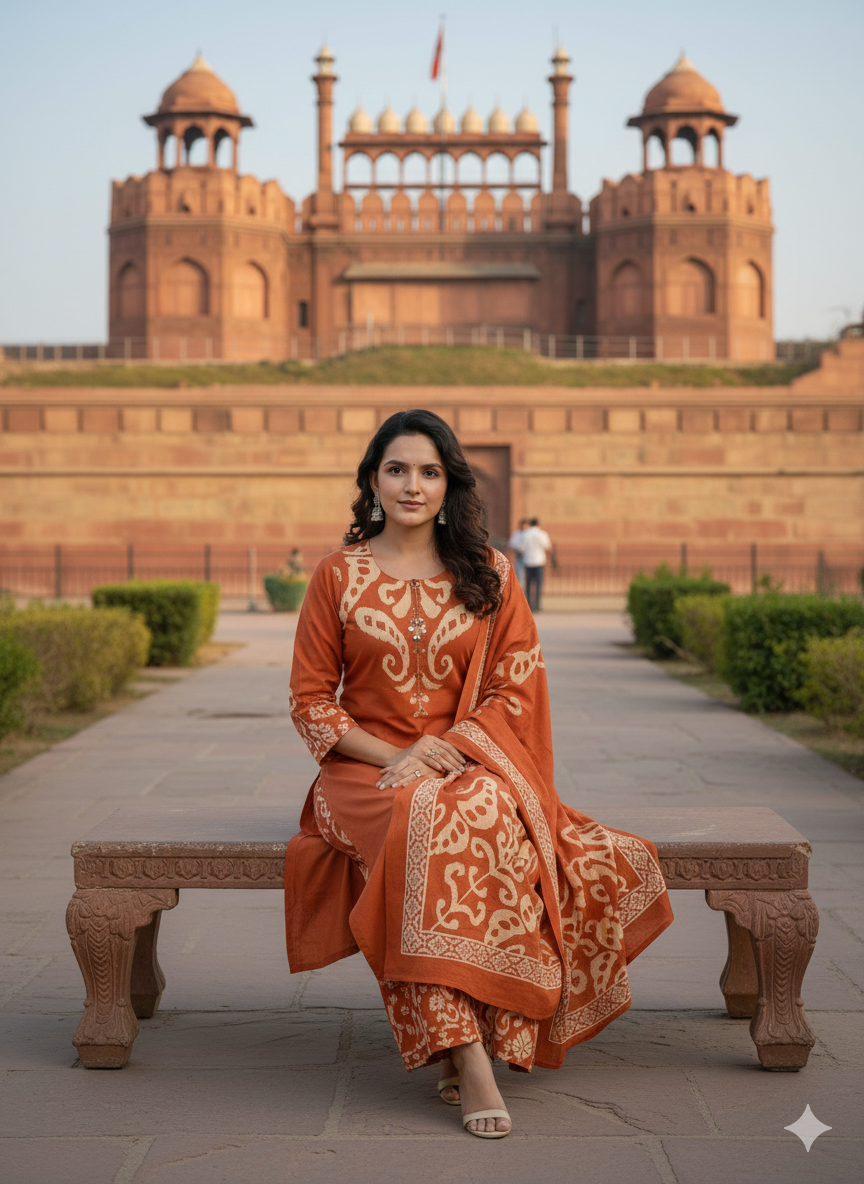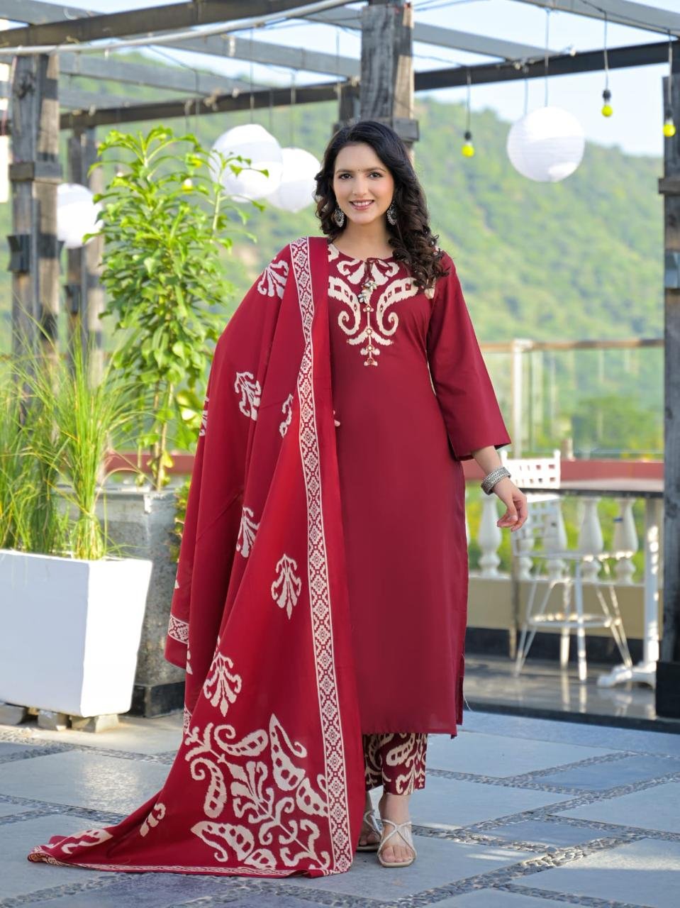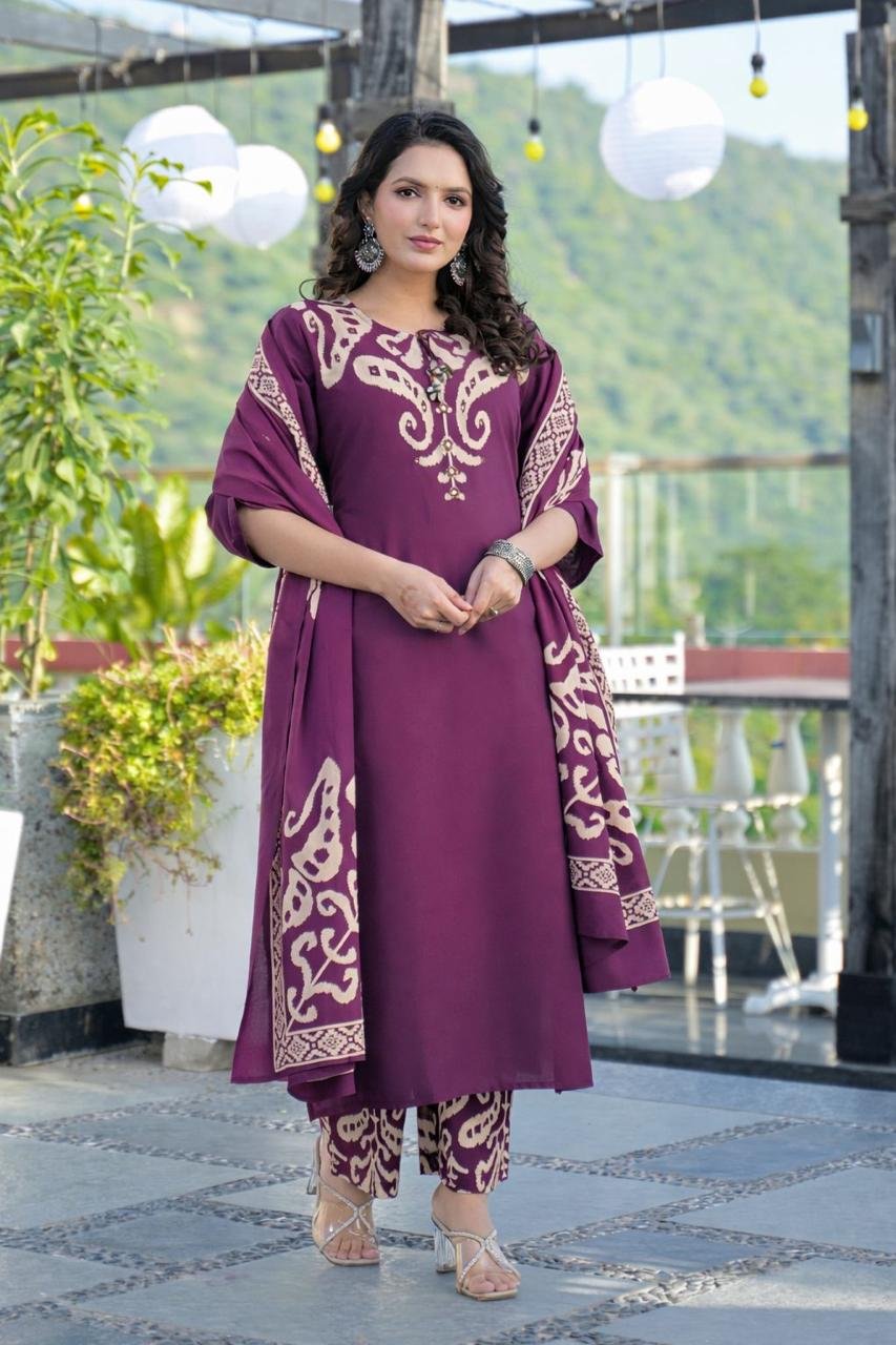 The DU-145 Ikkat Print 3PC Set showcases traditional patterns paired with mirror and handwork detailing on the yoke. Crafted from breathable cotton fabric, it’s ideal for daily ethnic wear with a cultural touch.