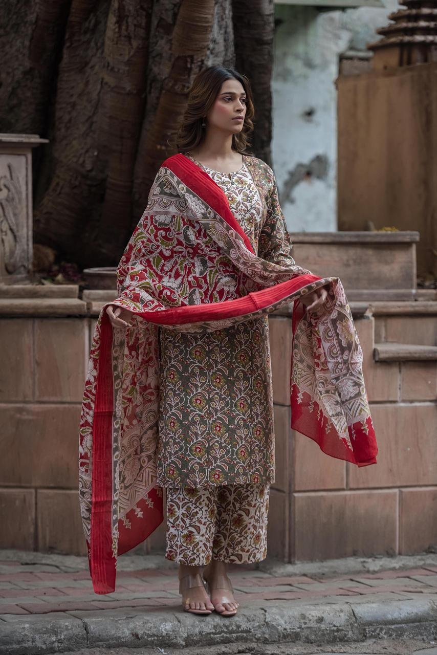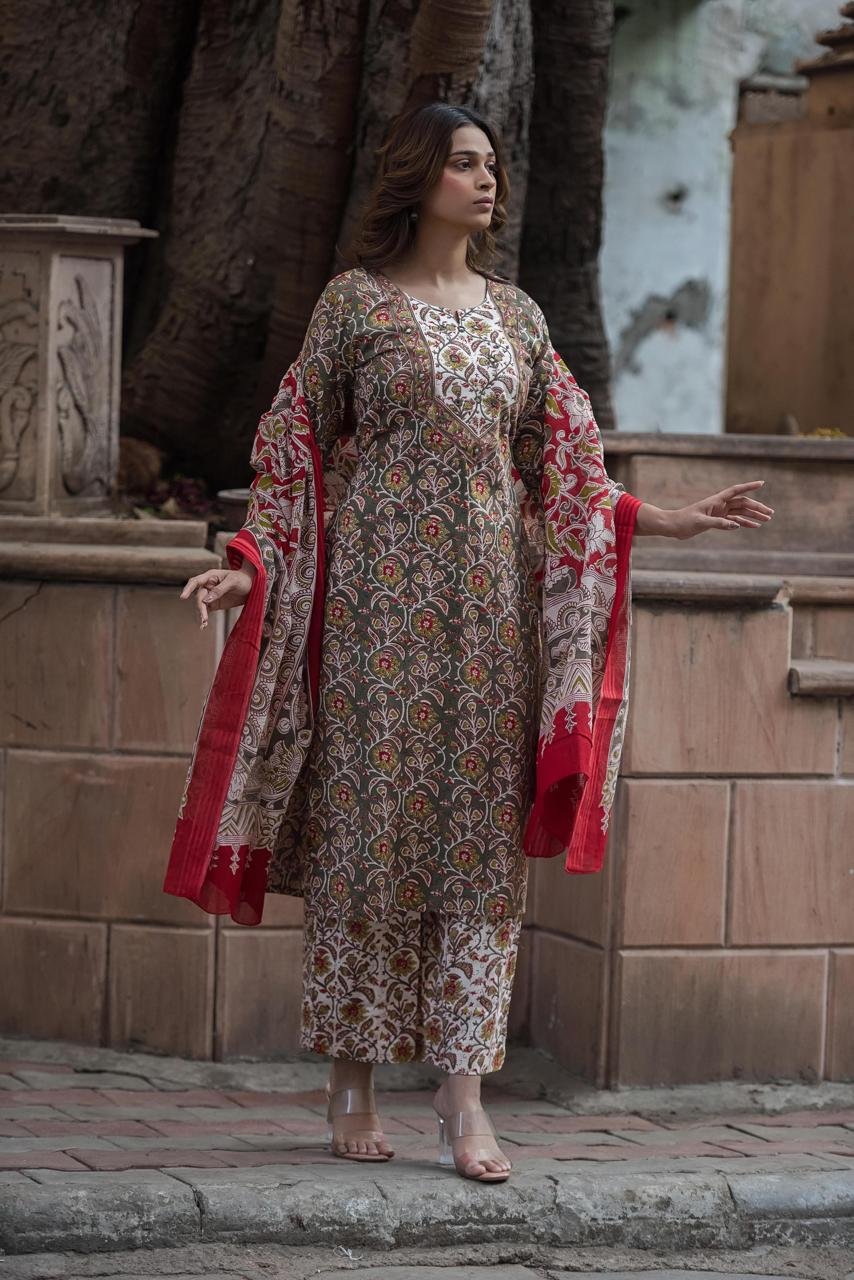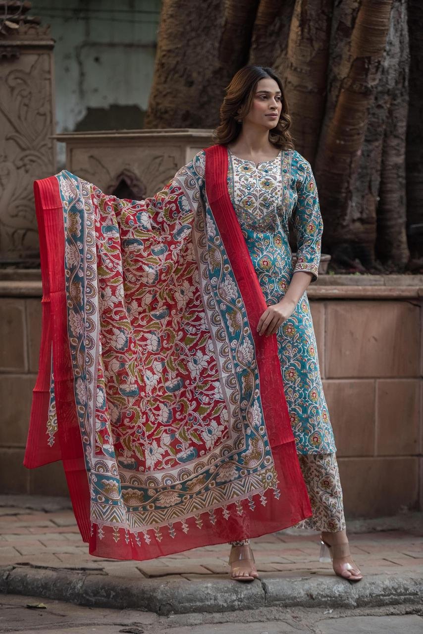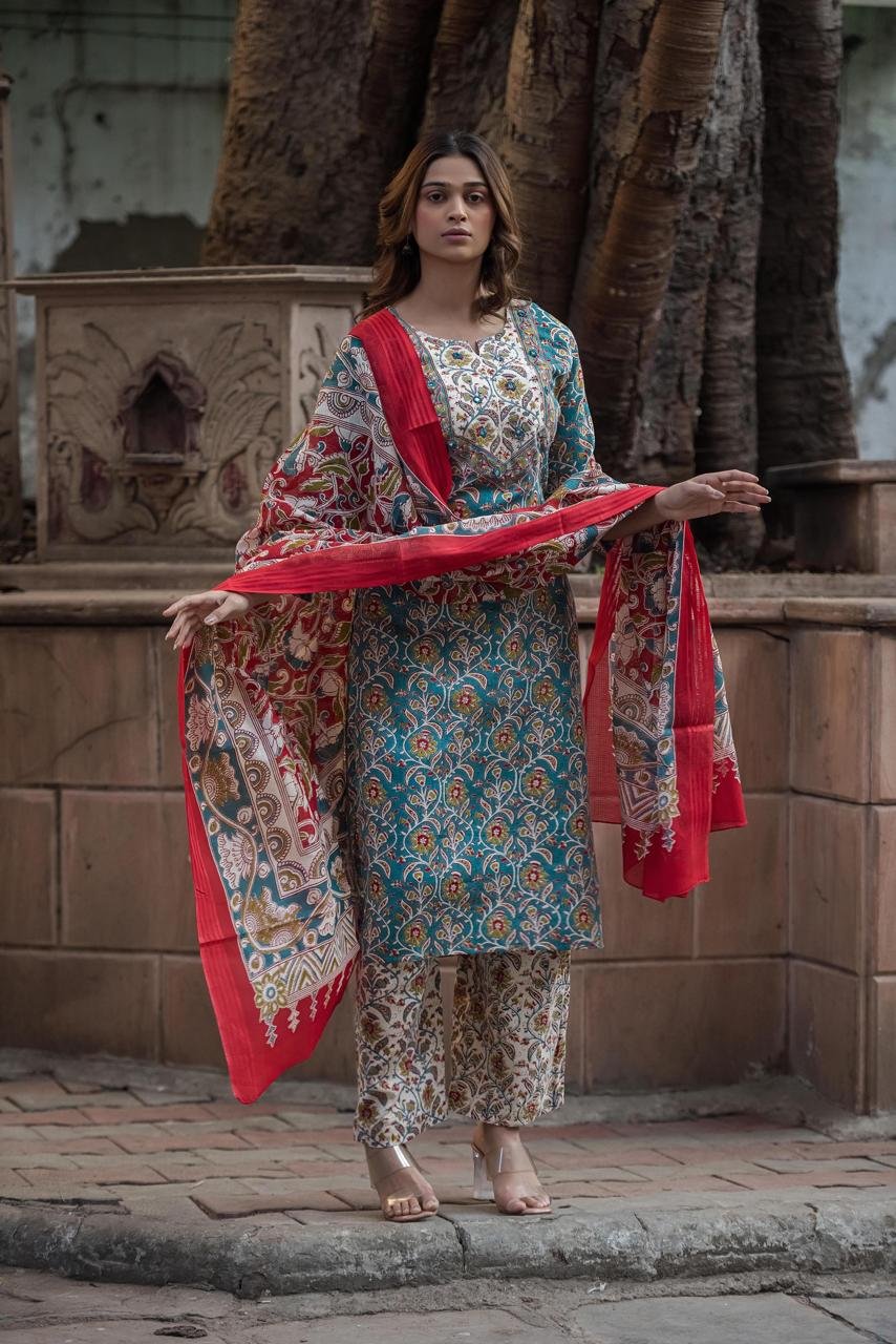The kurta features delicate mirror work on the yoke, adding subtle sparkle and ethnic charm. Paired with a lightweight Kota check dupatta, the set creates a perfect balance of tradition and modern styling—ideal for festive daytime events, parties, and special occasions.