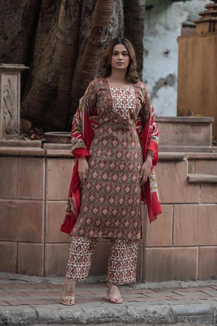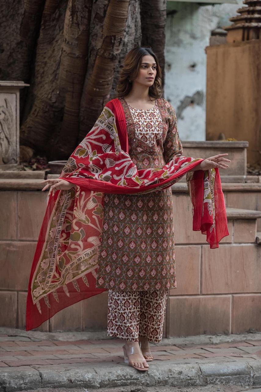 Enhanced with mirror work on the yoke and paired with a Kota check dupatta, this suit set is perfect for festive occasions, celebrations, and evening gatherings where effortless elegance is desired.