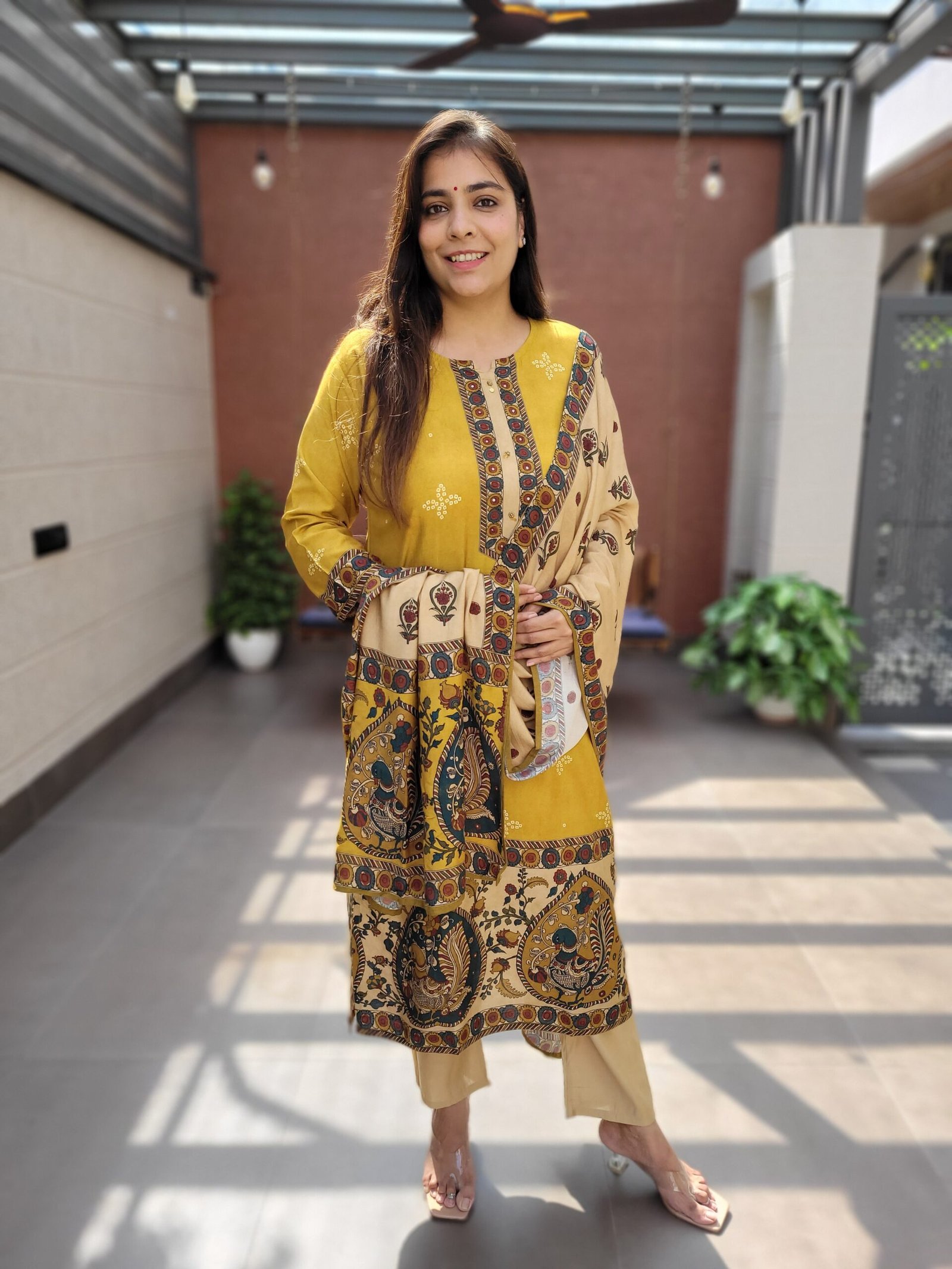 The DU-170 Kalamkari 3PC Suit Set is crafted from soft, breathable pure muslin, offering lightweight comfort with a natural feel. The kurta features delicate sequins and beads work, complemented by a beautifully printed Kalamkari dupatta on pure muslin, blending traditional artistry with contemporary style.