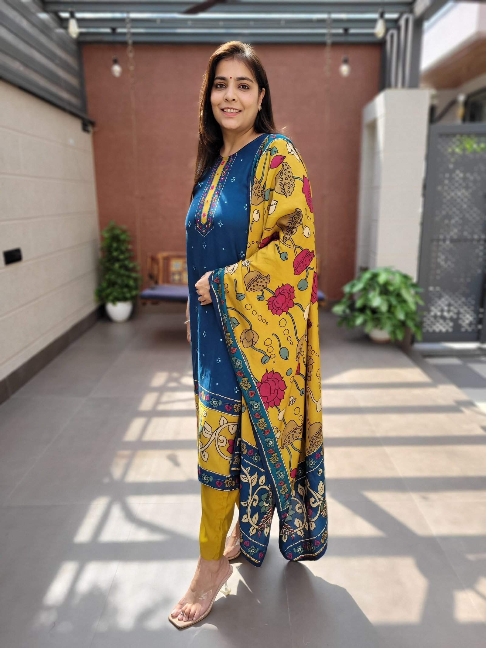 The DU-422 Kalamkari 3PC Suit Set is crafted from soft, breathable pure muslin, offering lightweight comfort and a luxurious feel. The kurta features intricate thread, mirror, and sequins work, complemented by a beautifully printed Kalamkari dupatta on pure muslin, reflecting traditional artistry with a contemporary touch.