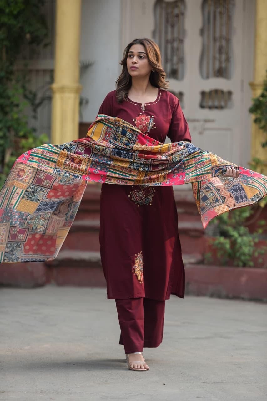 The kurta showcases exquisite Kalamkari-inspired detailing enhanced with delicate appliqué and handwork, adding texture and artistic depth to the outfit. A standout feature of this design is the double side pockets, thoughtfully crafted with embellishment—offering both style and practicality without compromising aesthetics.