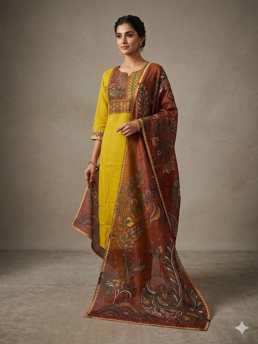 The kurta is highlighted with sequins work, paired beautifully with a Kalamkari dupatta for a rich ethnic finish. Ideal for festive wear, family functions, and elegant casual outings.