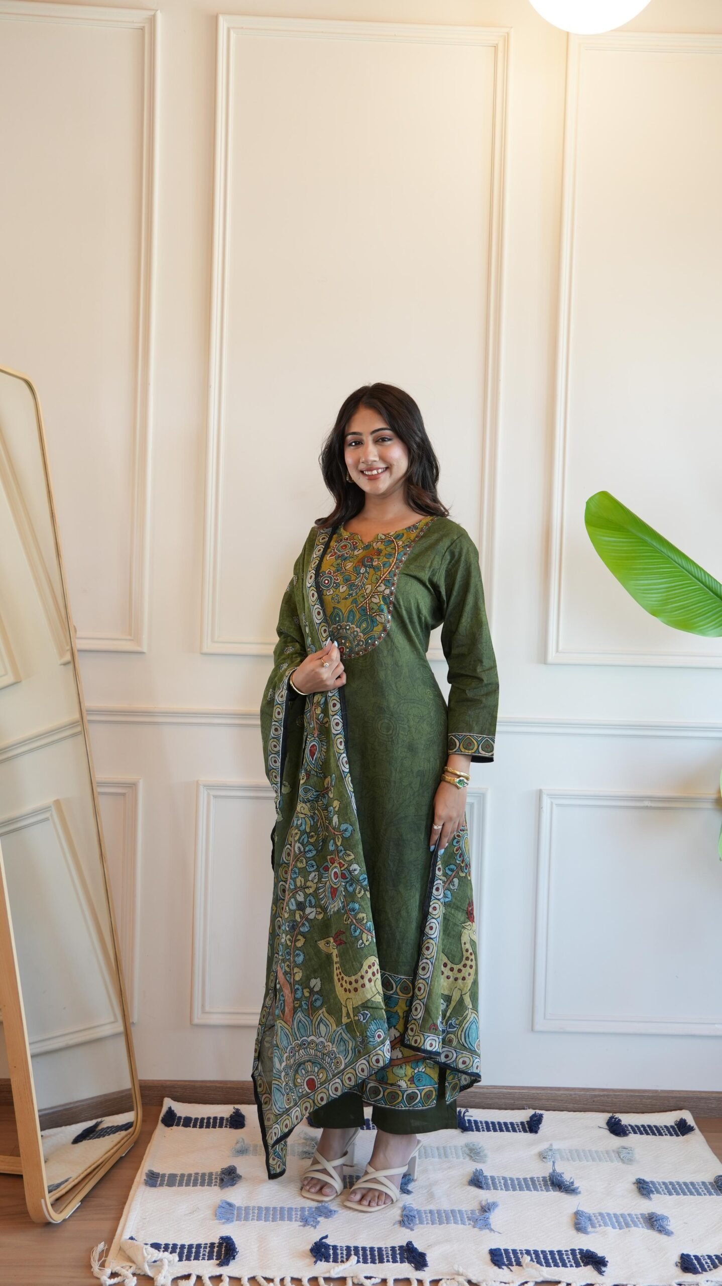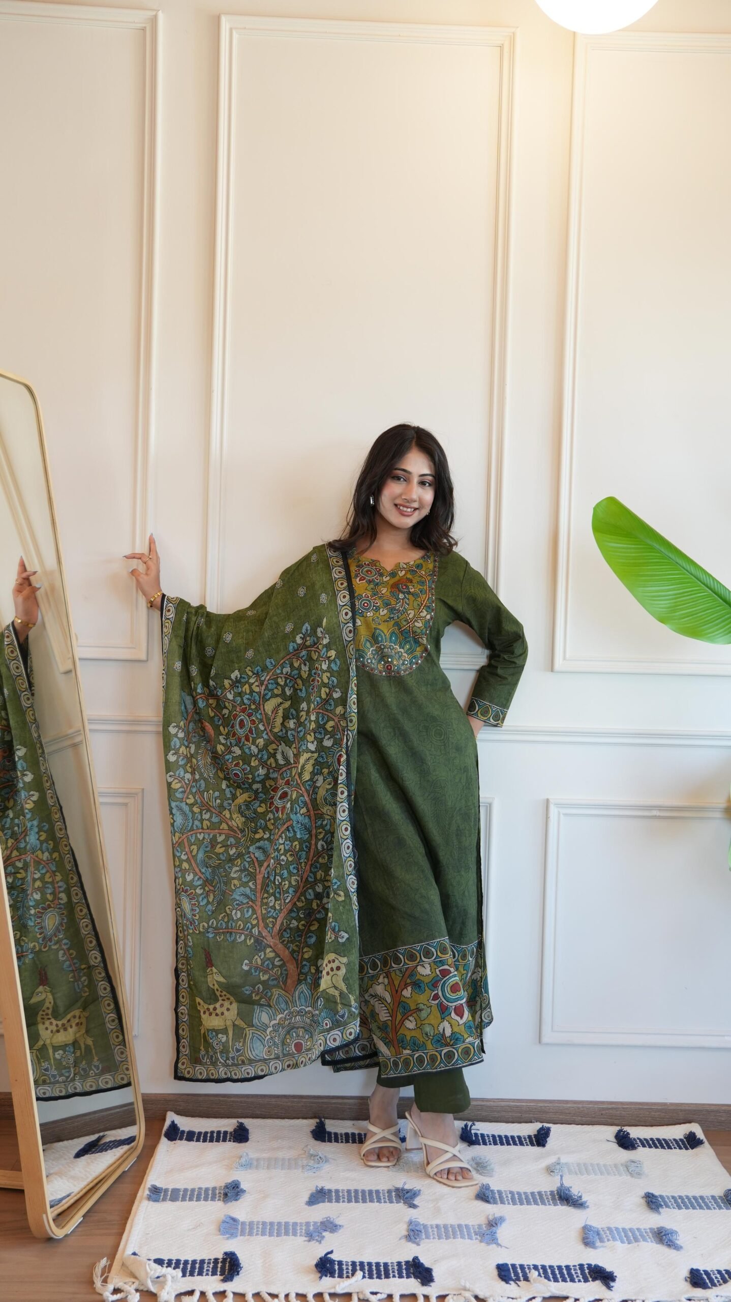 The DU-681 Kalamkari 3PC Set blends traditional artistry with everyday comfort. Crafted from soft cotton fabric, this outfit offers breathable ease with a graceful ethnic look.
