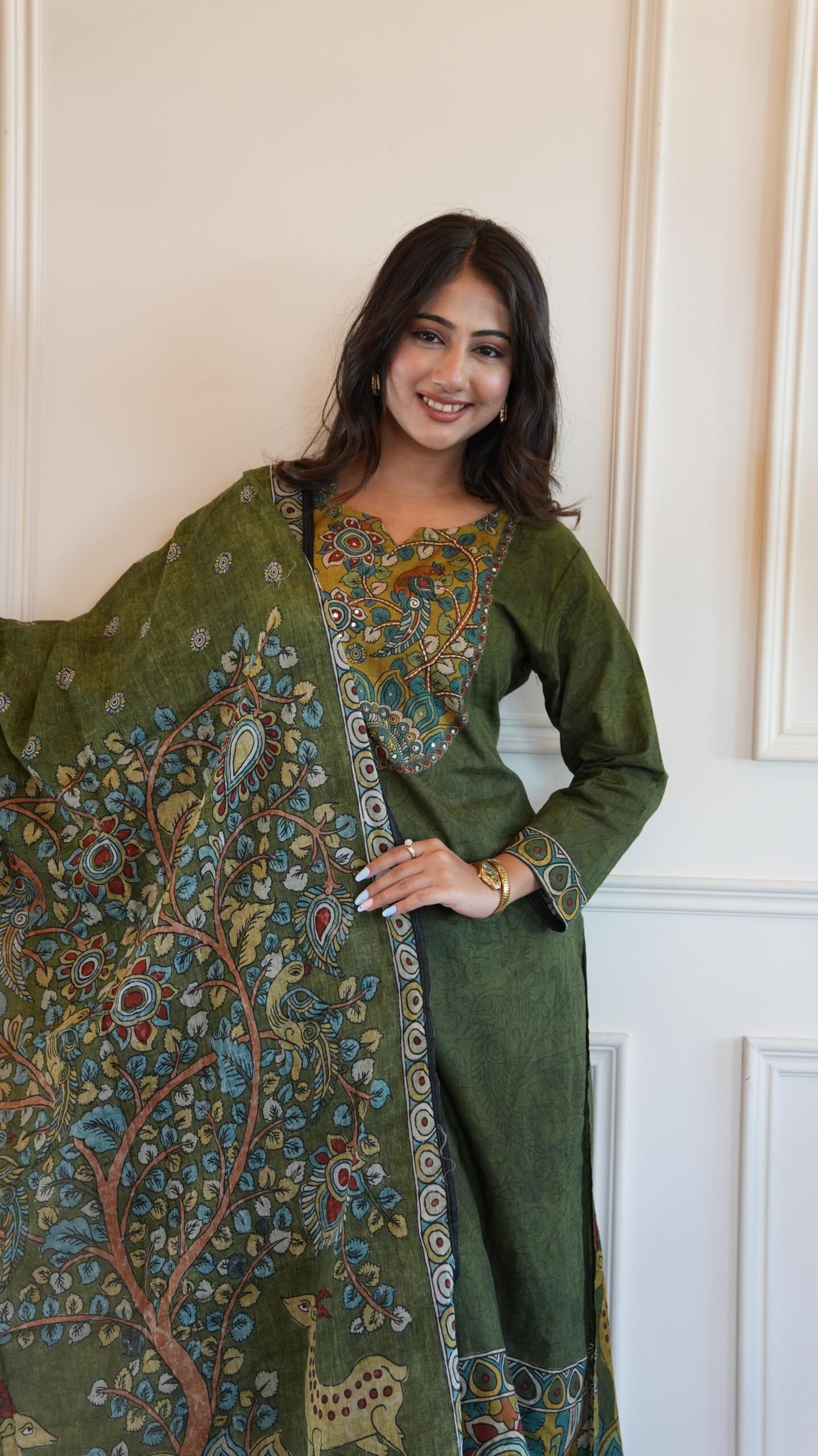 The kurta features Kalamkari-inspired patterns enhanced with delicate handwork on the yoke, adding a handcrafted charm to the ensemble. Perfect for office wear, casual outings, cultural events, and daytime gatherings.