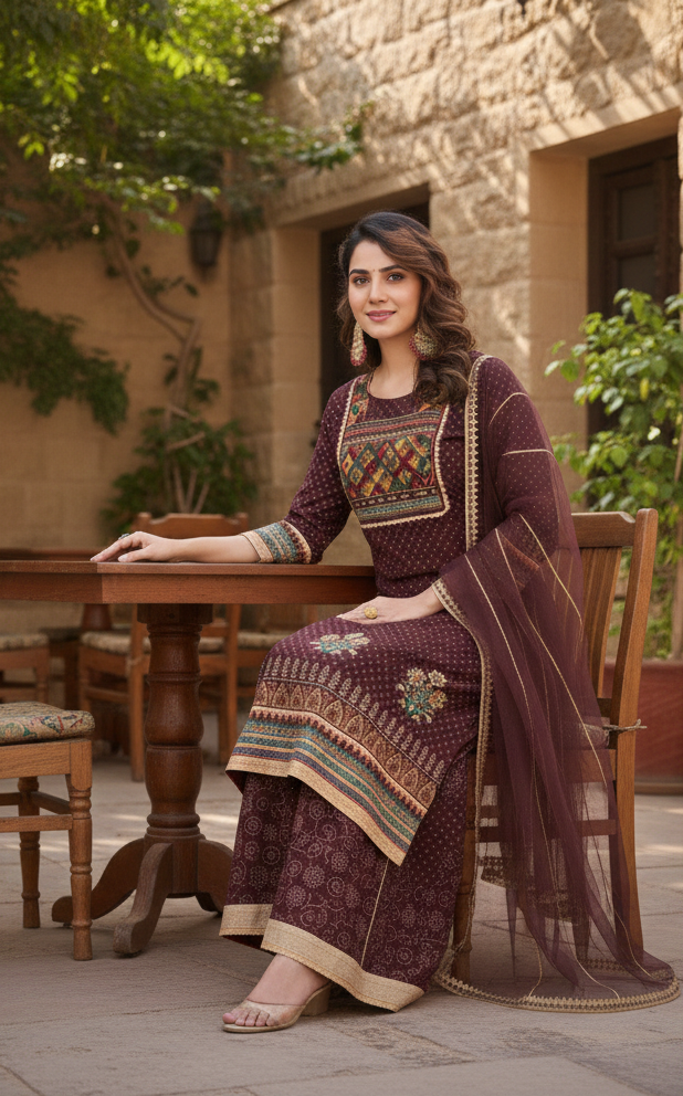 This sharara set is ideal for women who appreciate classic Indian textiles blended with timeless festive styling.