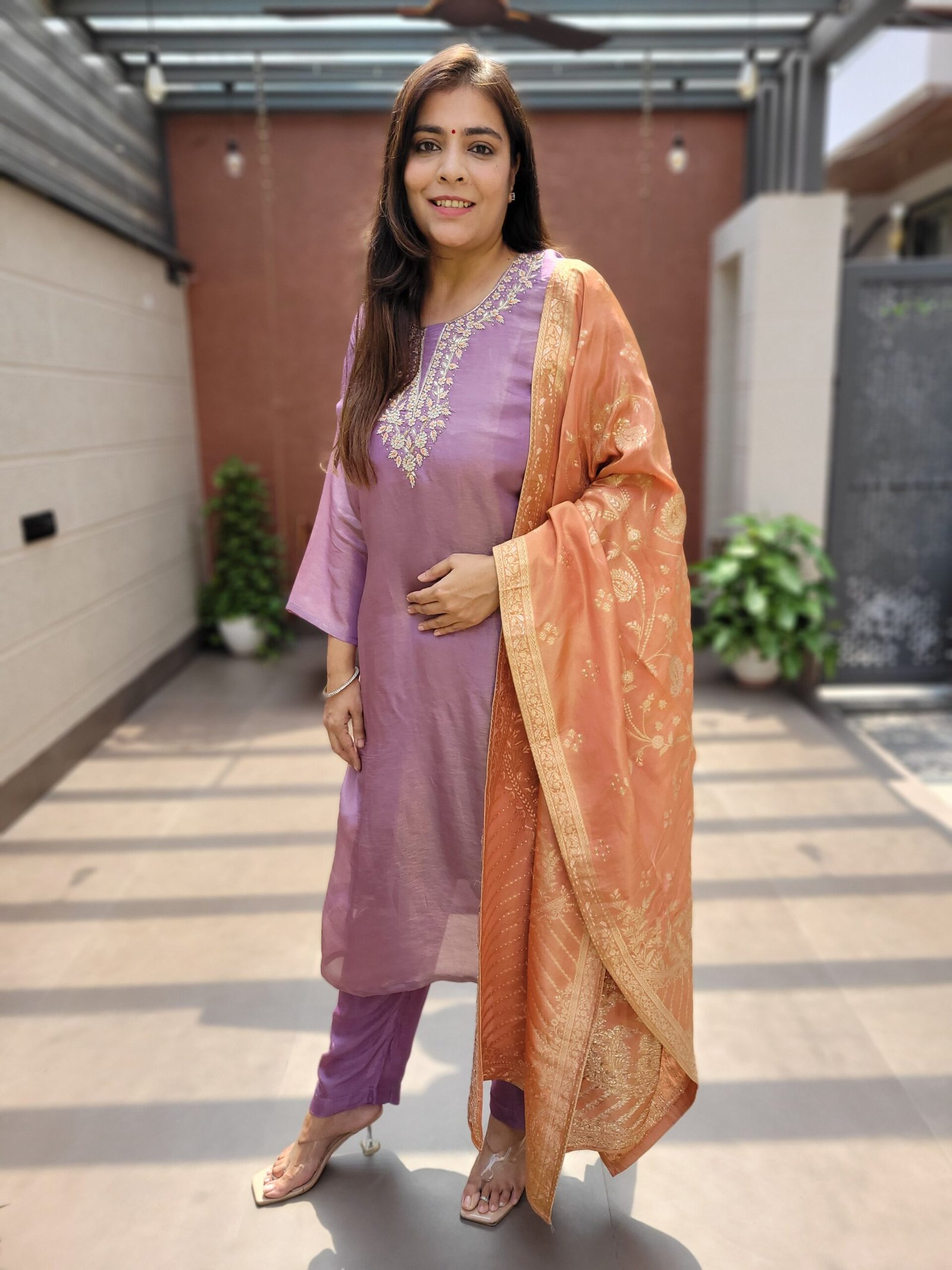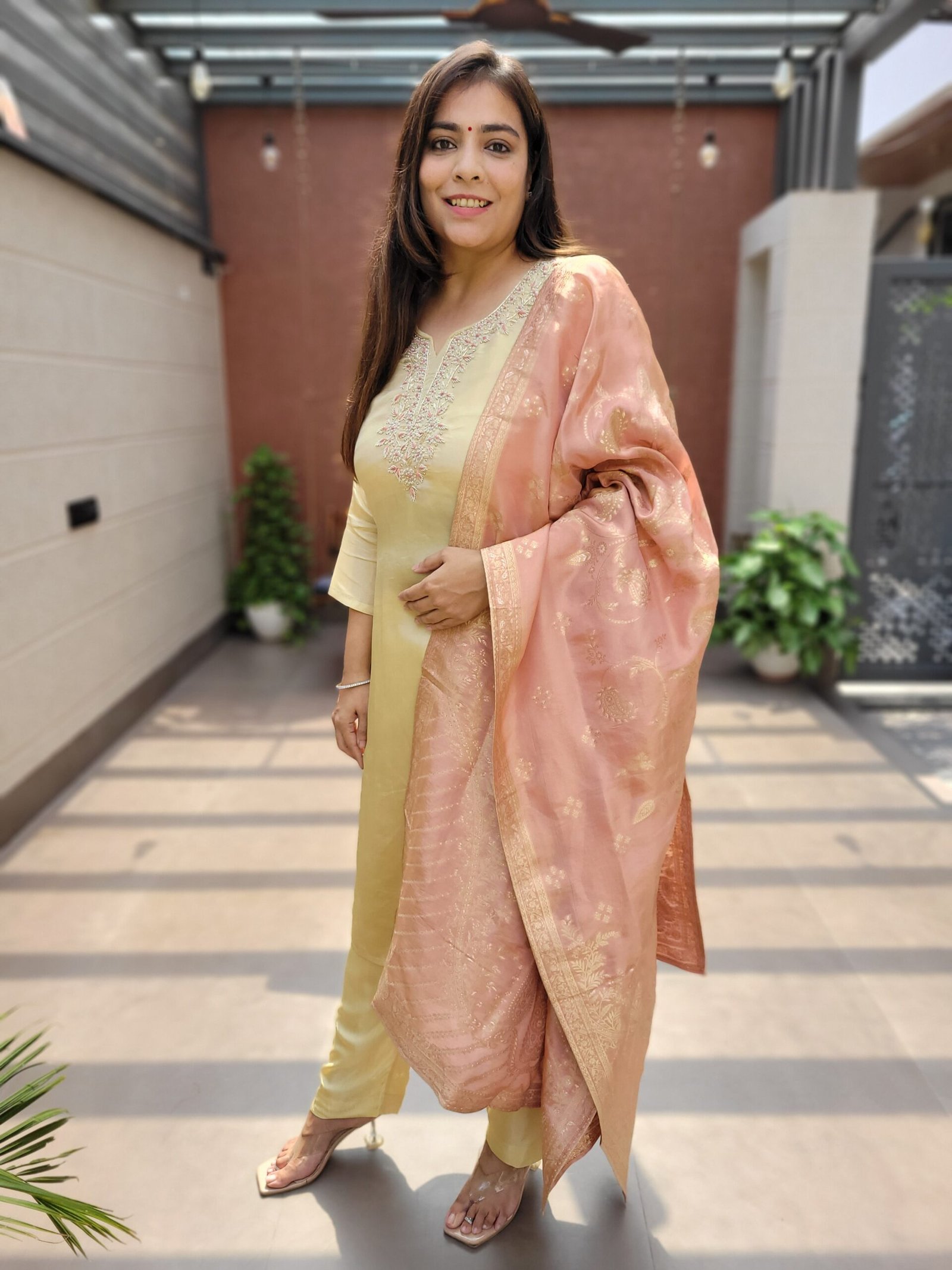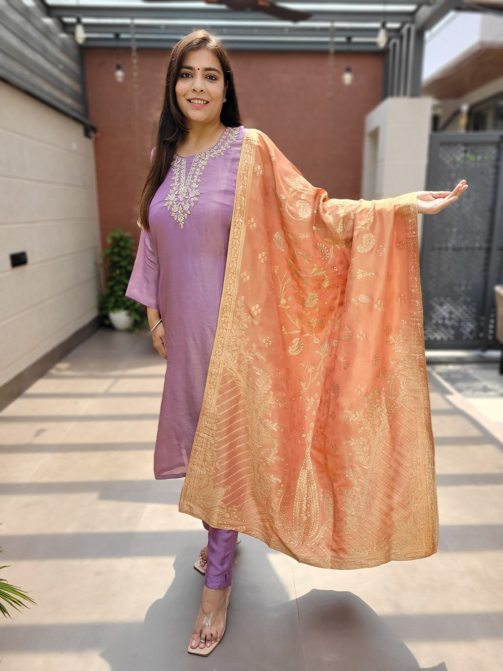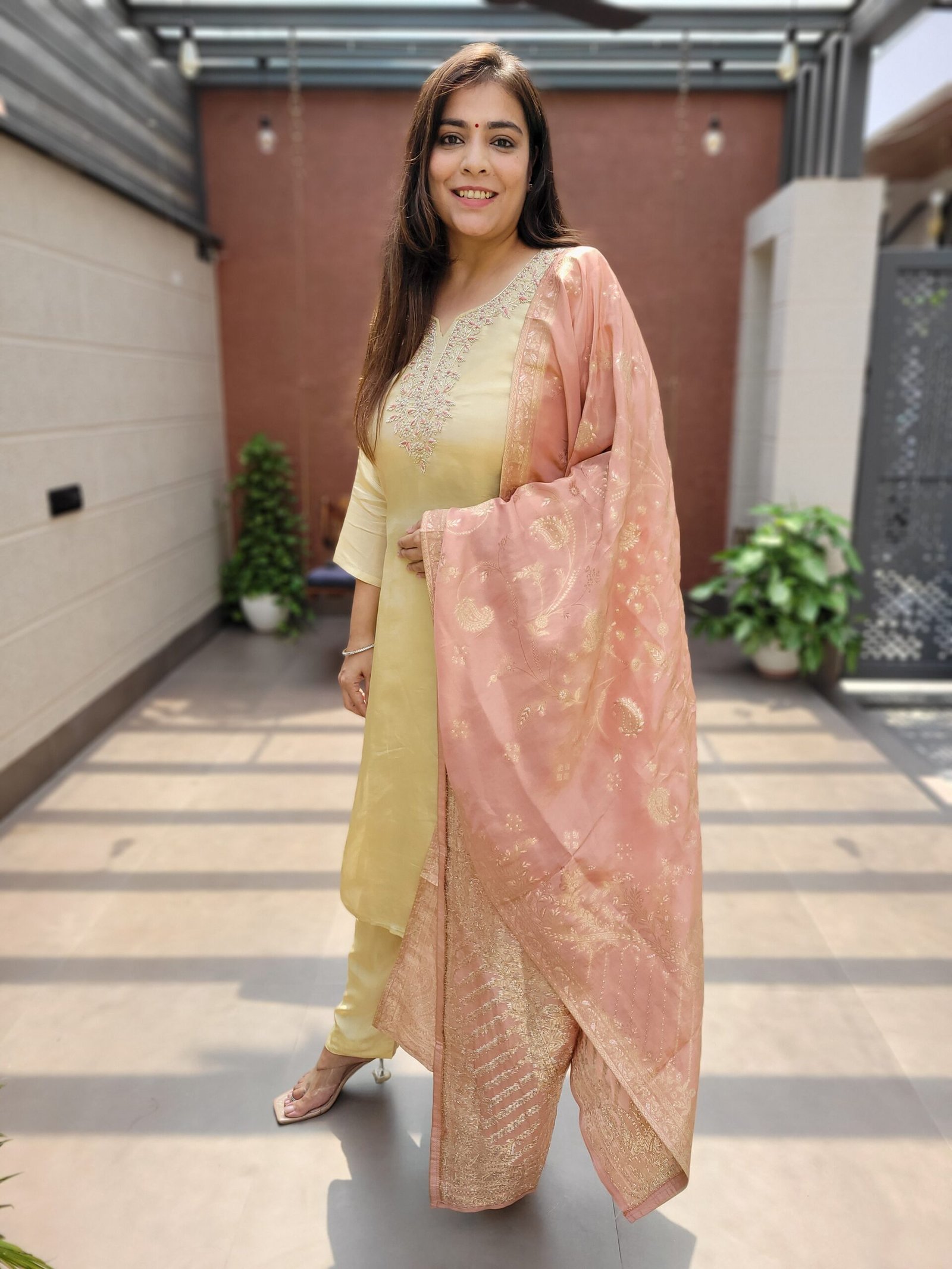 The kurta features intricate zardozi embroidery, adding opulent detailing and a regal touch to the ensemble. Complemented by a contrast Banarasi dupatta, the set combines sophistication with vibrant ethnic charm, while the cotton lining ensures comfort for extended wear.