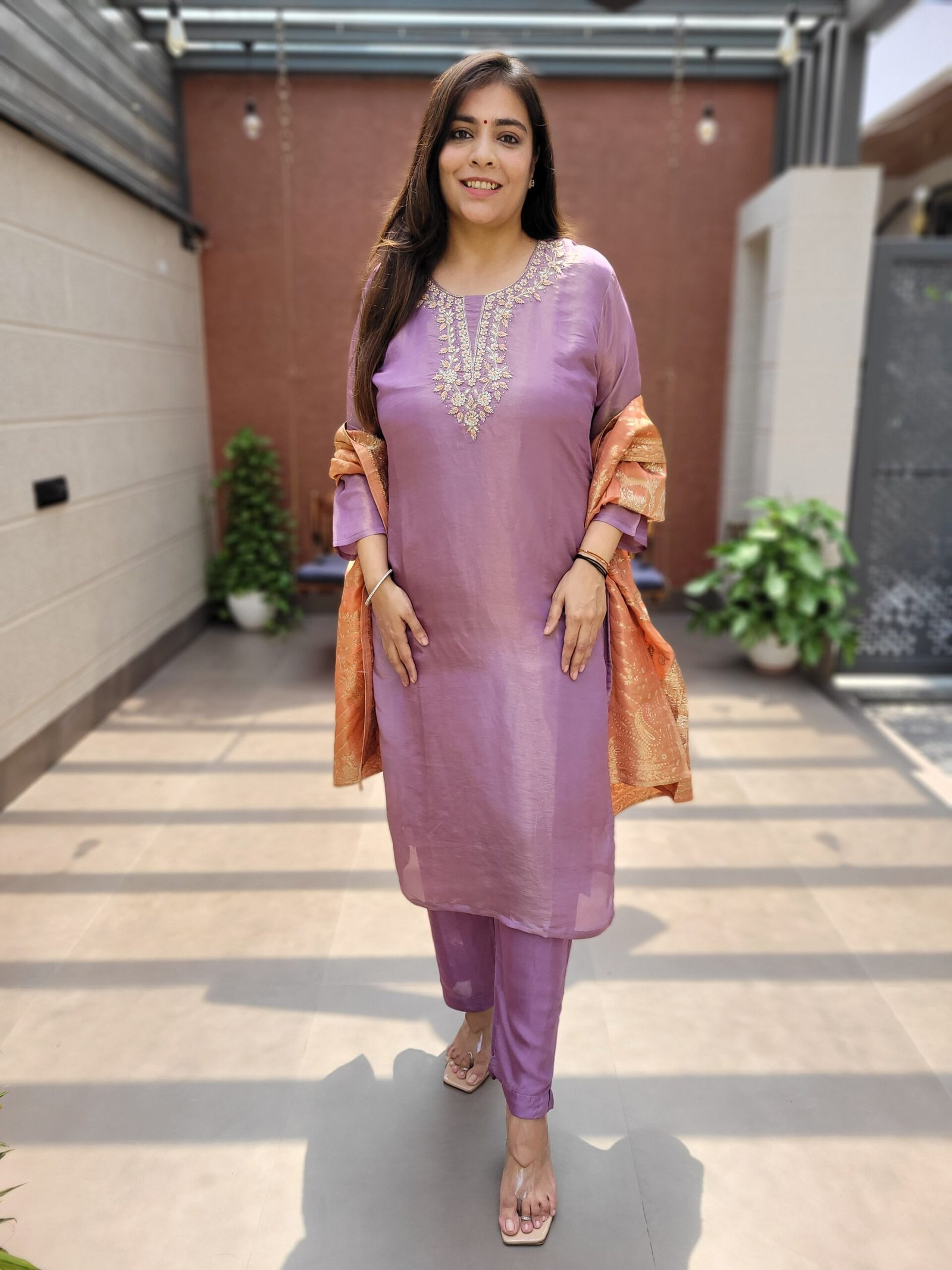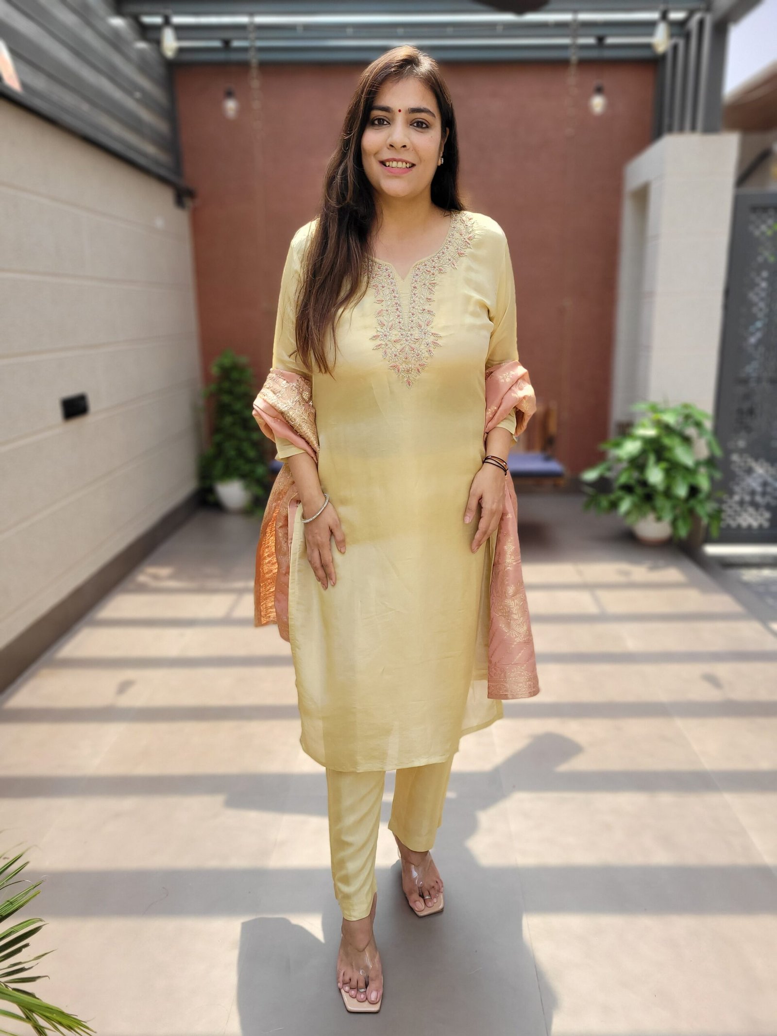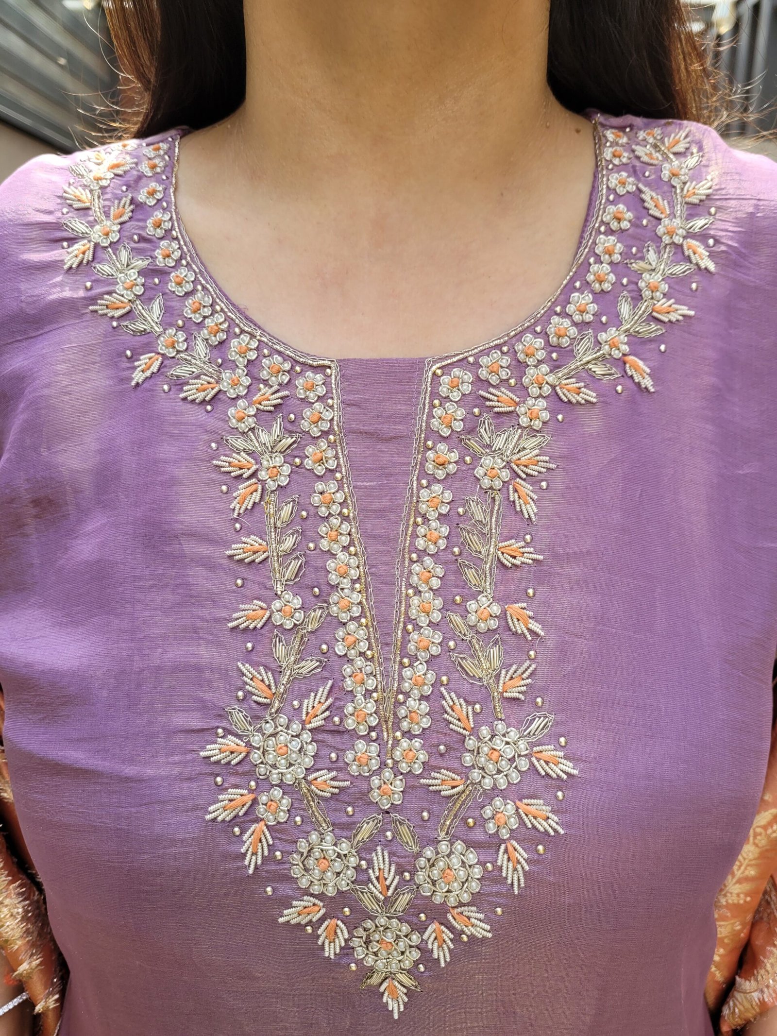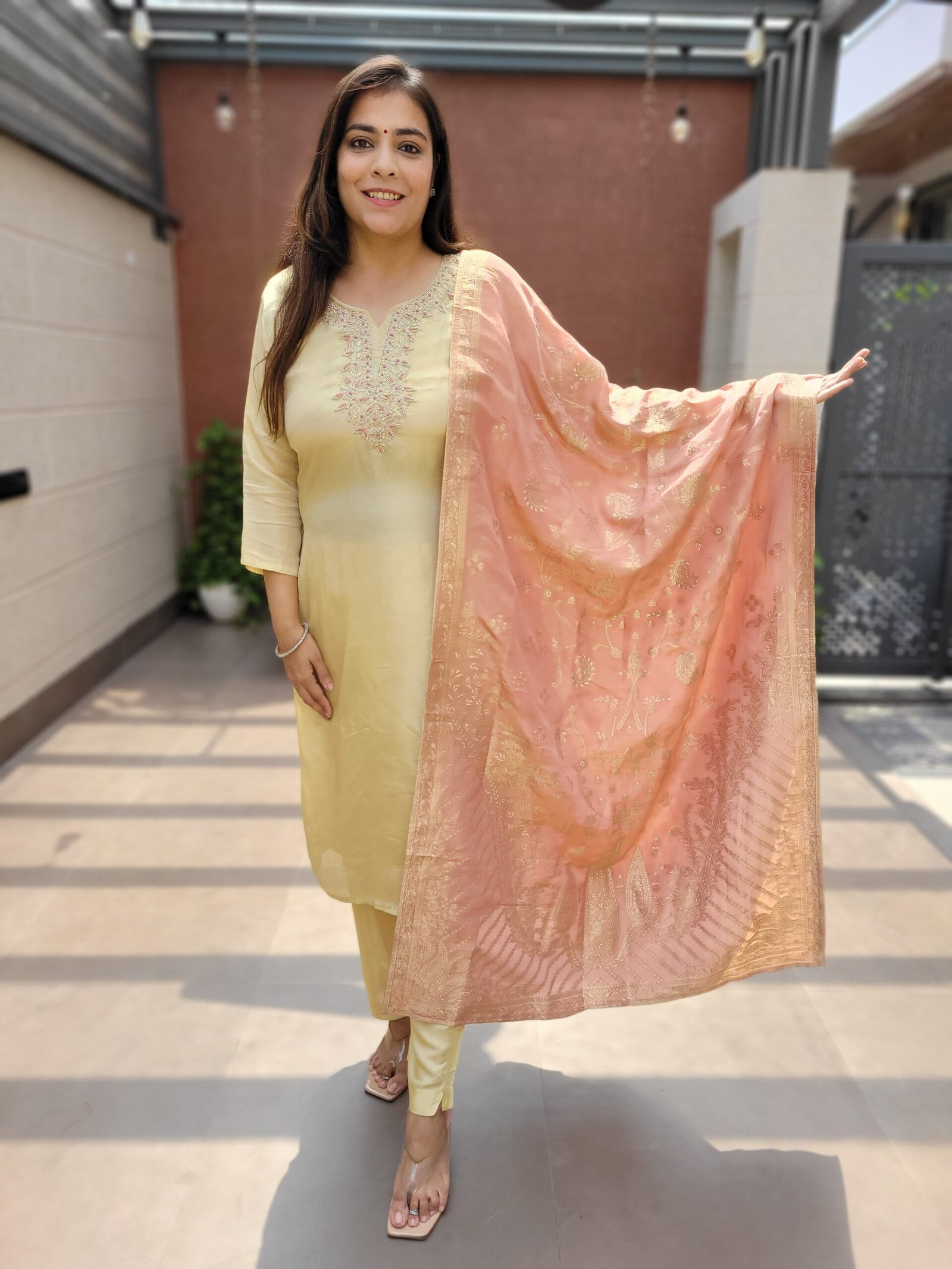 The kurta features intricate zardozi embroidery, adding opulent detailing and a regal touch to the ensemble. Complemented by a contrast Banarasi dupatta, the set combines sophistication with vibrant ethnic charm, while the cotton lining ensures comfort for extended wear.
