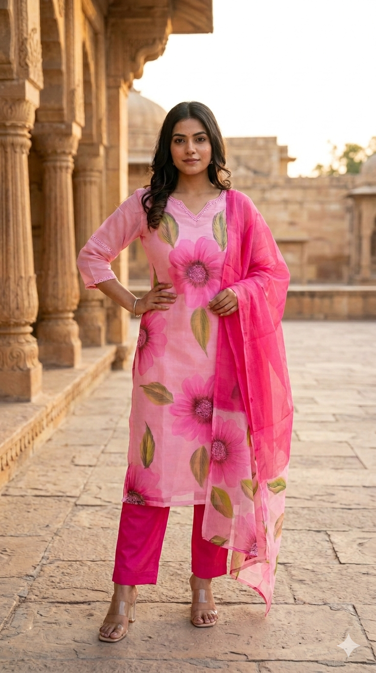 Elevate your ethnic wardrobe with this elegant Kota Doriya 3PC Set, a perfect blend of comfort and sophistication. Crafted from breathable Kota Doriya fabric, this set is ideal for summer gatherings, festive occasions, or even work wear. The fabric is known for its sheer texture and airy feel, keeping you cool and comfortable all day long.