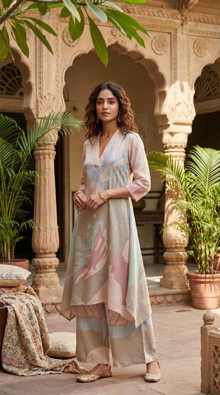 The asymmetric cut kurta adds a modern fashion element, giving the outfit a unique and stylish appearance. Its minimal design makes it suitable for daily wear, office wear, and casual outings.