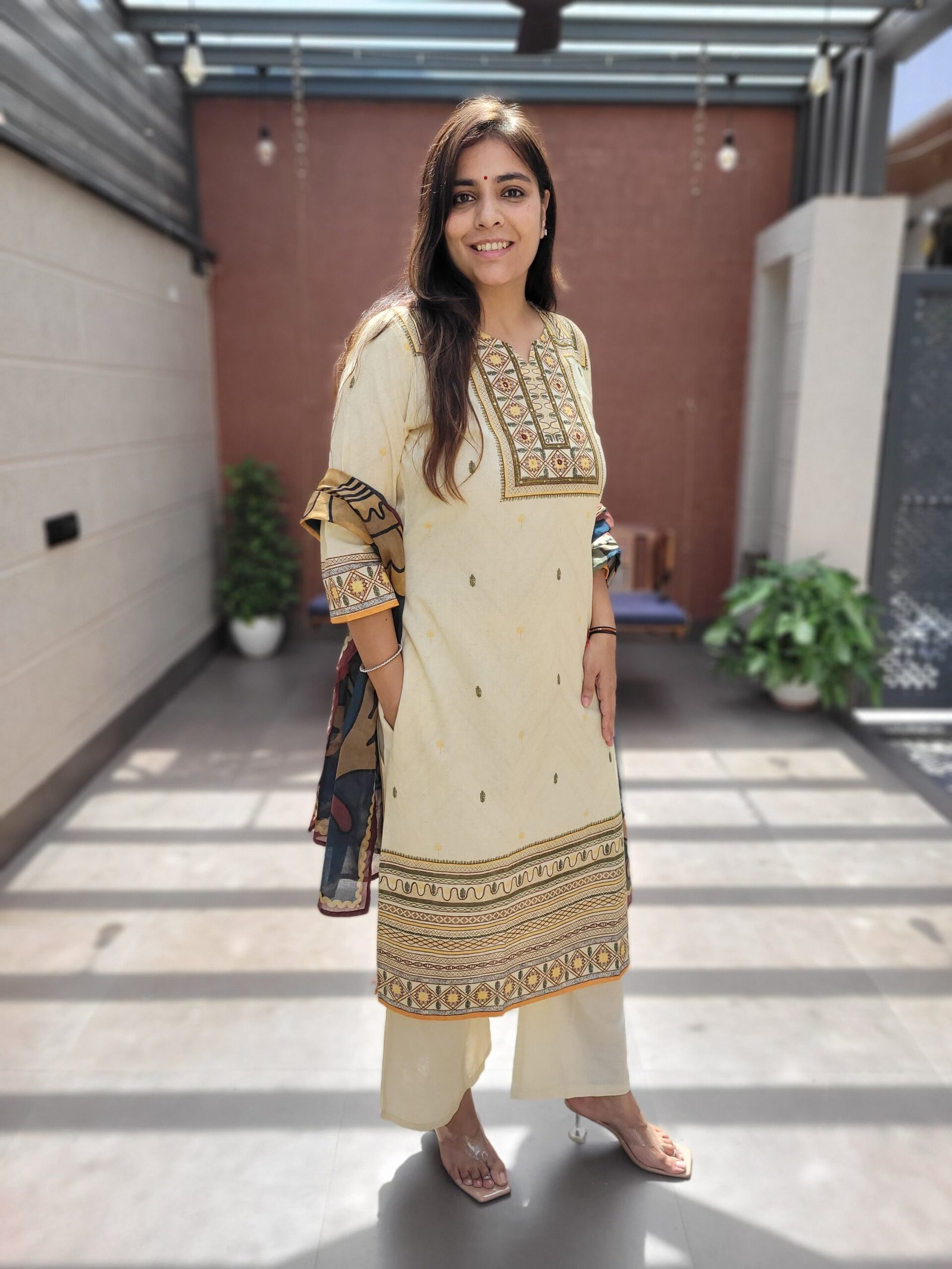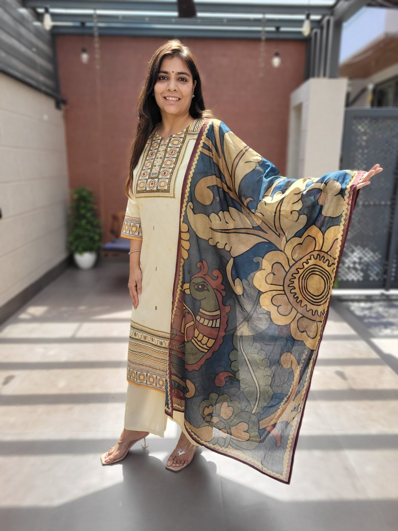 The kurta features delicate handwork detailing, enhancing its charm and craftsmanship, while the Kalamkari printed dupatta adds a classic touch of heritage and color. Perfect for festive gatherings, cultural events, or casual outings, this set brings grace and sophistication to your wardrobe.