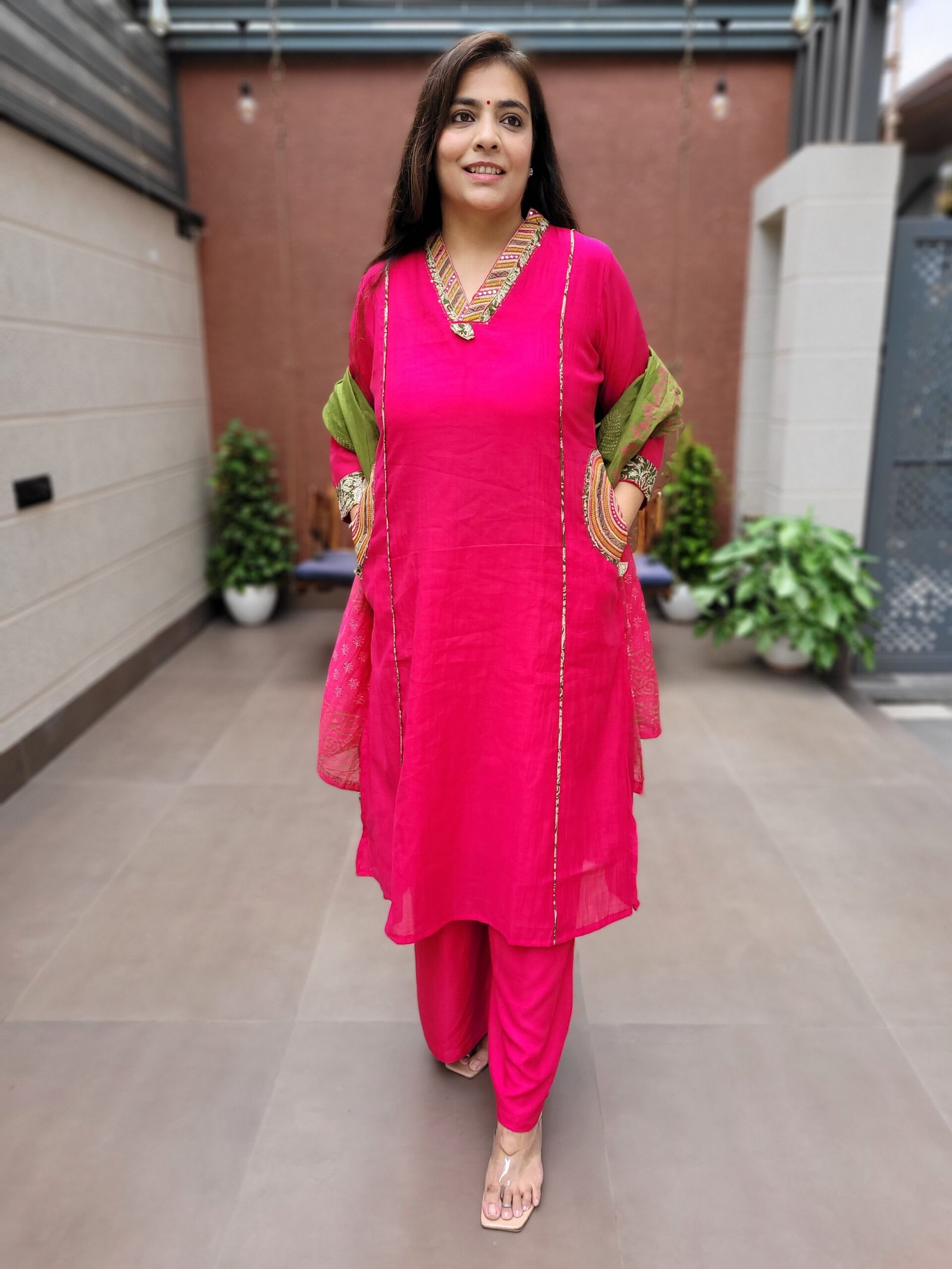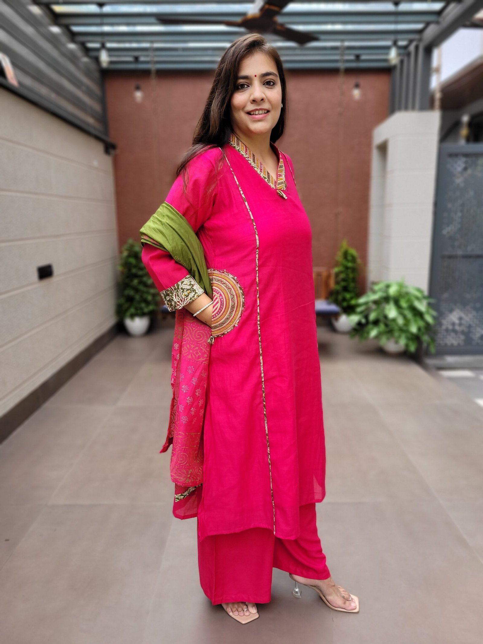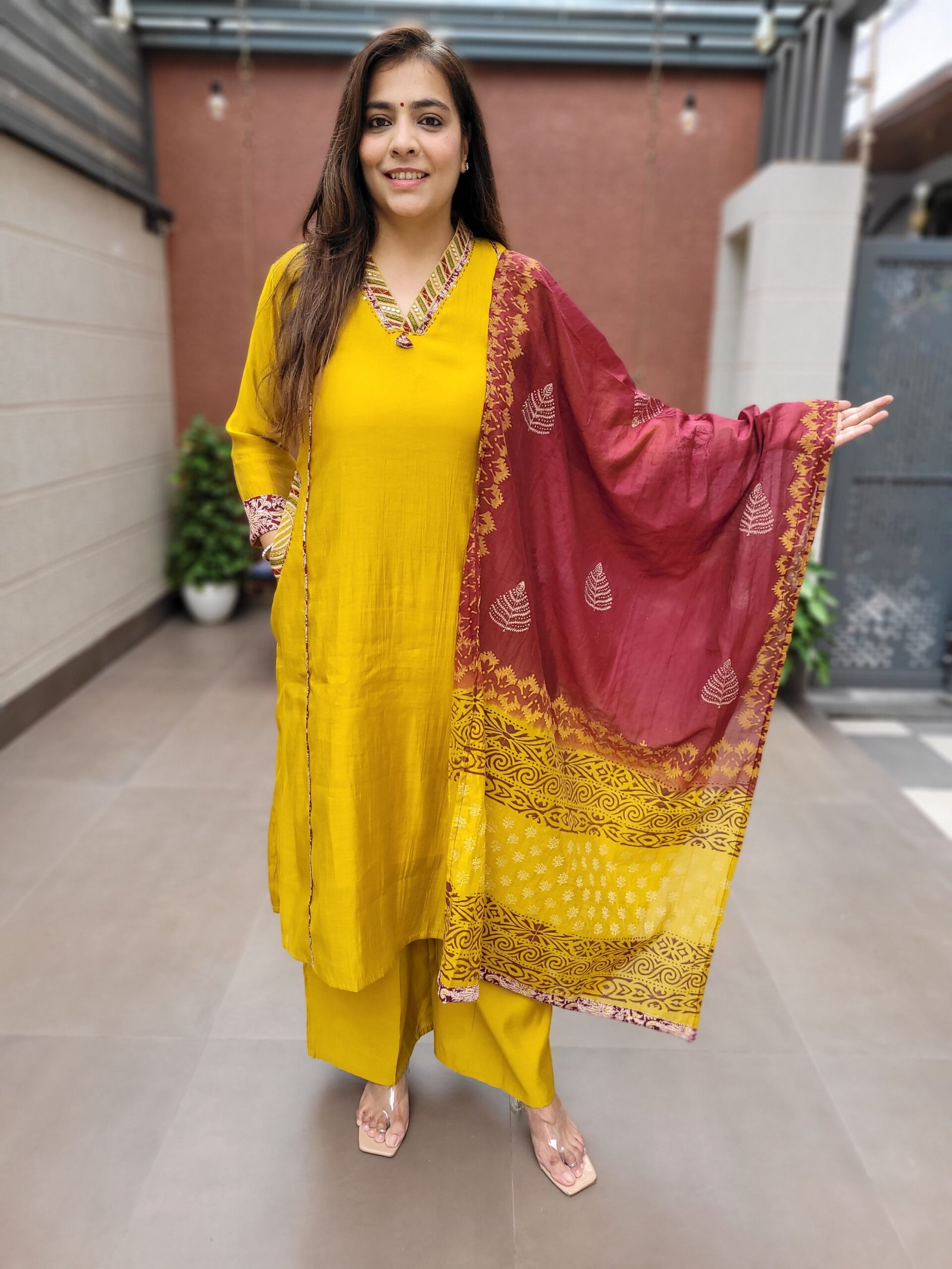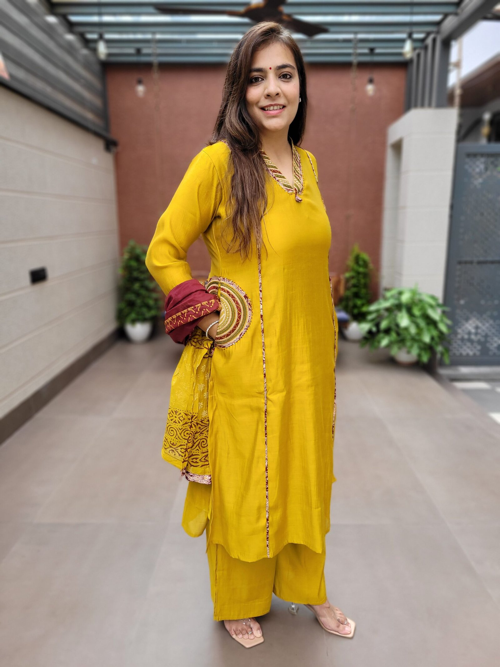 The DU-247 Mal Chanderi Suit Set is crafted from soft, breathable Mal Chanderi fabric, offering a luxurious feel and comfortable wear. The kurta features beautifully embroidered pockets and delicate handwork detailing, paired with a coordinated bottom and dupatta for a refined and elegant look.