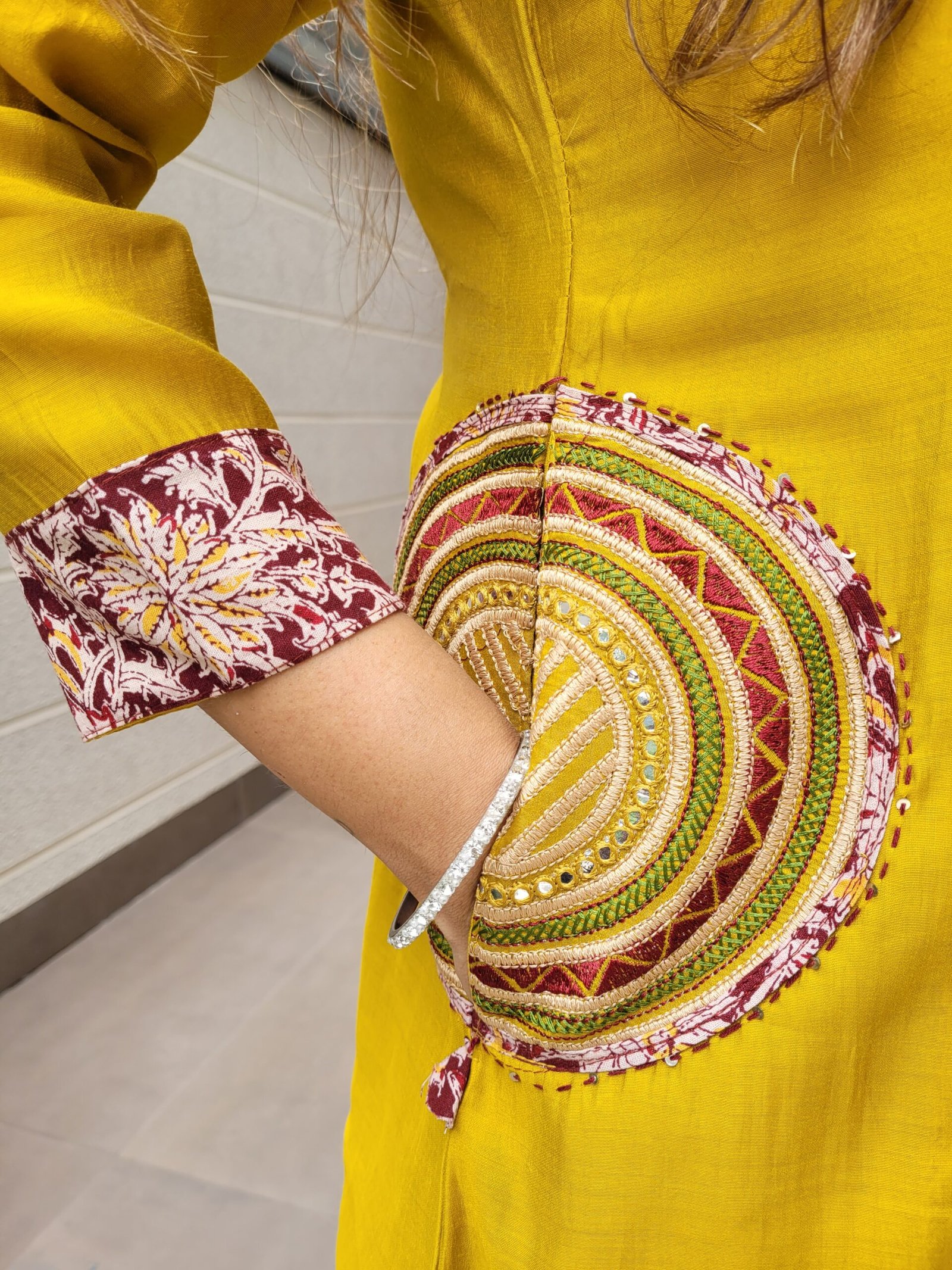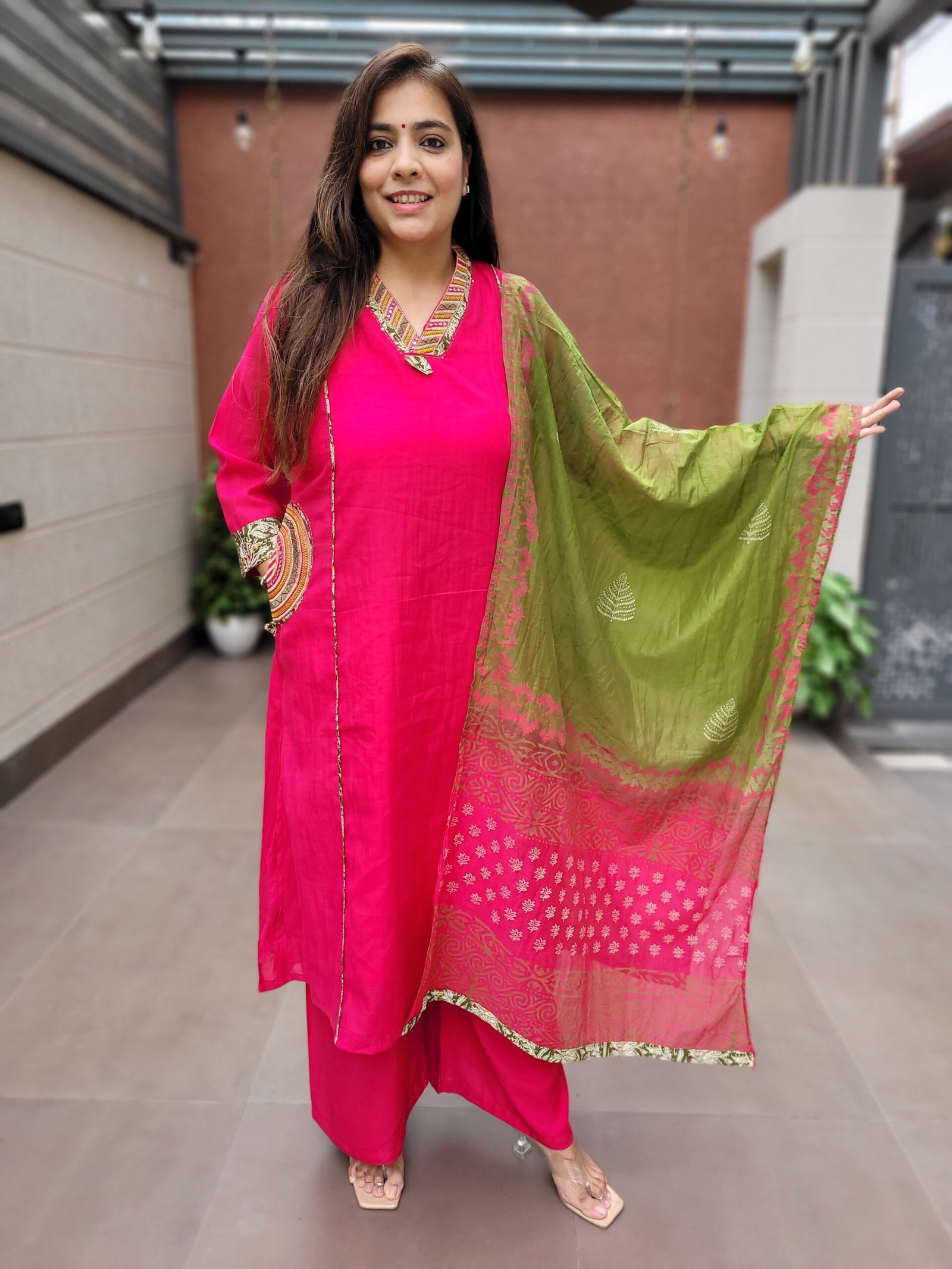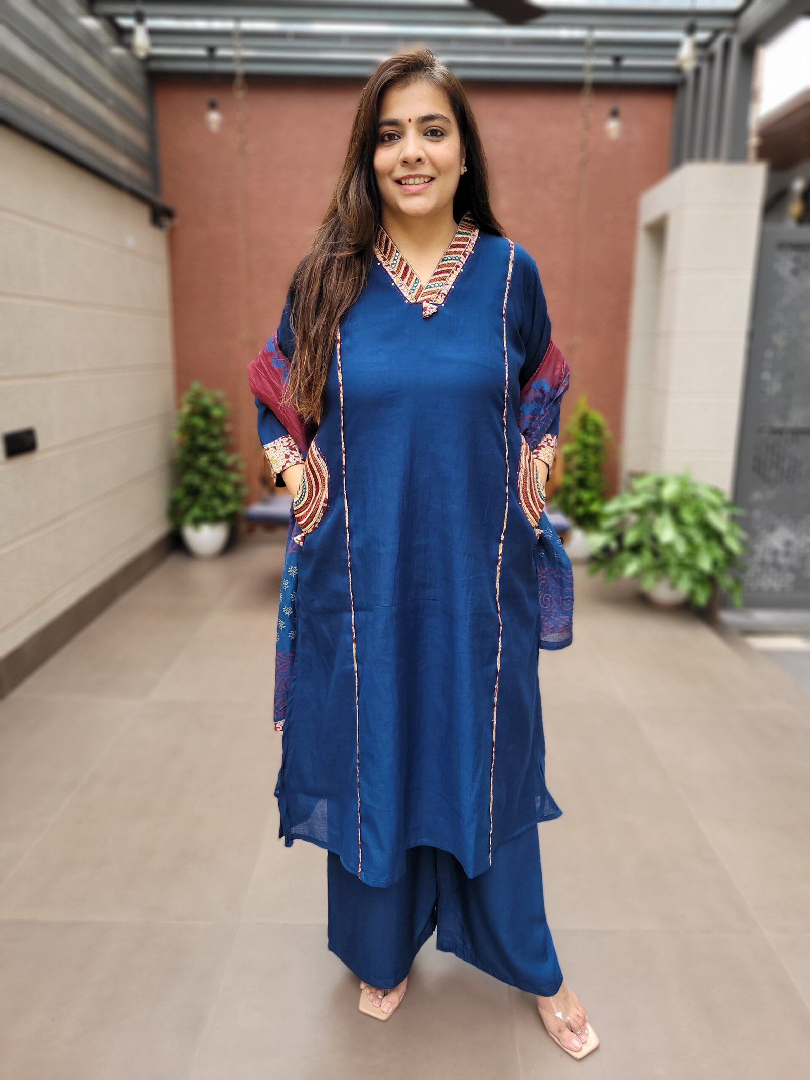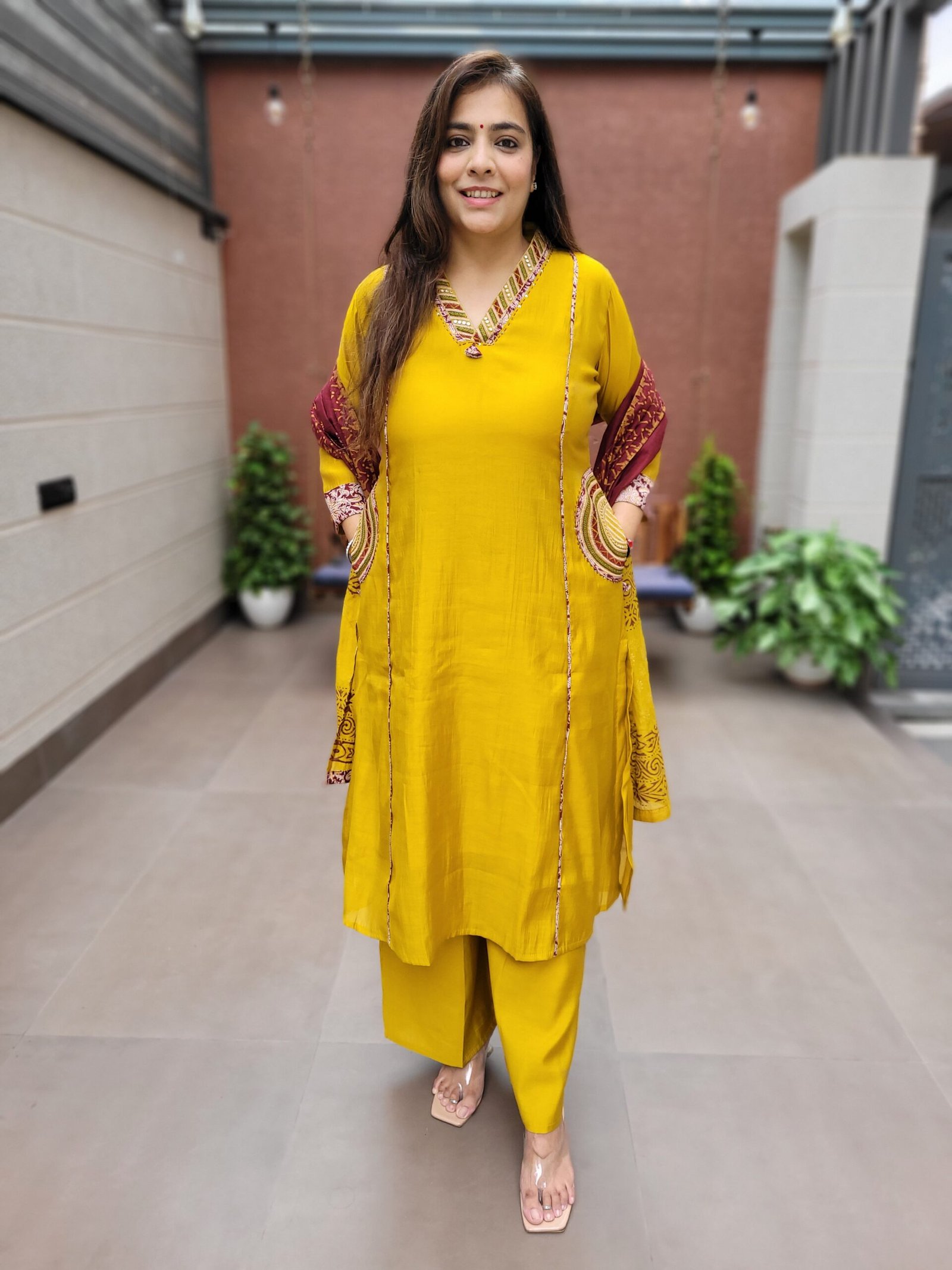 The DU-247 Mal Chanderi Suit Set is crafted from soft, breathable Mal Chanderi fabric, offering a luxurious feel and comfortable wear. The kurta features beautifully embroidered pockets and delicate handwork detailing, paired with a coordinated bottom and dupatta for a refined and elegant look.