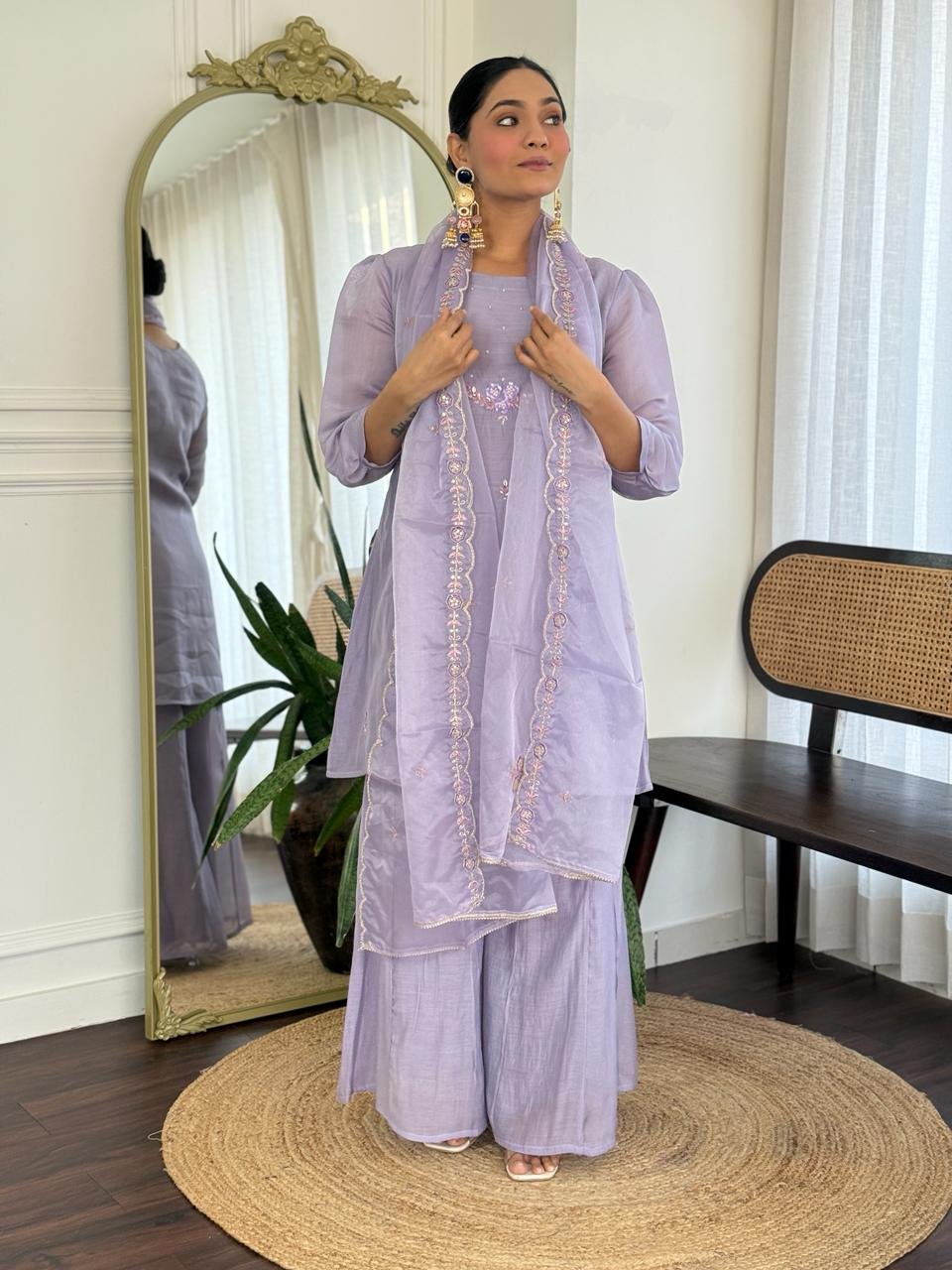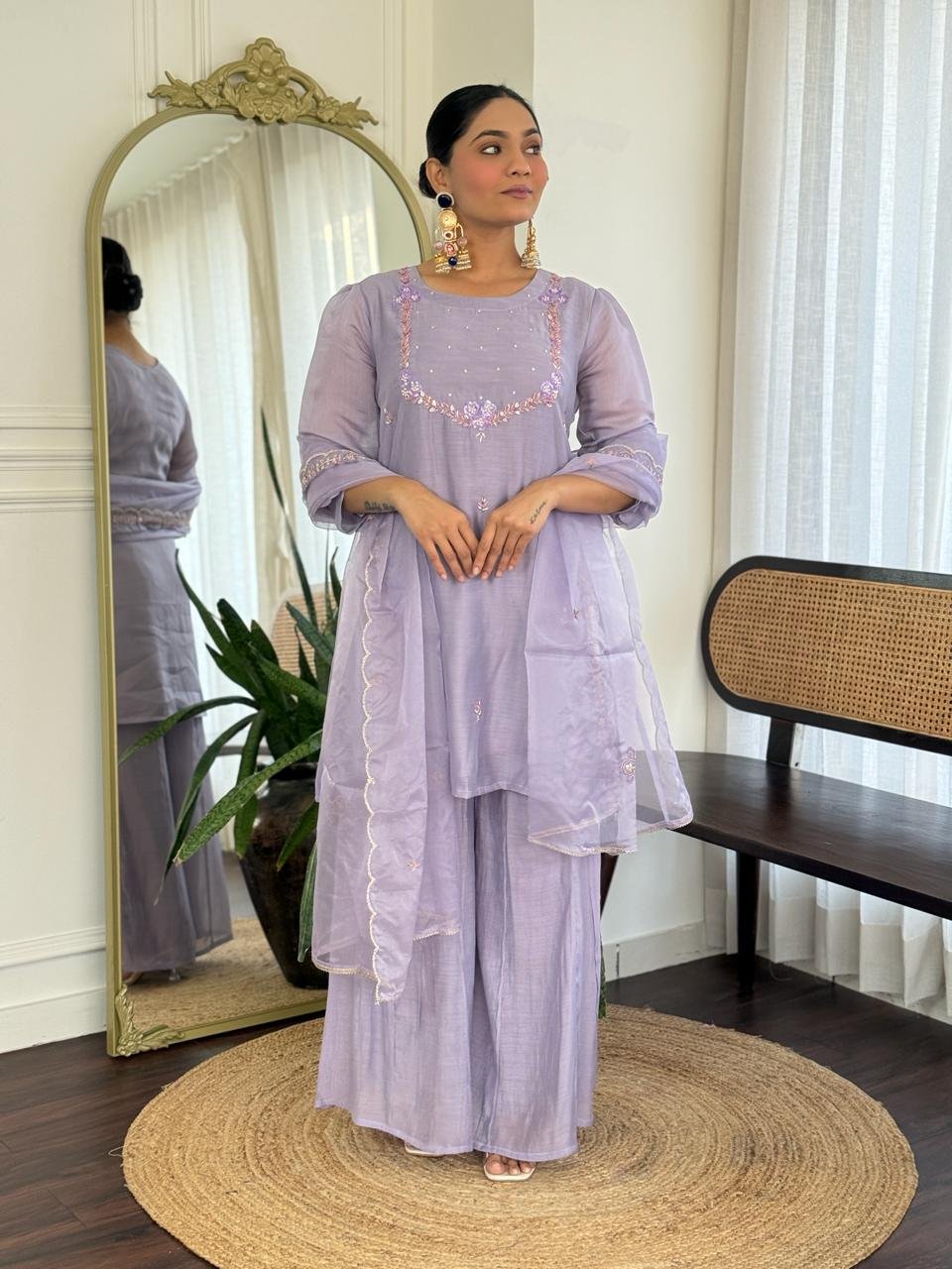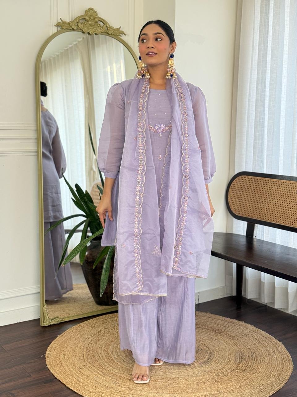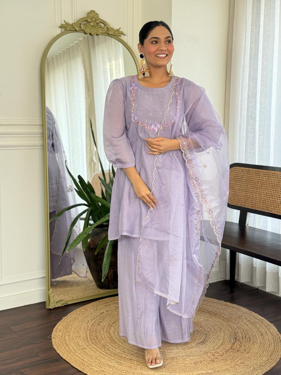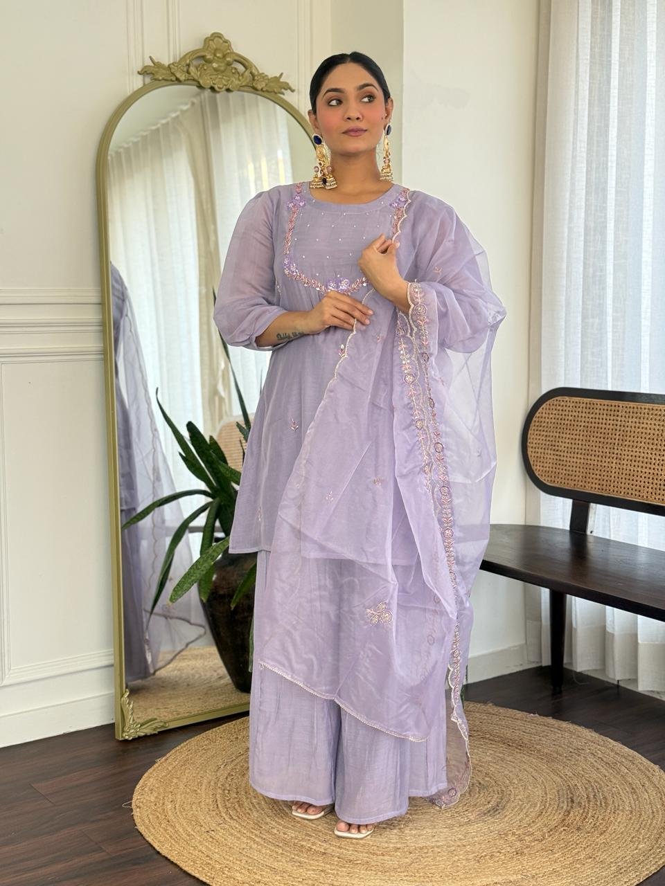 Paired with a Kali palazzo for graceful movement and a beautifully finished cutwork dupatta, this ensemble is perfect for celebrations, weddings, and special gatherings. Cotton lining in both top and bottom ensures lasting comfort.