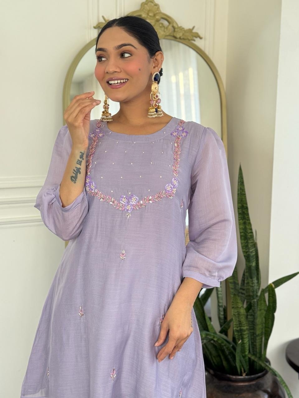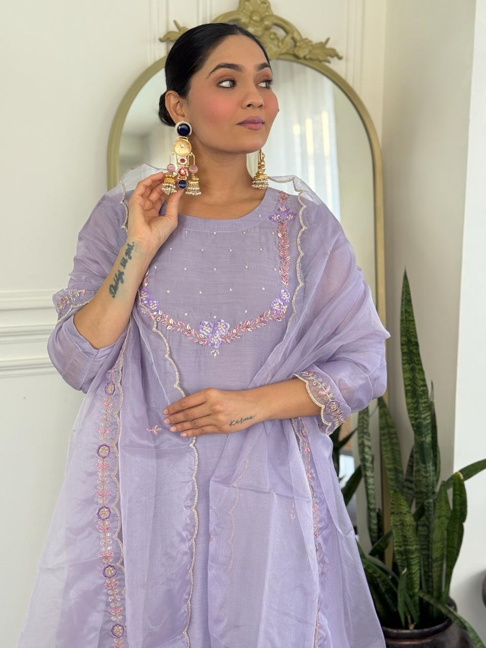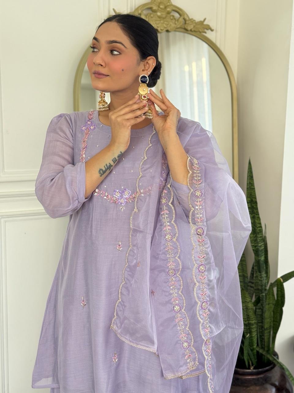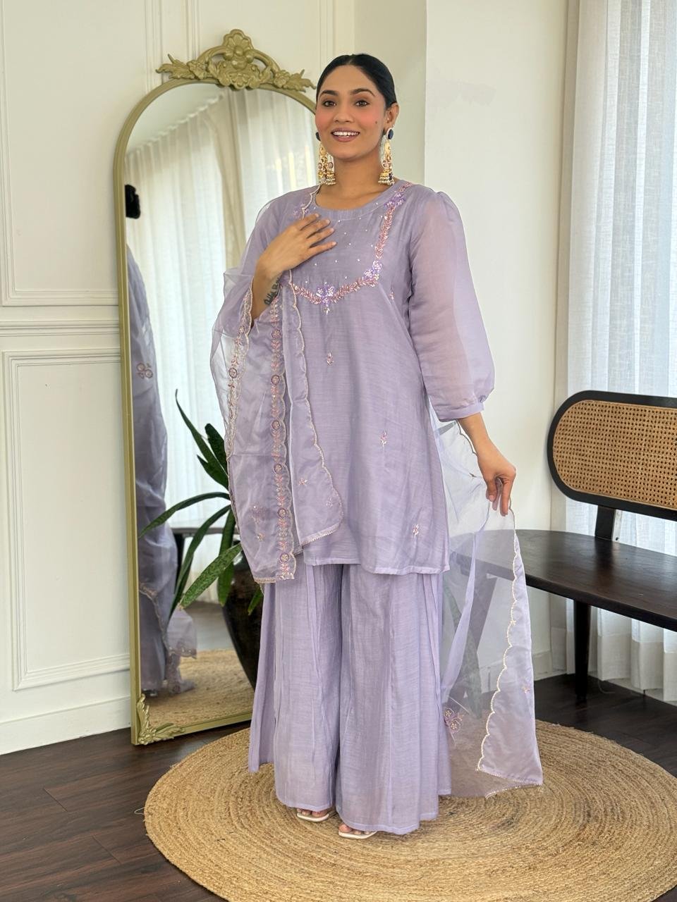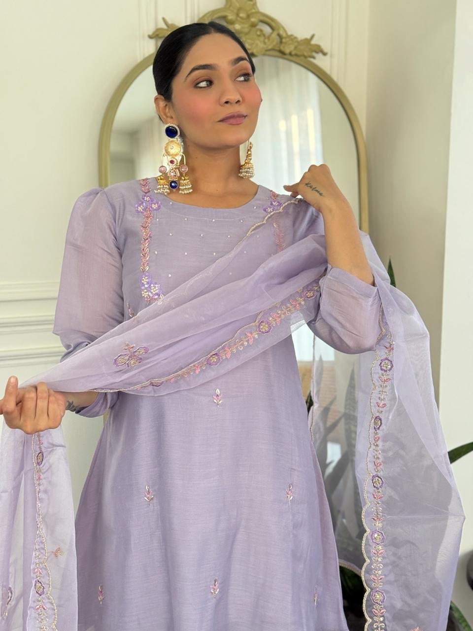 Paired with a Kali palazzo for graceful movement and a beautifully finished cutwork dupatta, this ensemble is perfect for celebrations, weddings, and special gatherings. Cotton lining in both top and bottom ensures lasting comfort.