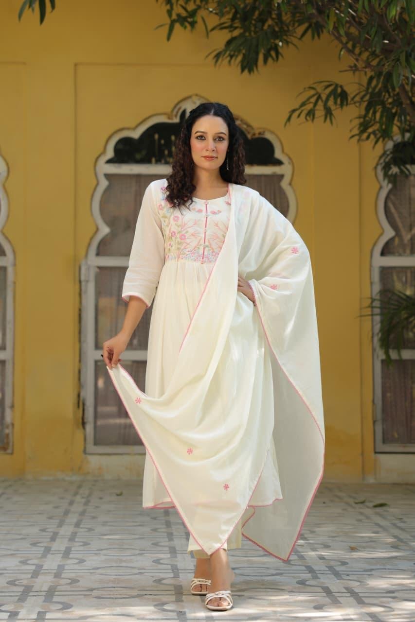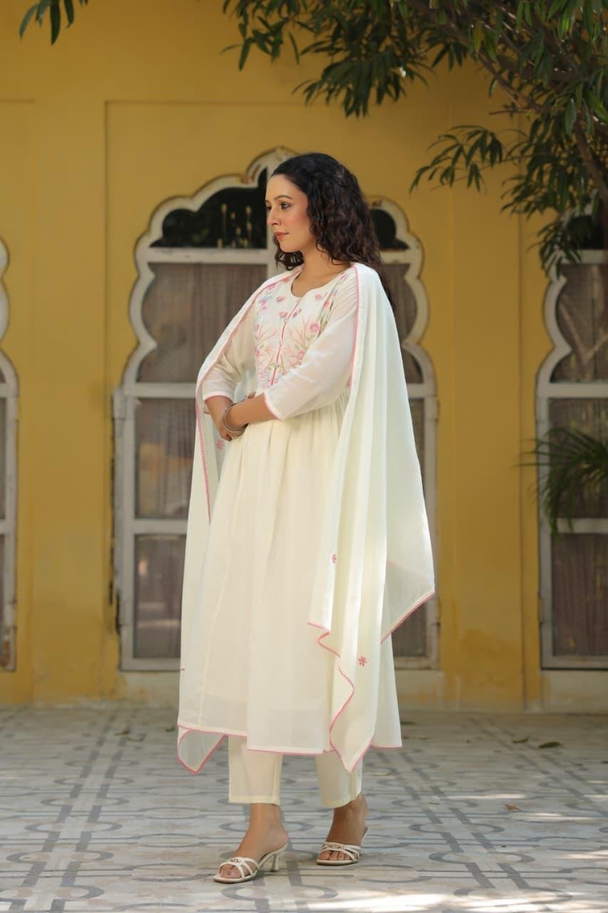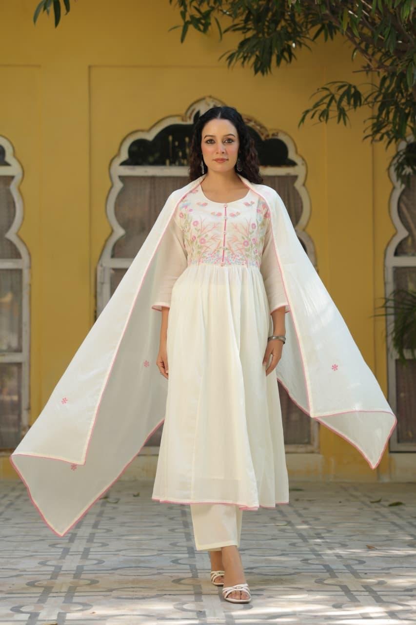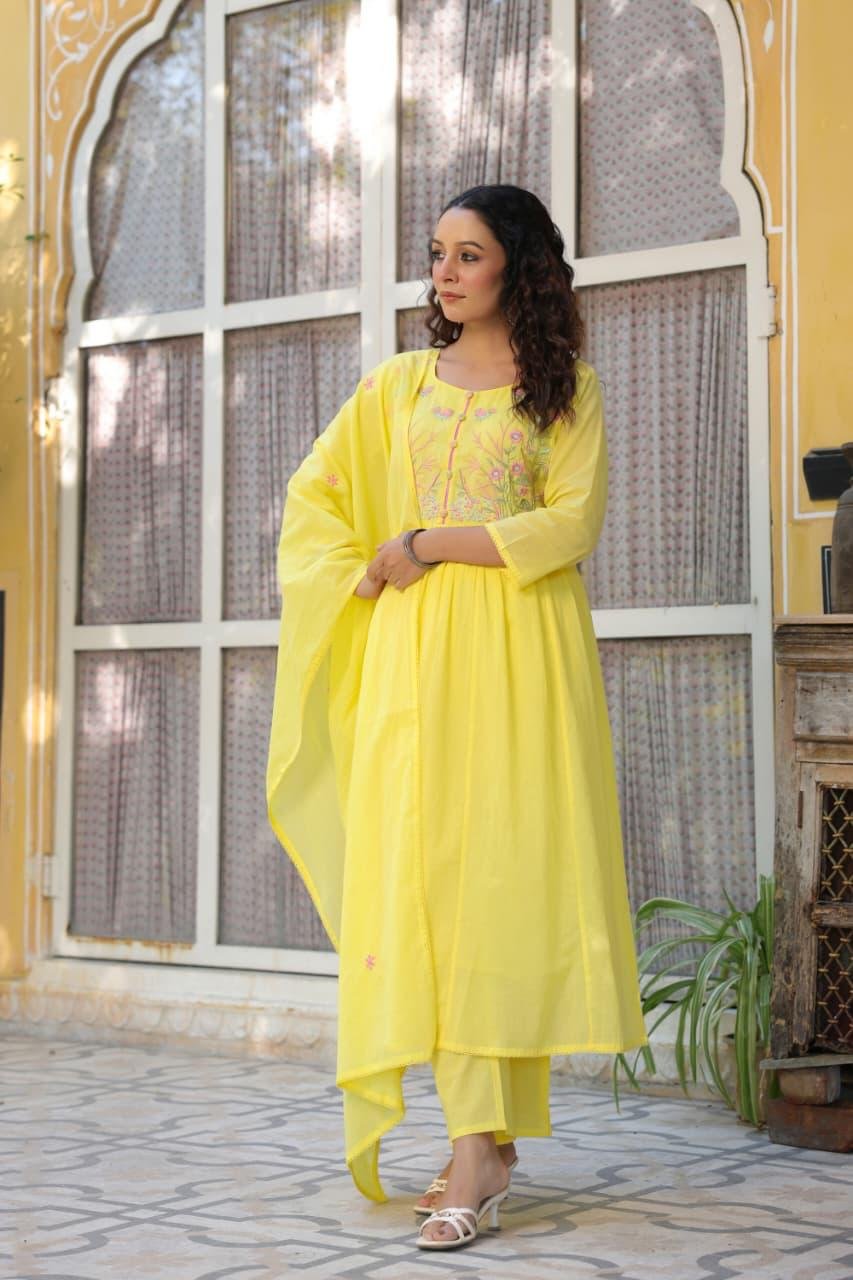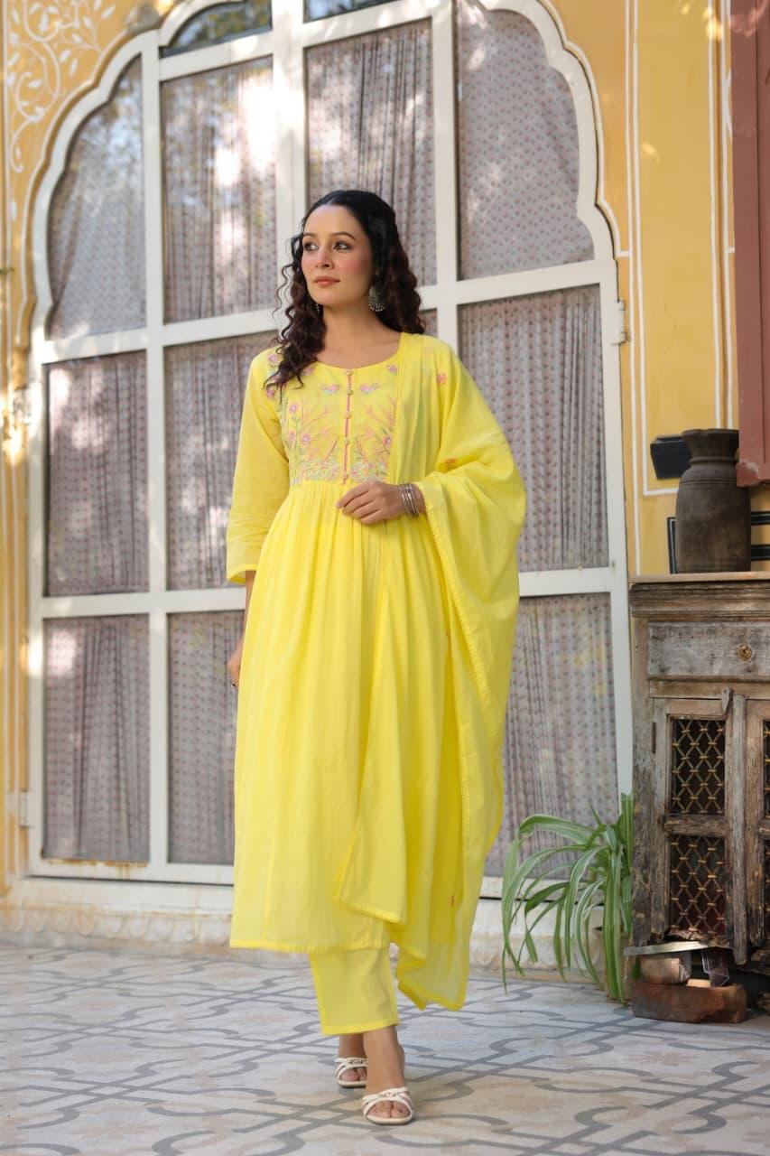 The kurta is enhanced with a delicately embroidered yoke, adding a refined touch to its simple silhouette. A cotton lining provides added comfort, while the embroidered dupatta completes the look with graceful detailing. This set is ideal for everyday ethnic wear, office use, and casual gatherings.
