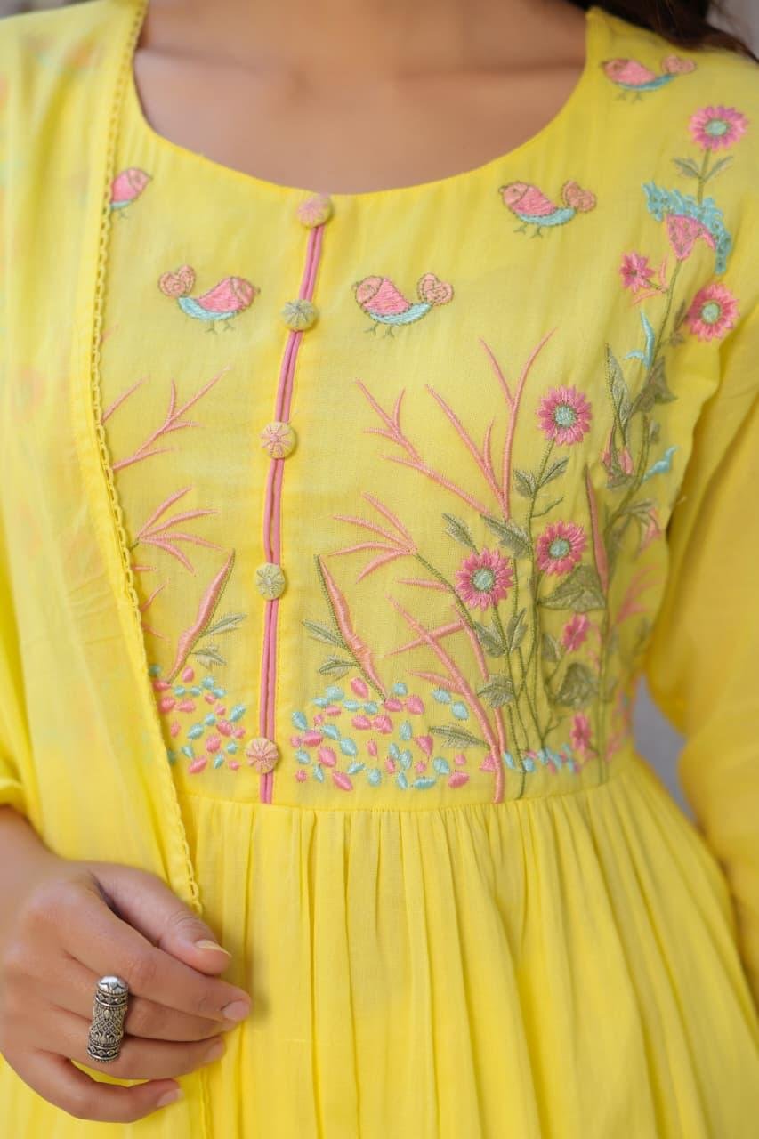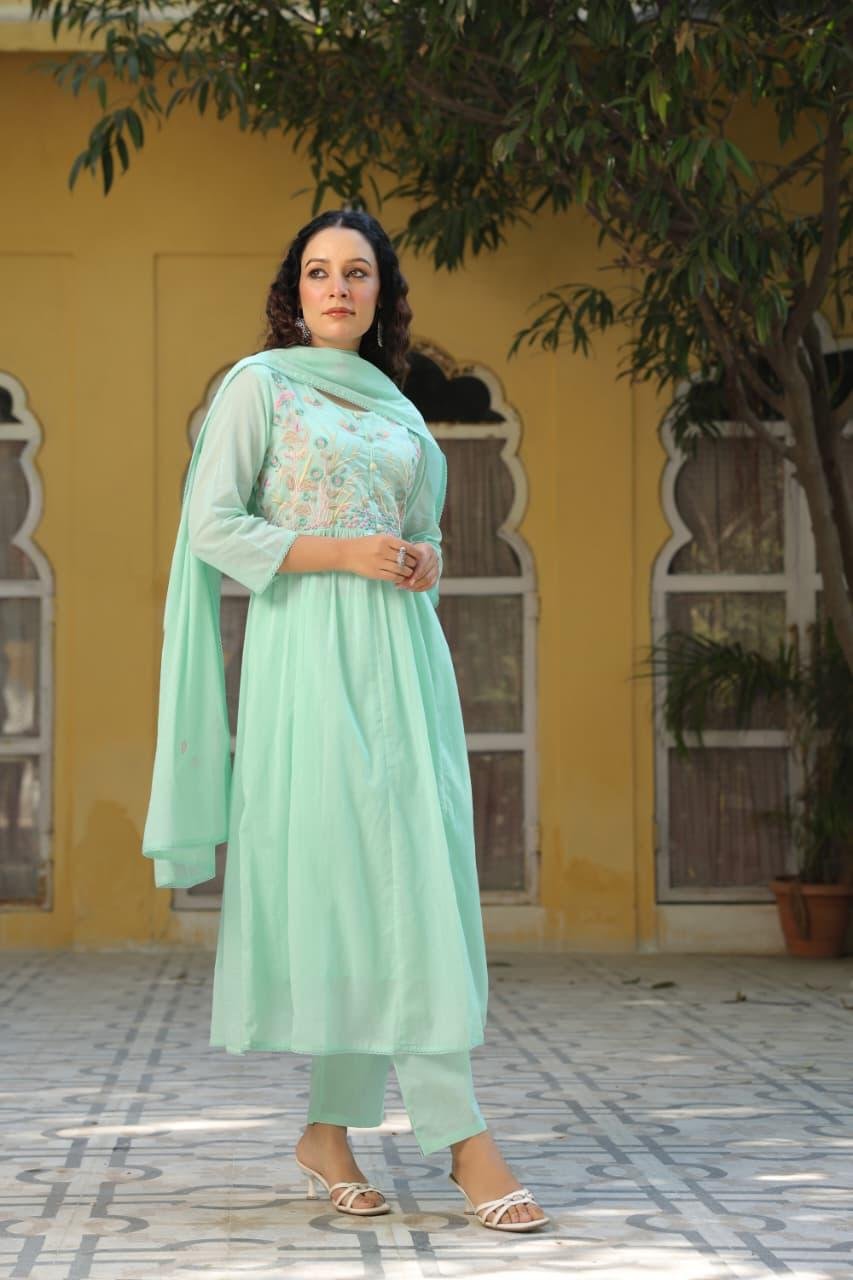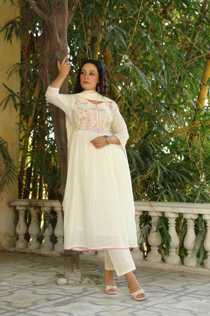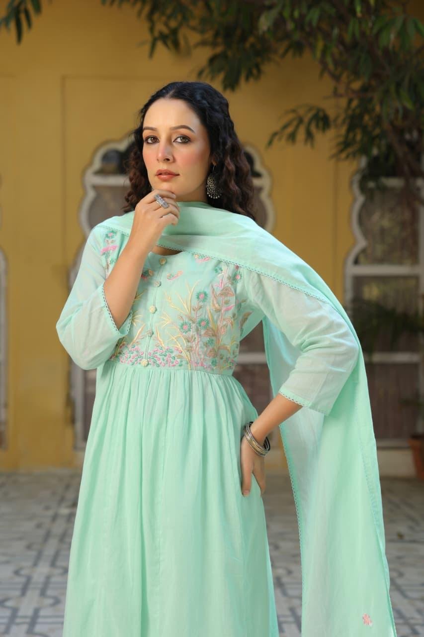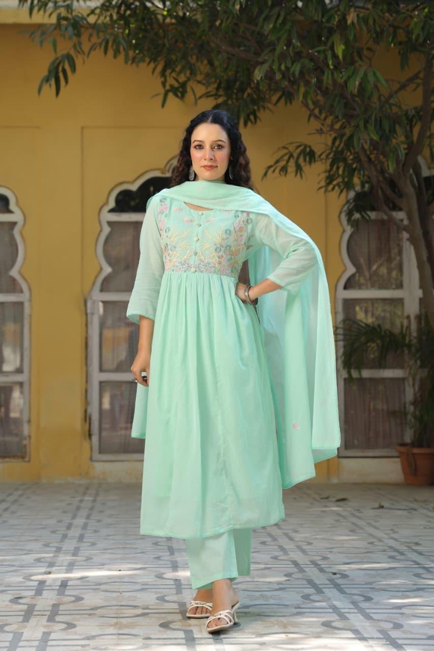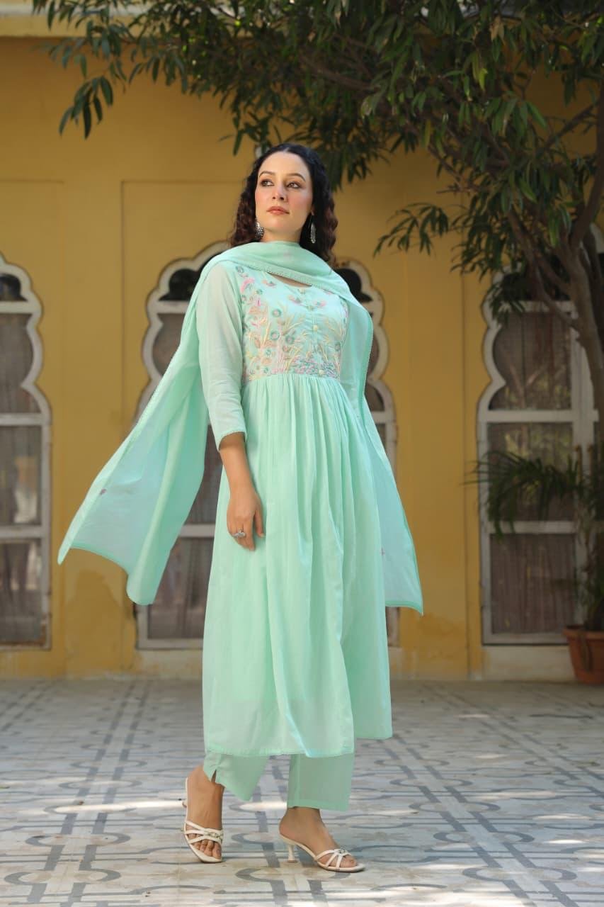 The kurta is enhanced with a delicately embroidered yoke, adding a refined touch to its simple silhouette. A cotton lining provides added comfort, while the embroidered dupatta completes the look with graceful detailing. This set is ideal for everyday ethnic wear, office use, and casual gatherings.