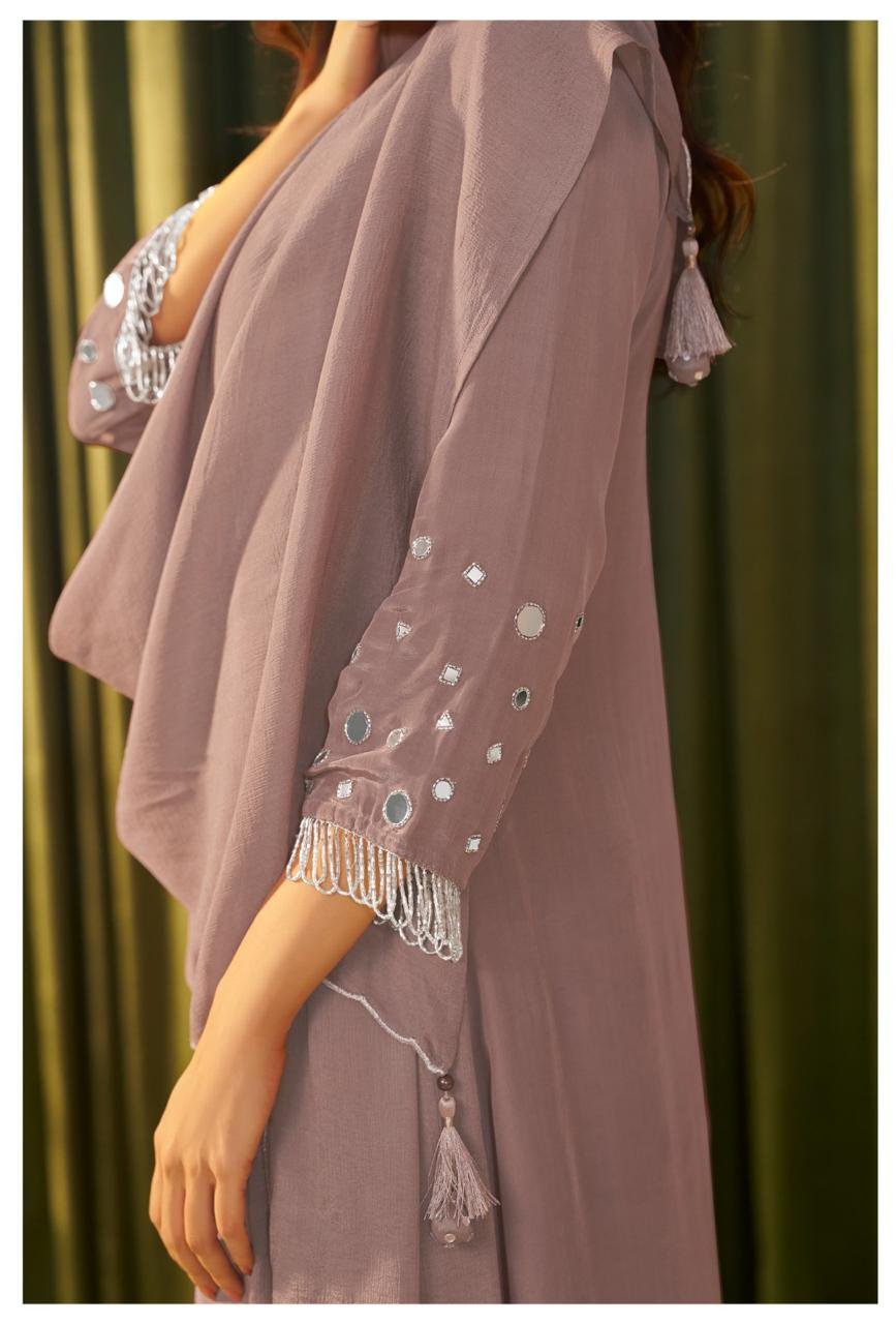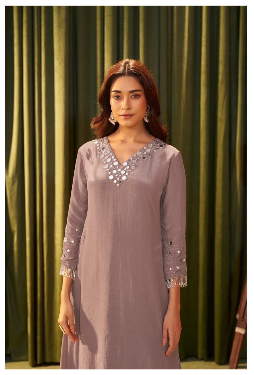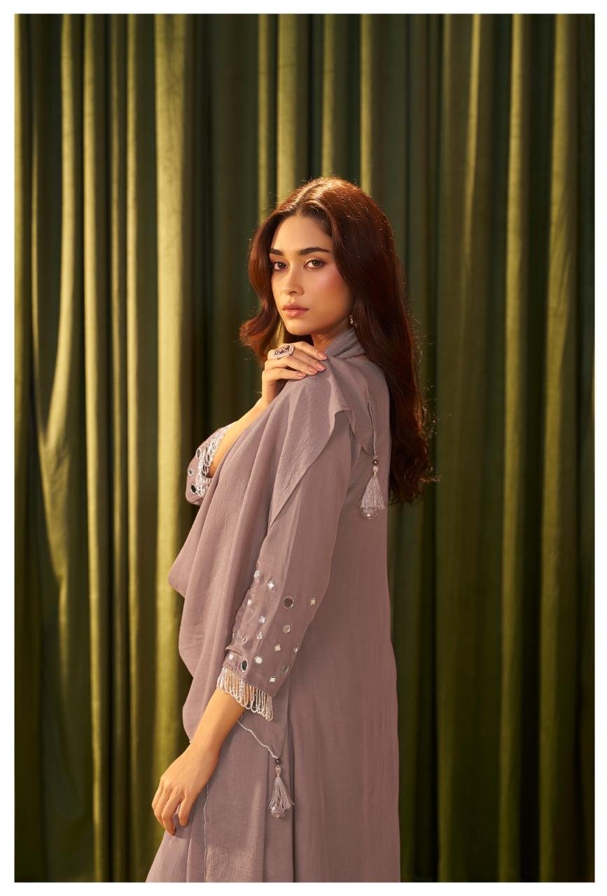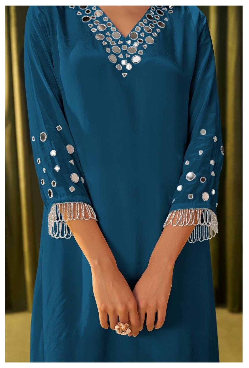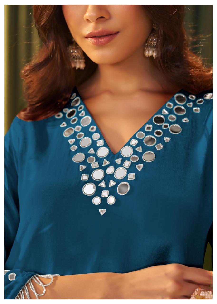 The DU-621 Mirror Work 3PC Set is crafted for understated festive elegance. Made from natural crepe fabric, it features authentic mirror work that adds a subtle sparkle.